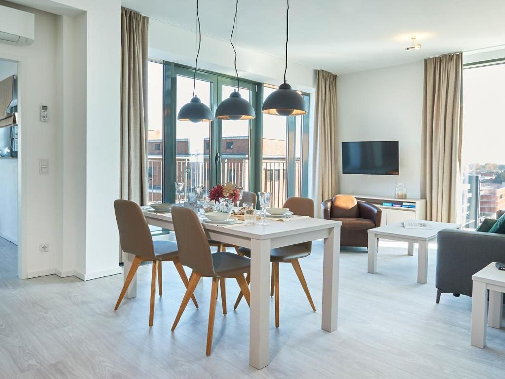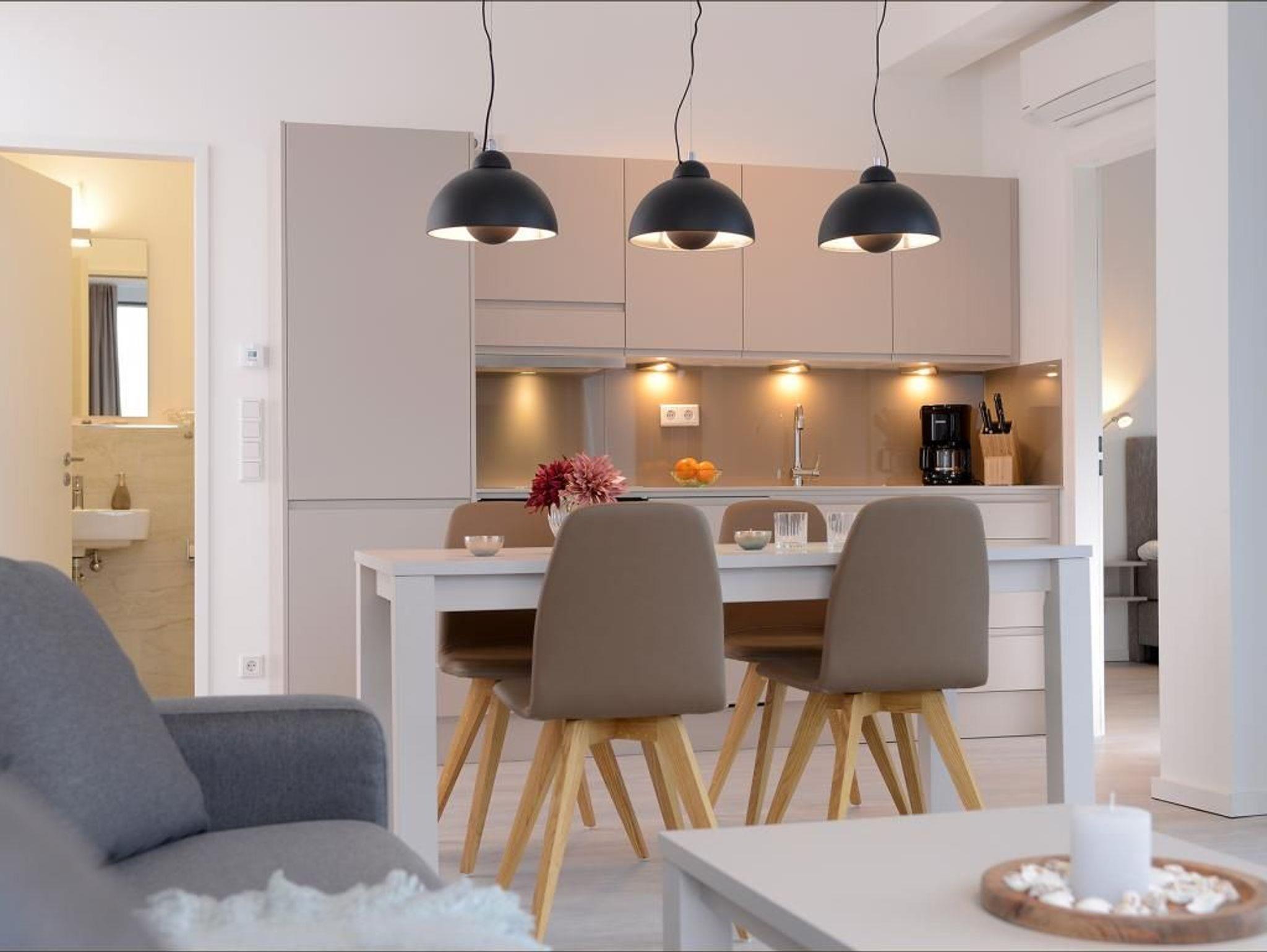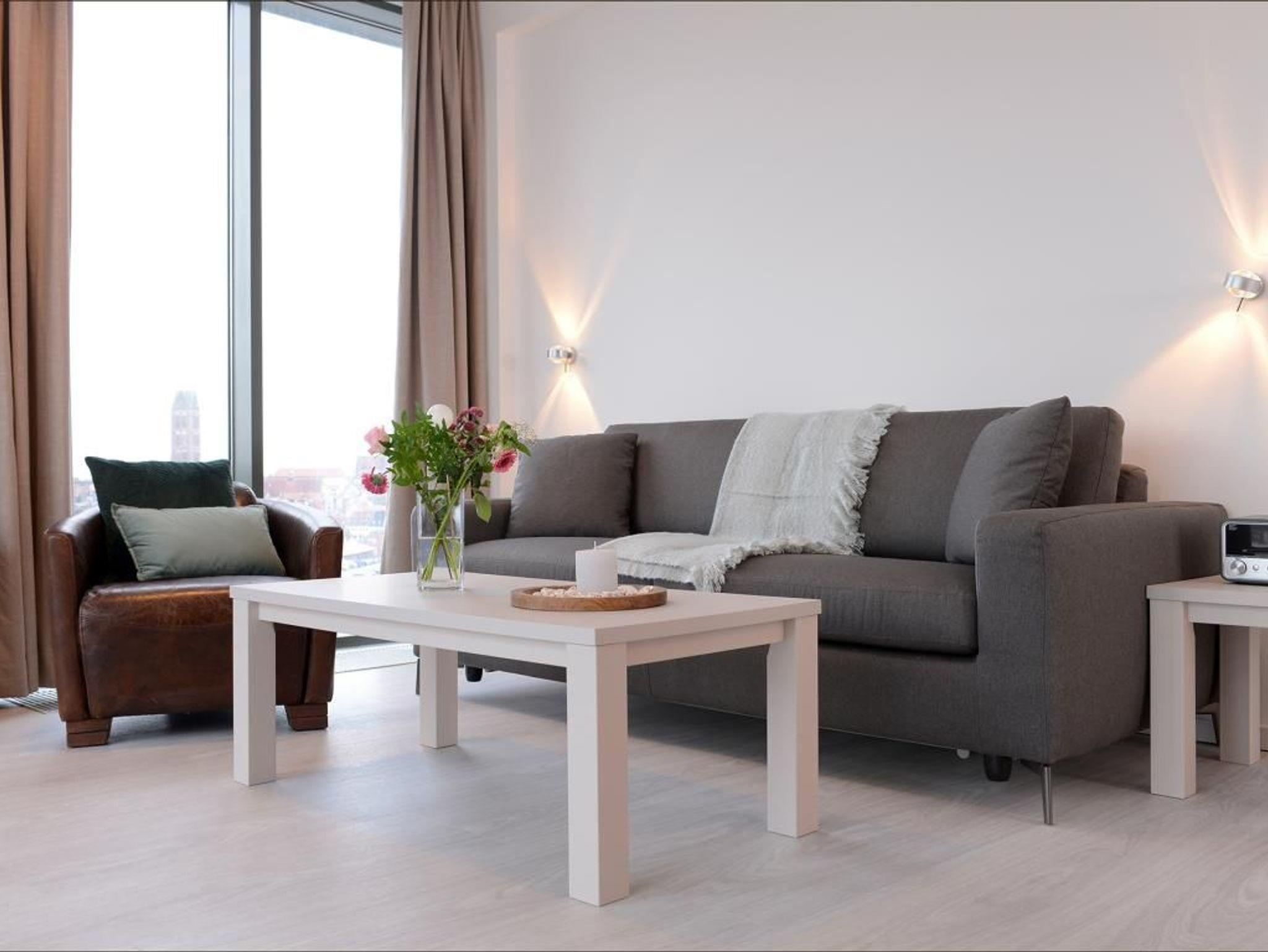Das exklusive 3-Zimmer-Appartement in der 7. Etage, verfügt über 94m² Wohnfläche und einer Terrasse mit spektakulärem Ausblick. Bis zu 6 Personen können hier einen traumhaften Urlaub verbringen. Das Wohn- / Esszimmer mit integrierter Küche ist sehr geschmackvoll mit einem Sofa, einer Essecke und einem TV- Gerät ausgestattet. Von dort haben Sie den Zugang zur Dachterrasse.