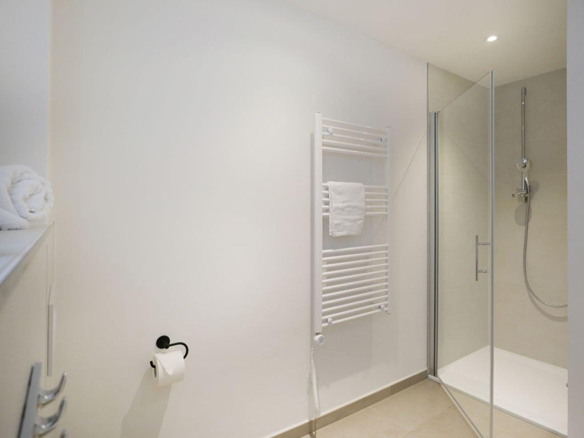 Die Fenster der Wohnräume bieten durch elektrisch bedienbare Außenrollos sommerlichen Wärmeschutz. Zugehörig ist selbstverständlich ein modernes Badezimmer mit ebenerdiger Dusche, Waschtisch, WC, Handtuchheizkörper und Fußbodenheizung. Bei Ihrer Ankunft sind die Betten für 2 Personen bereits bezogen und Hand/Duschtücher liegen ebenfalls als inklusive Leistung für 2 Personen bereit. Weitere Wäschepakete sind gegen Gebühr zu buchbar.