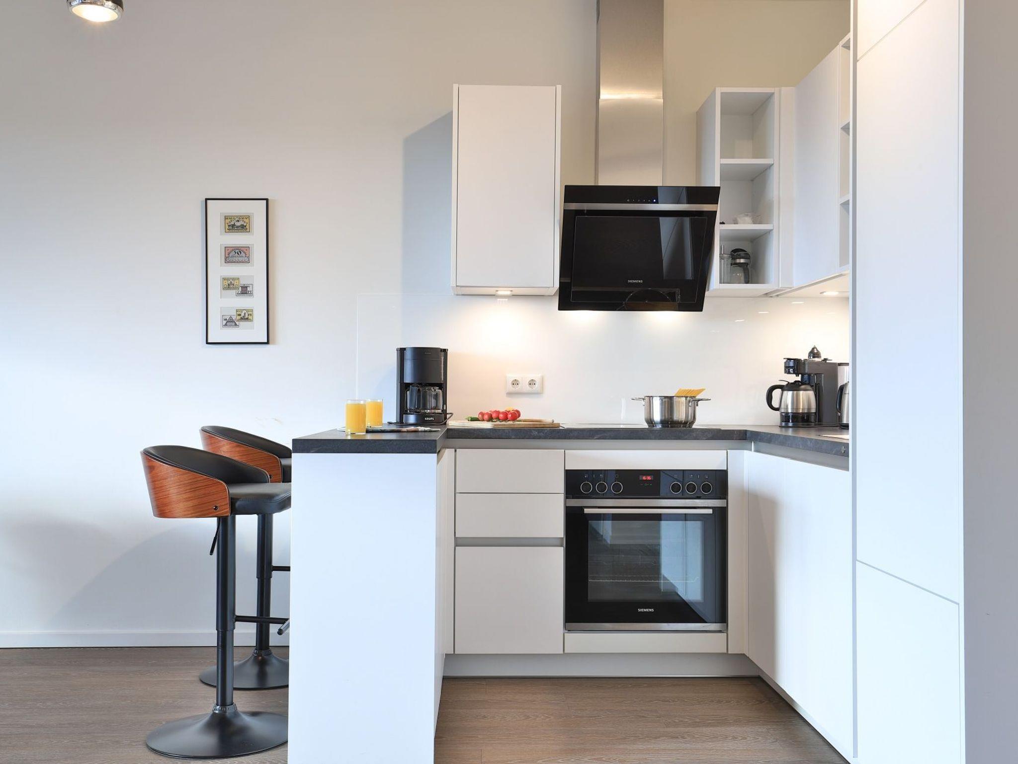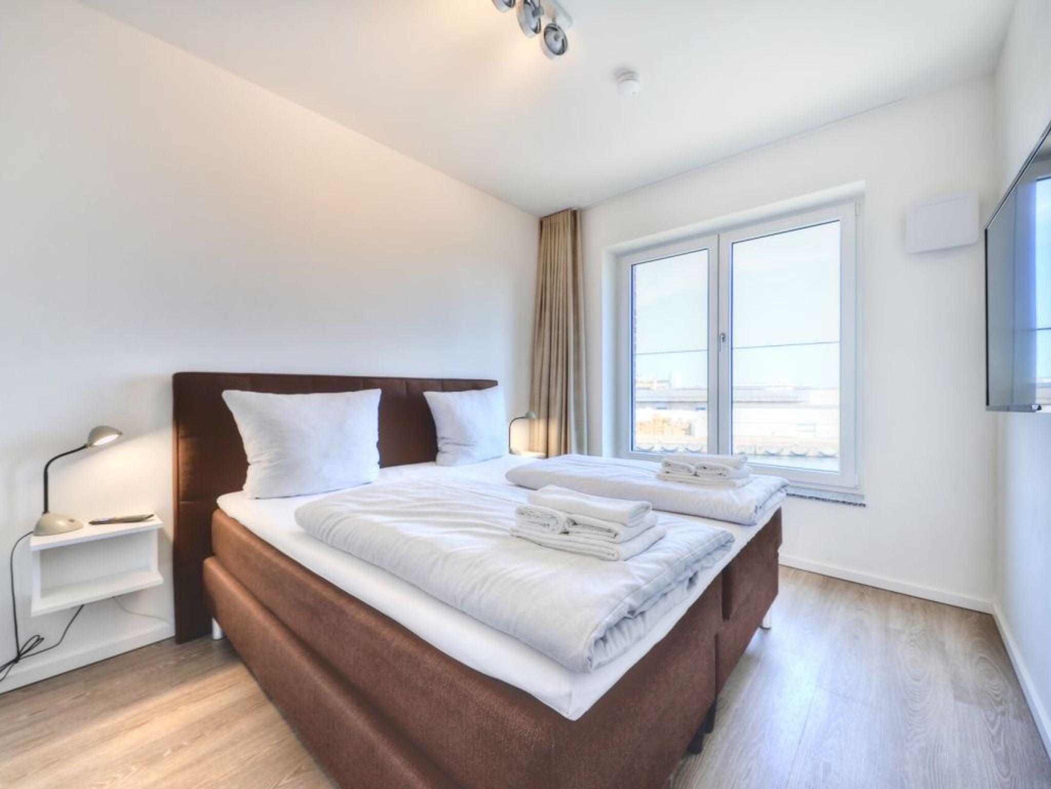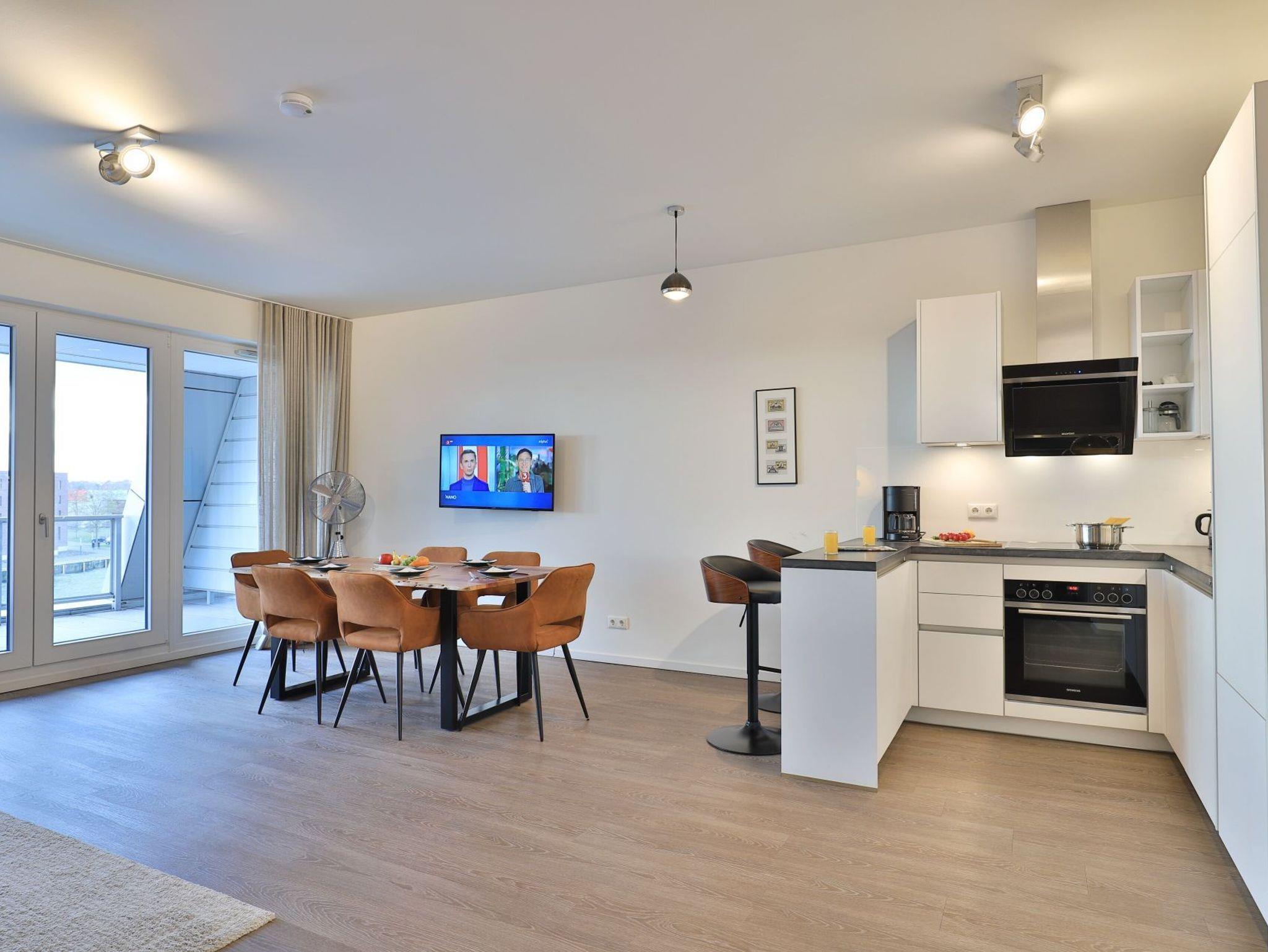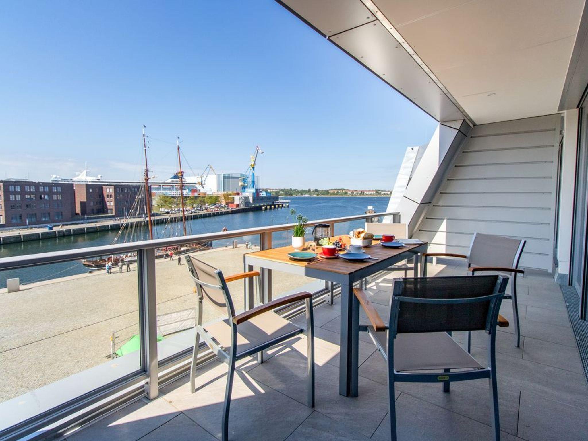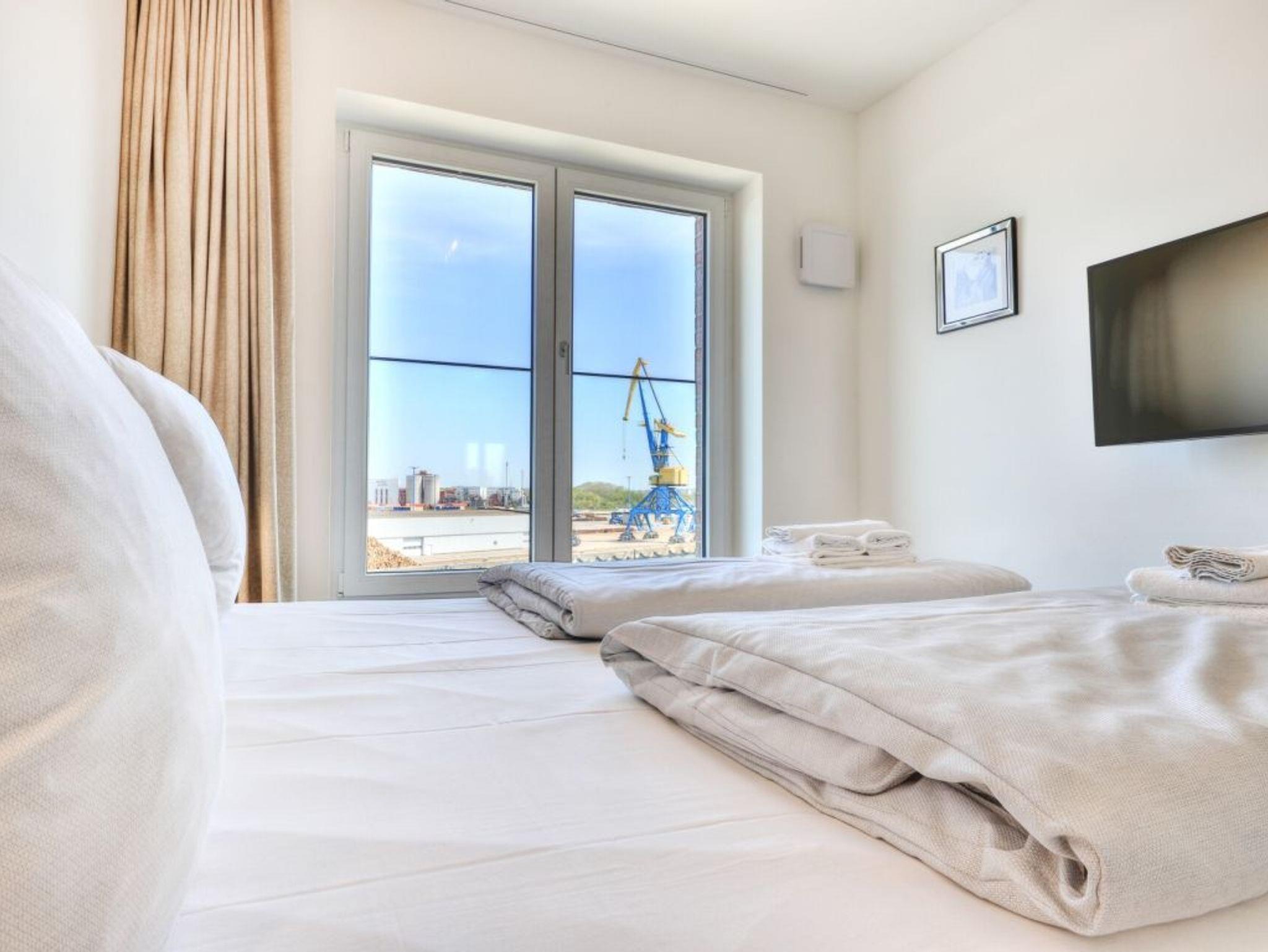 Sie betreten die Wohnung im 3. Obergeschoss des Gebäudes und gelangen über eine separate, in der Wohnung liegende Treppe, den schick möblierten Wohn/-Essbereich mit Esstisch sowie integrierter und voll ausgestatteter Wohnküche. Vom gemütlichen Wohnbereich mit Internetradio, Flachbild Fernseher mit Hotelmodus und kostenfreiem WLAN, gelangen Sie auf die Loggia in südwestliche Richtung. Von hier genießen Sie einen schönen Blick auf den Hafen. Das lichtdurchflutete Appartement verfügt zudem über zwei geräumige Schlafzimmer mit bodentiefen Fenstern.