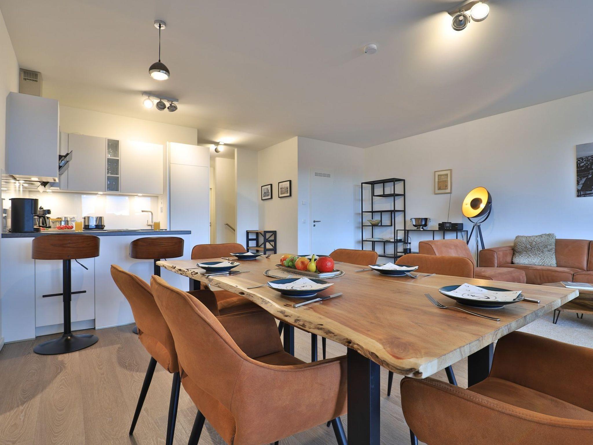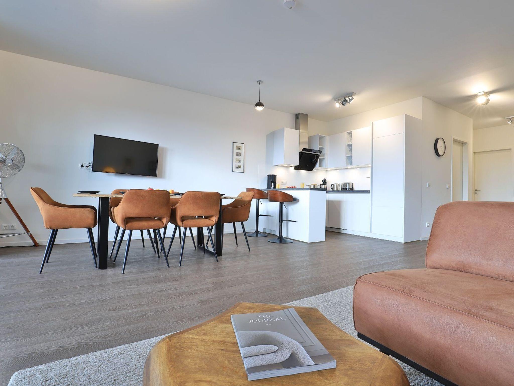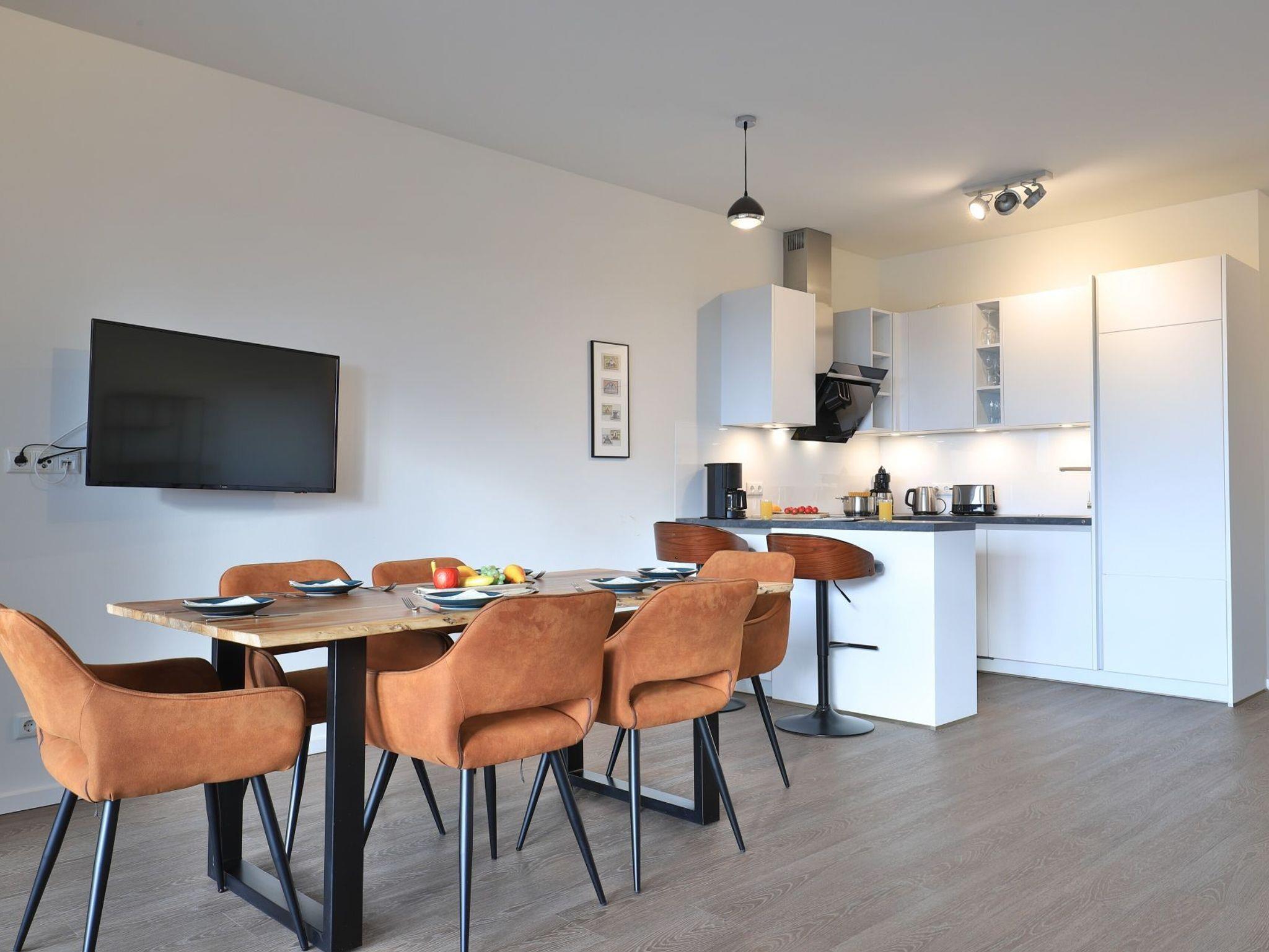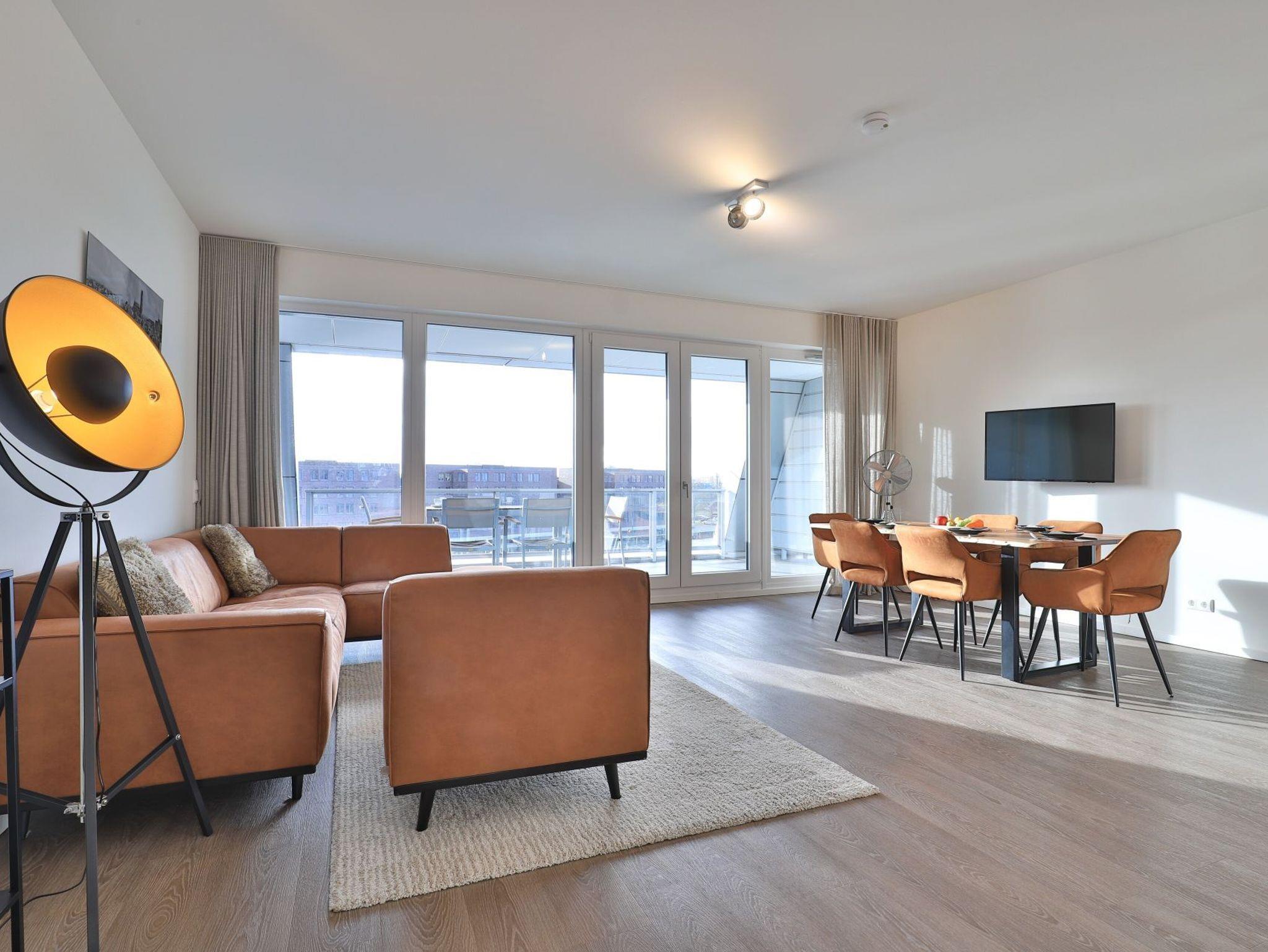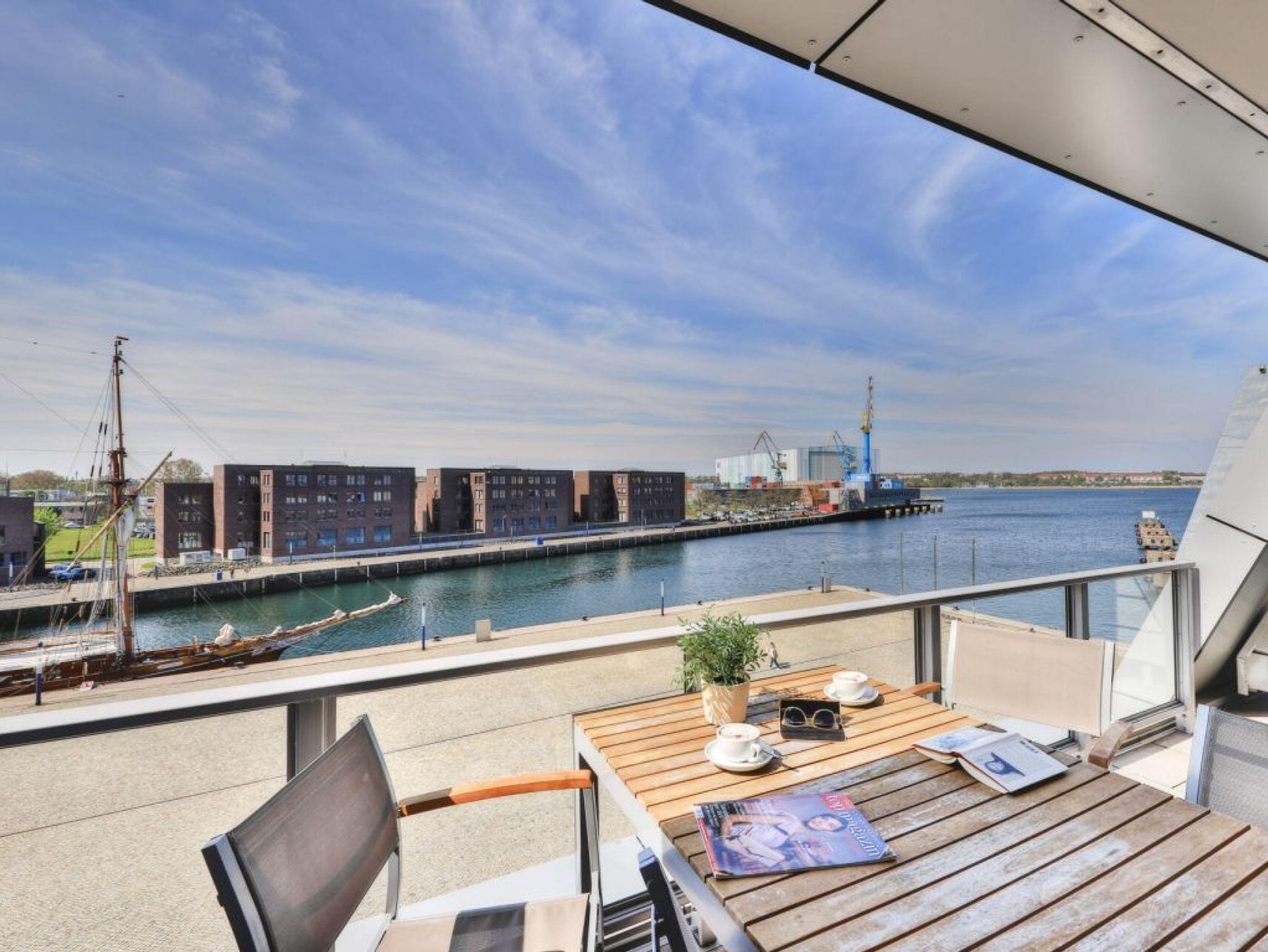Sie betreten die Wohnung im 3. Obergeschoss des Gebäudes und gelangen über eine separate, in der Wohnung liegende Treppe, den schick möblierten Wohn/-Essbereich mit Esstisch sowie integrierter und voll ausgestatteter Wohnküche. Vom gemütlichen Wohnbereich mit Internetradio, Flachbild Fernseher mit Hotelmodus und kostenfreiem WLAN, gelangen Sie auf die Loggia in südwestliche Richtung. Von hier genießen Sie einen schönen Blick auf den Hafen. Das lichtdurchflutete Appartement verfügt zudem über zwei geräumige Schlafzimmer mit bodentiefen Fenstern.