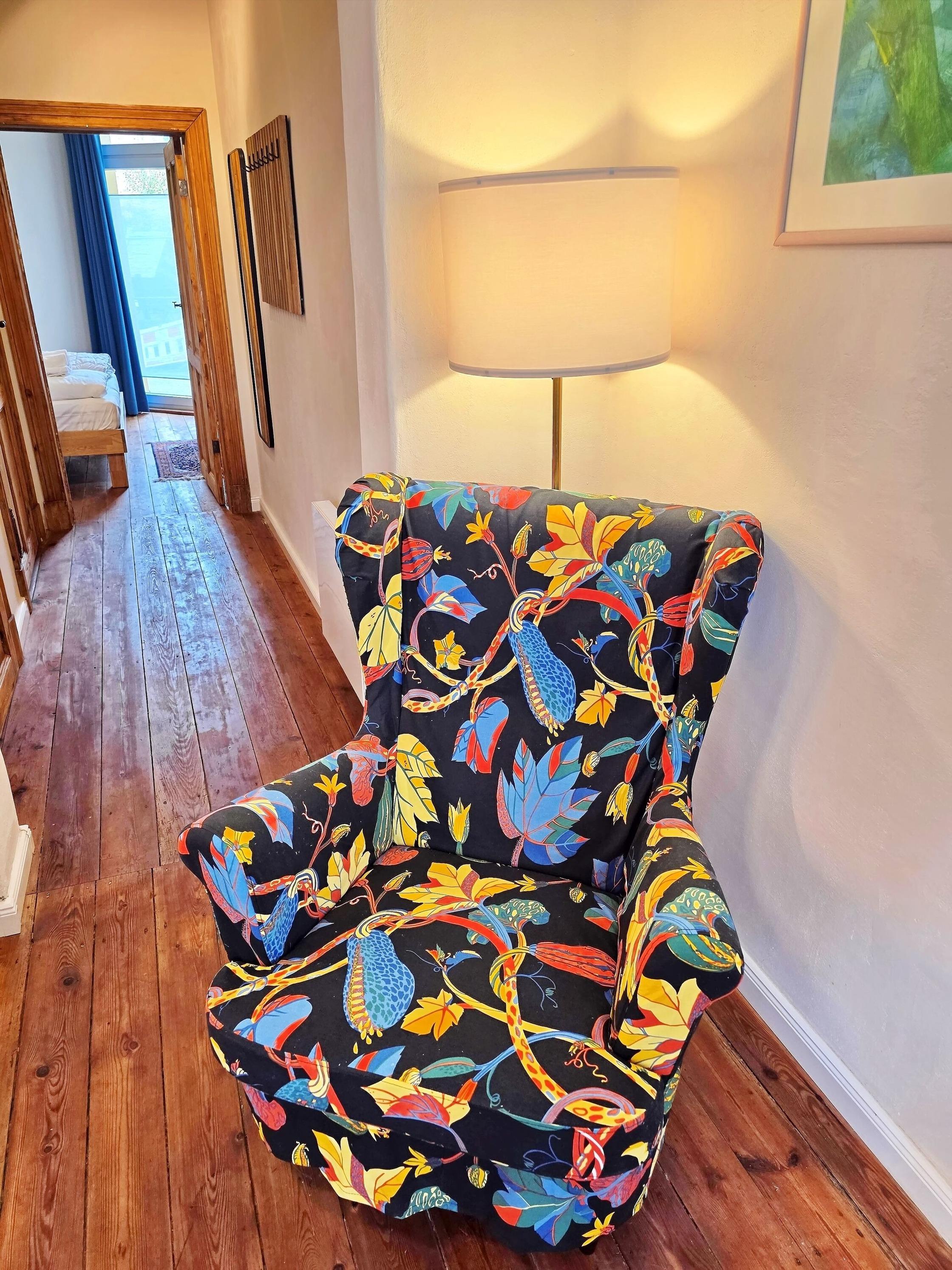 Das gemütliche Schlafzimmer ist mit einem komfortablen Doppelbett ausgestattet – flankiert von zwei Nachttischen mit Beleuchtung. Ein Sessel lädt zum Lesen oder Entspannen ein, und ein Schreibtisch bietet die Möglichkeit zum Schreiben, Arbeiten oder Planen Ihrer Ausflüge. Große Fenster sorgen für angenehmes Tageslicht, ohne an Privatsphäre einzubüßen.