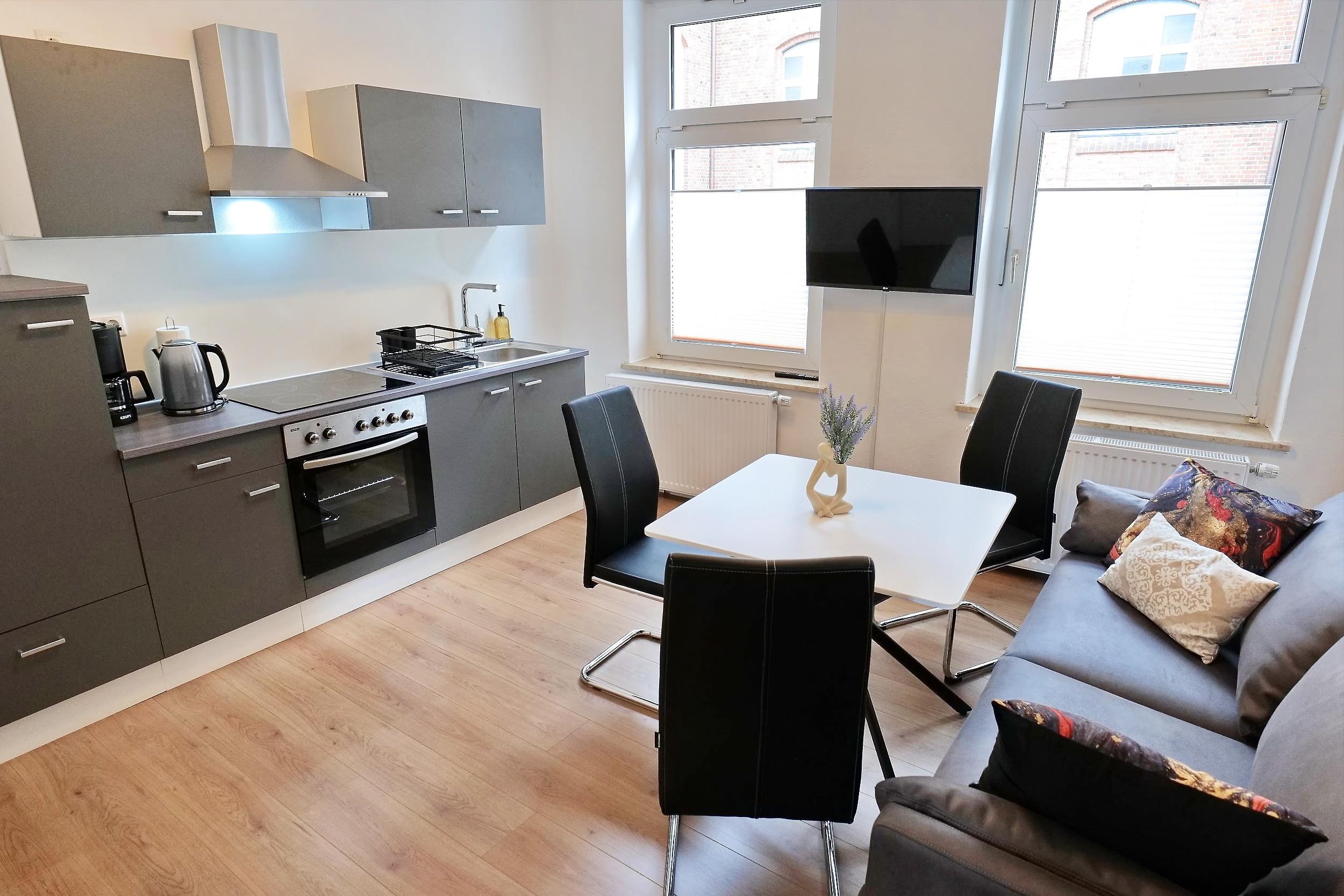 - 1 Wohnzimmer mit offener Küche, Couch, Flat-TV (Fernsehen über Intenet)