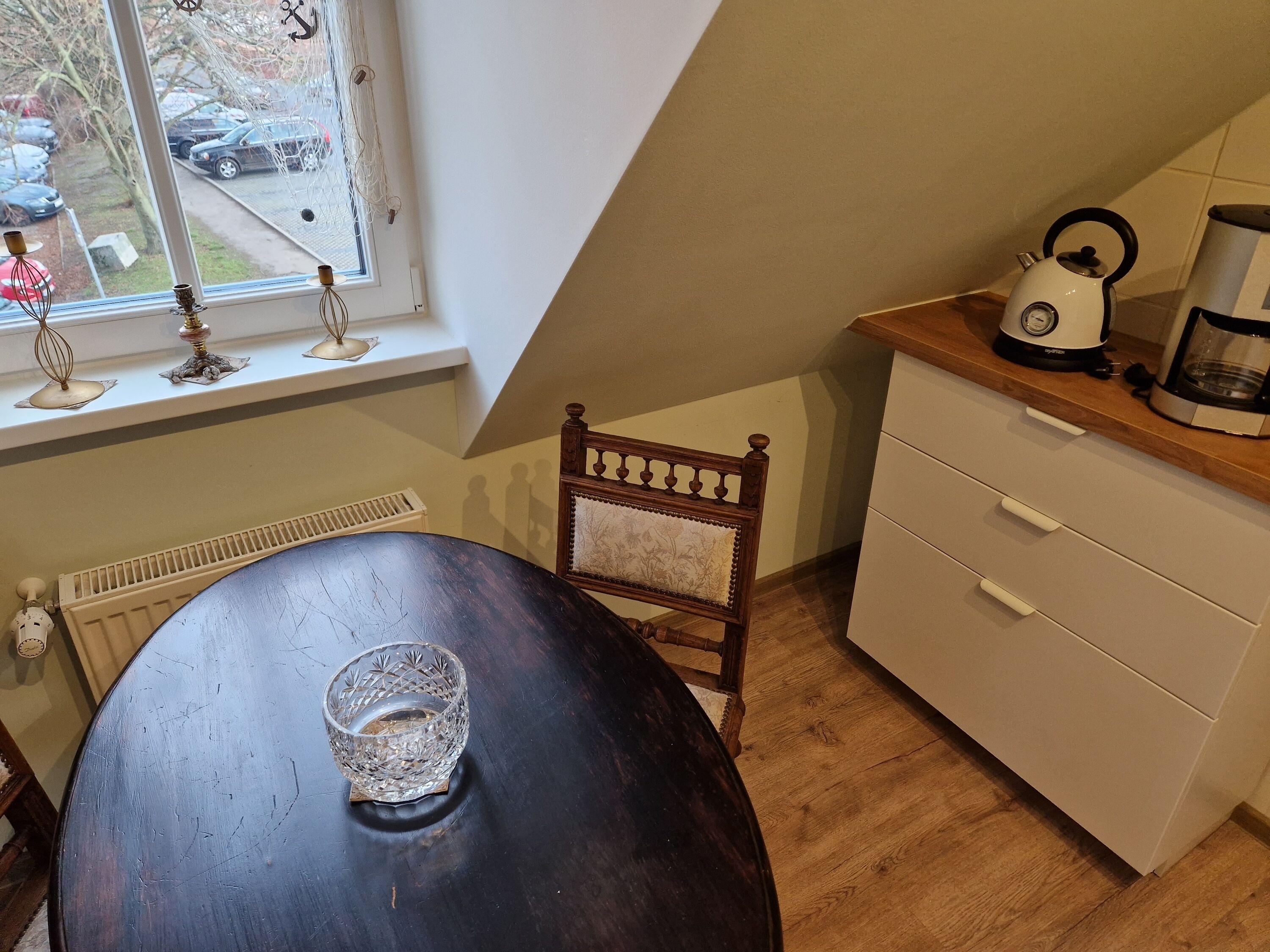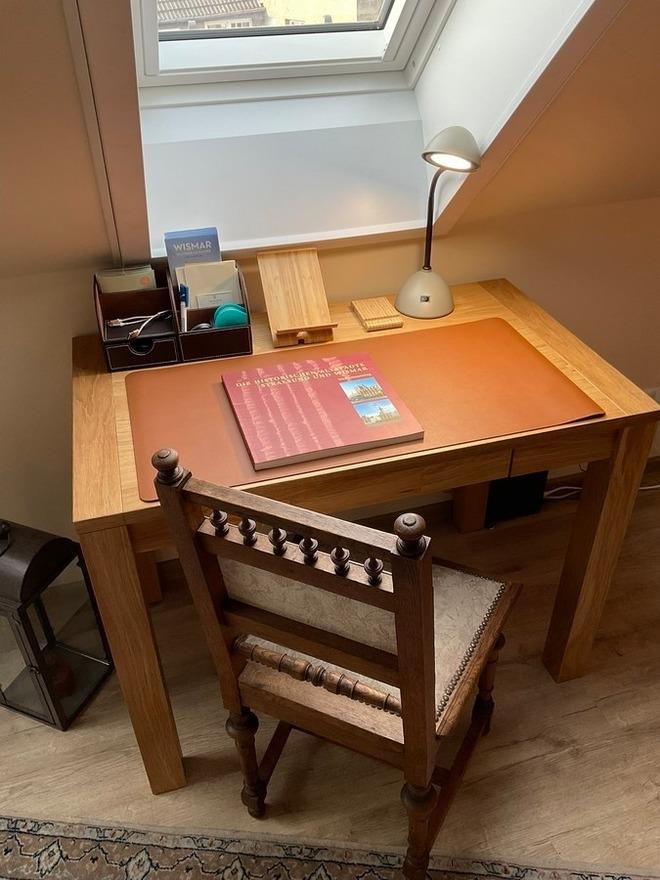 Mittelpunkt ist das große Dachzimmer, räumlich in Wohn- und Schlafraum unterteilt. Mit Blick in den Himmel und auf die Wismarer Hinterhöfe (mit Hühnern) können Sie hier auf der bequemen Coach entspannen, den Schreibtisch für Ihre Urlaubspost nutzen, lesen, ausschlafen, Ausflüge planen……..