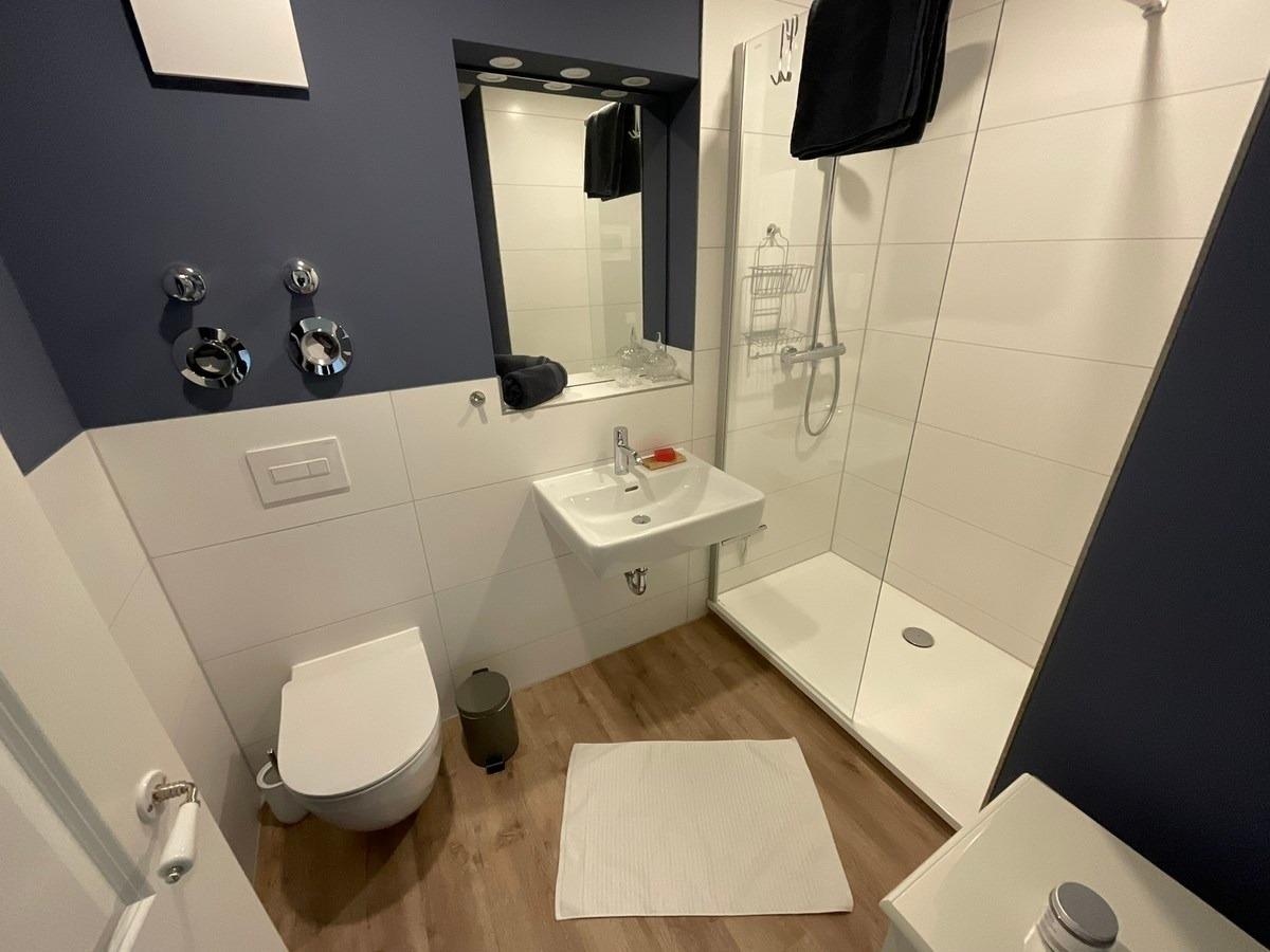 Das neue und hochwertige Badezimmer bietet im modernen Design eine begehbare Dusche mit zusätzlicher Regenbrause, WC, Handtuchheizung und ausreichend Stauraum inkl. Fön und Lockenstab.