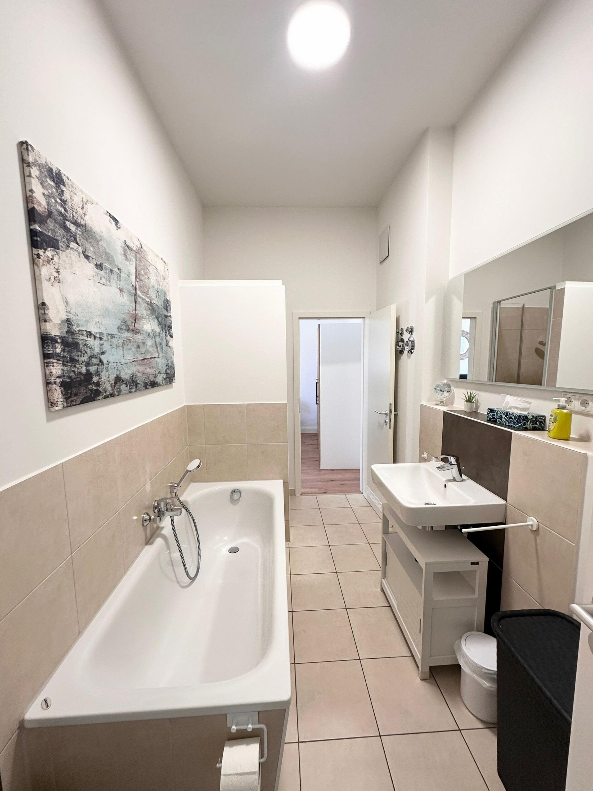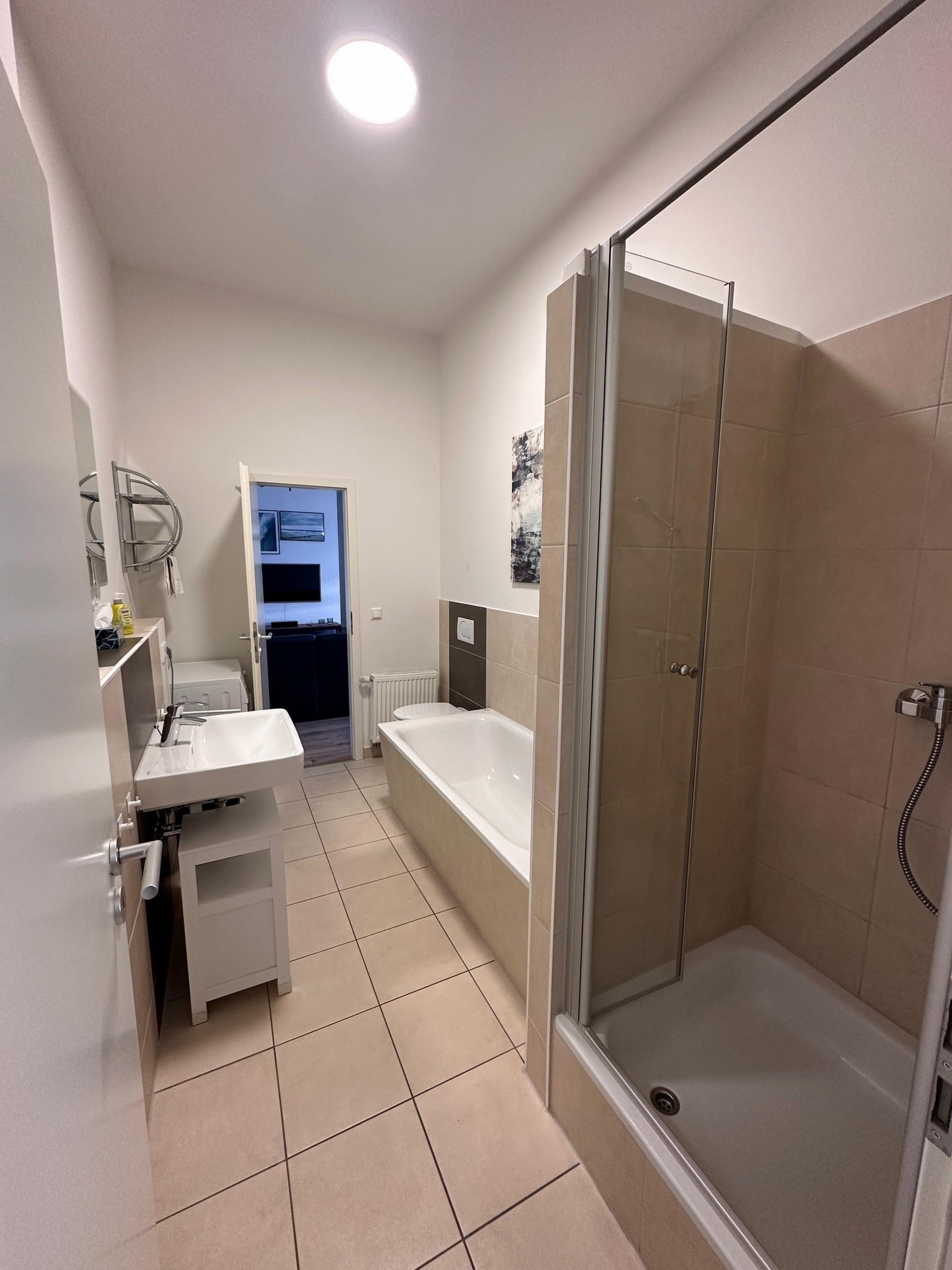 Schickes Badezimmer mit Badewanne und zusätzlicher Dusche, WC, Spiegel und ausreichend Ablagefläche für Ihre Beautyutensilien. Das Badezimmer kann sowohl vom Wohnzimmer, als auch vom Schlafzimmer erreicht werden.