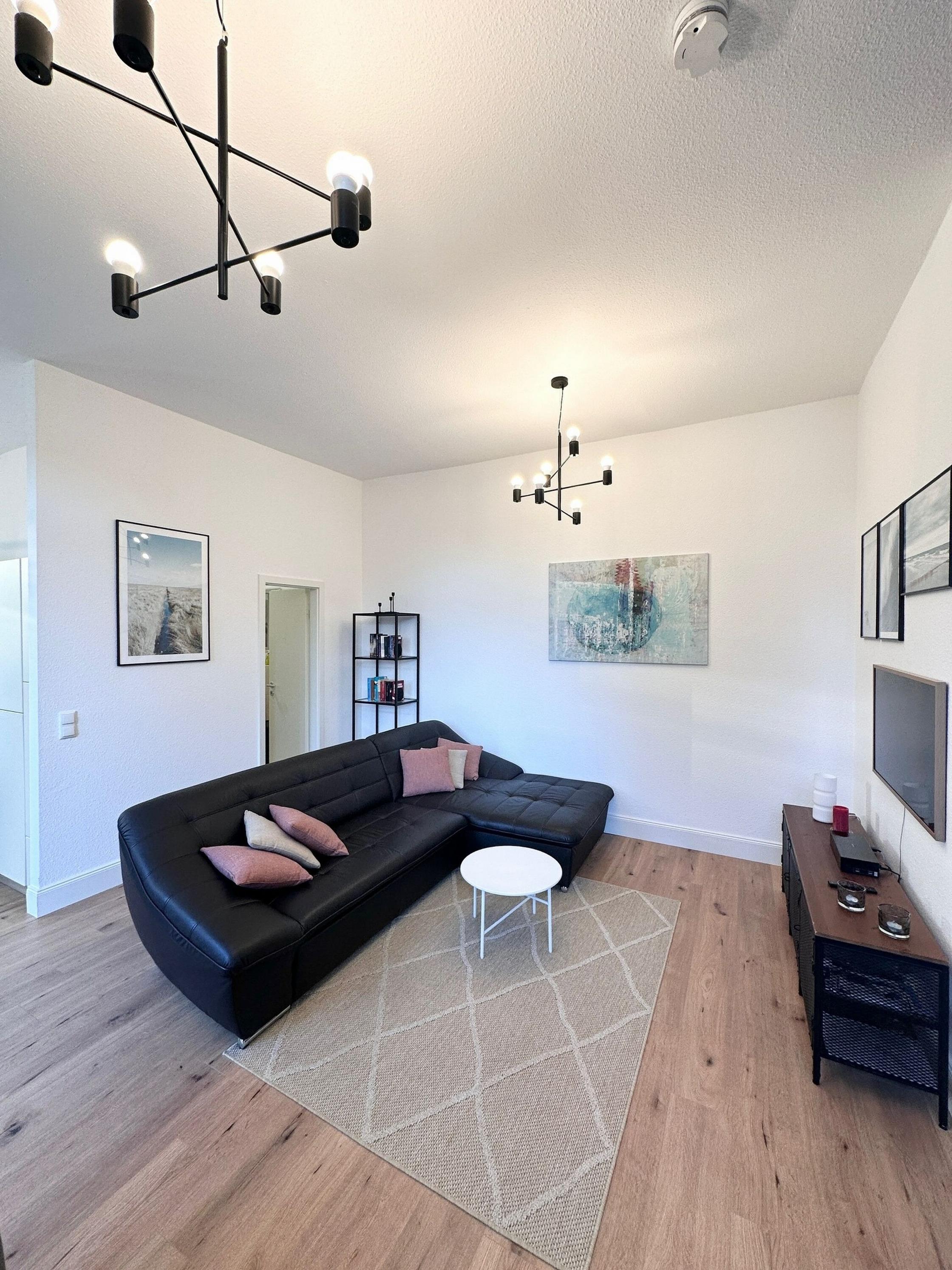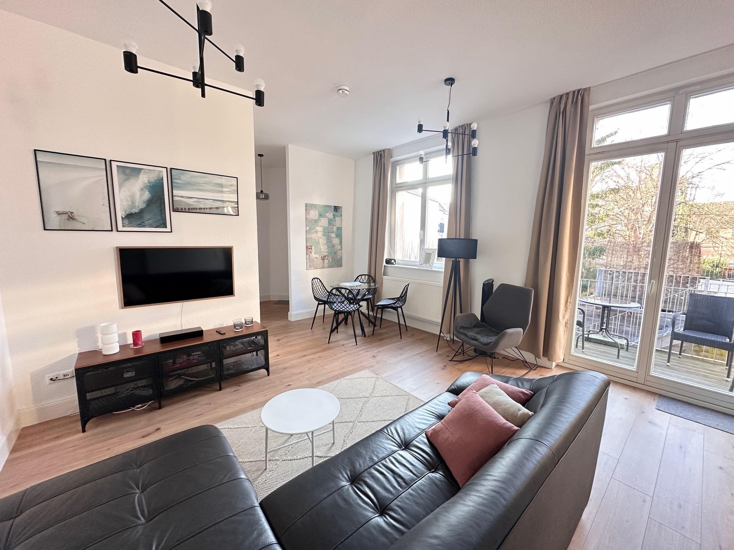 Stilvolles Wohnzimmer mit großer Ledercouchlandschaft (ausziehbar zur Schlafcouch), Low-board mit Flat-TV, Radio und Blick auf den Balkon.