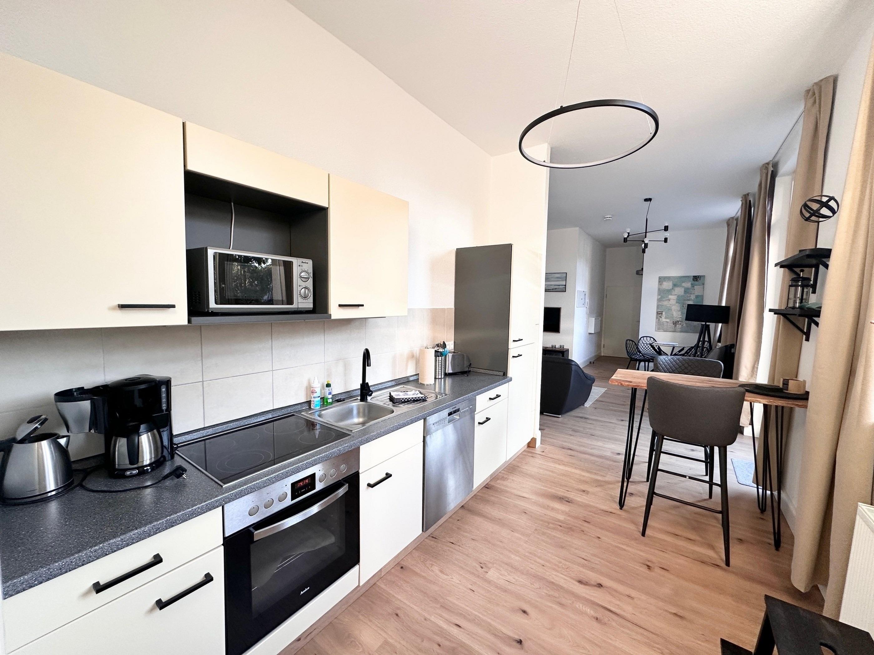 Moderne helle Küche mit Backofen, Ceranherd, Wasserkocher, Kaffeemaschine, Geschirrspüler, Kühlschrank, Mikrowelle, Toaster, Geschirr, Gläser, Besteck uvm..