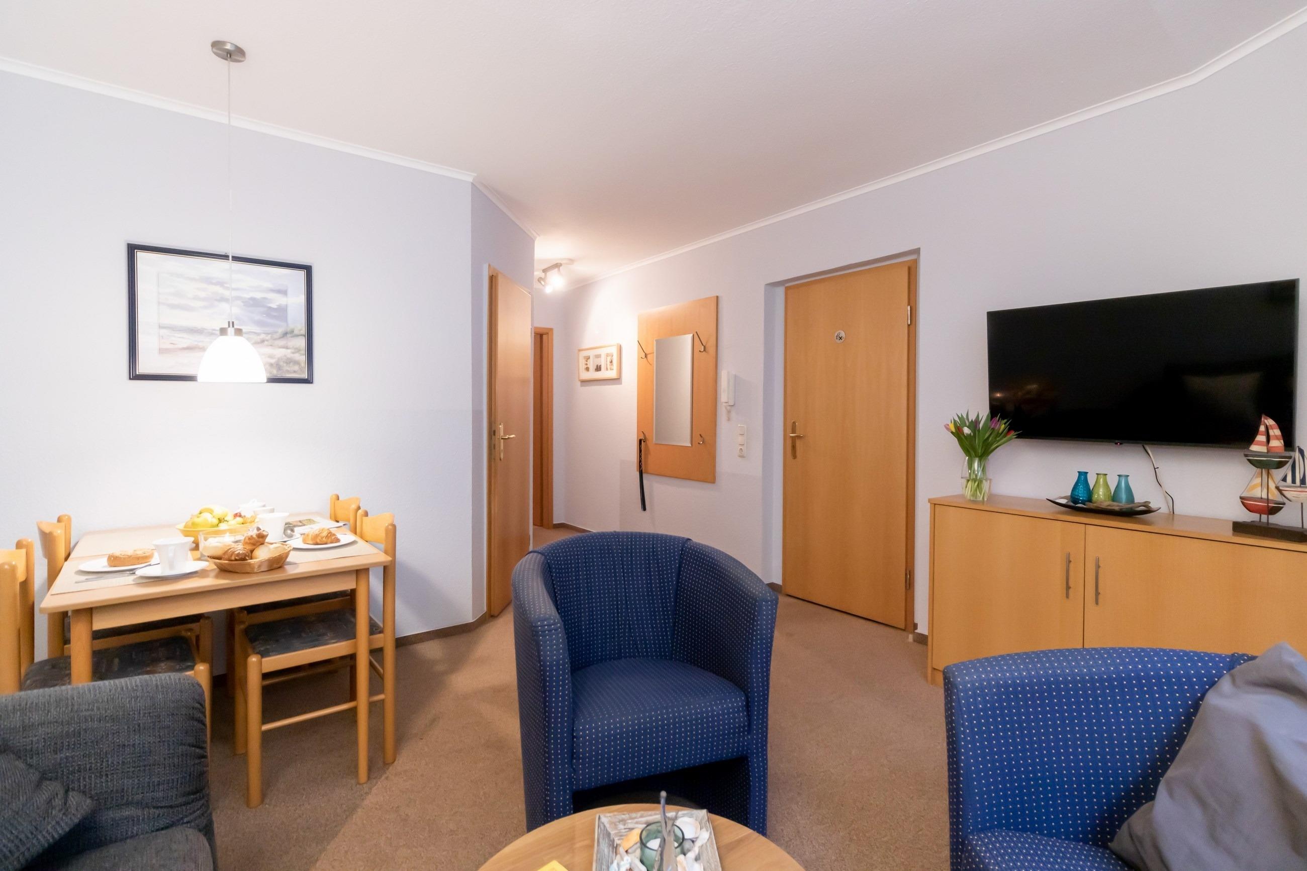 Wohnzimmer mit Schlafcouch, gemütliche Sitzecke, Essplatz, Flachbild-TV, Sat-TV