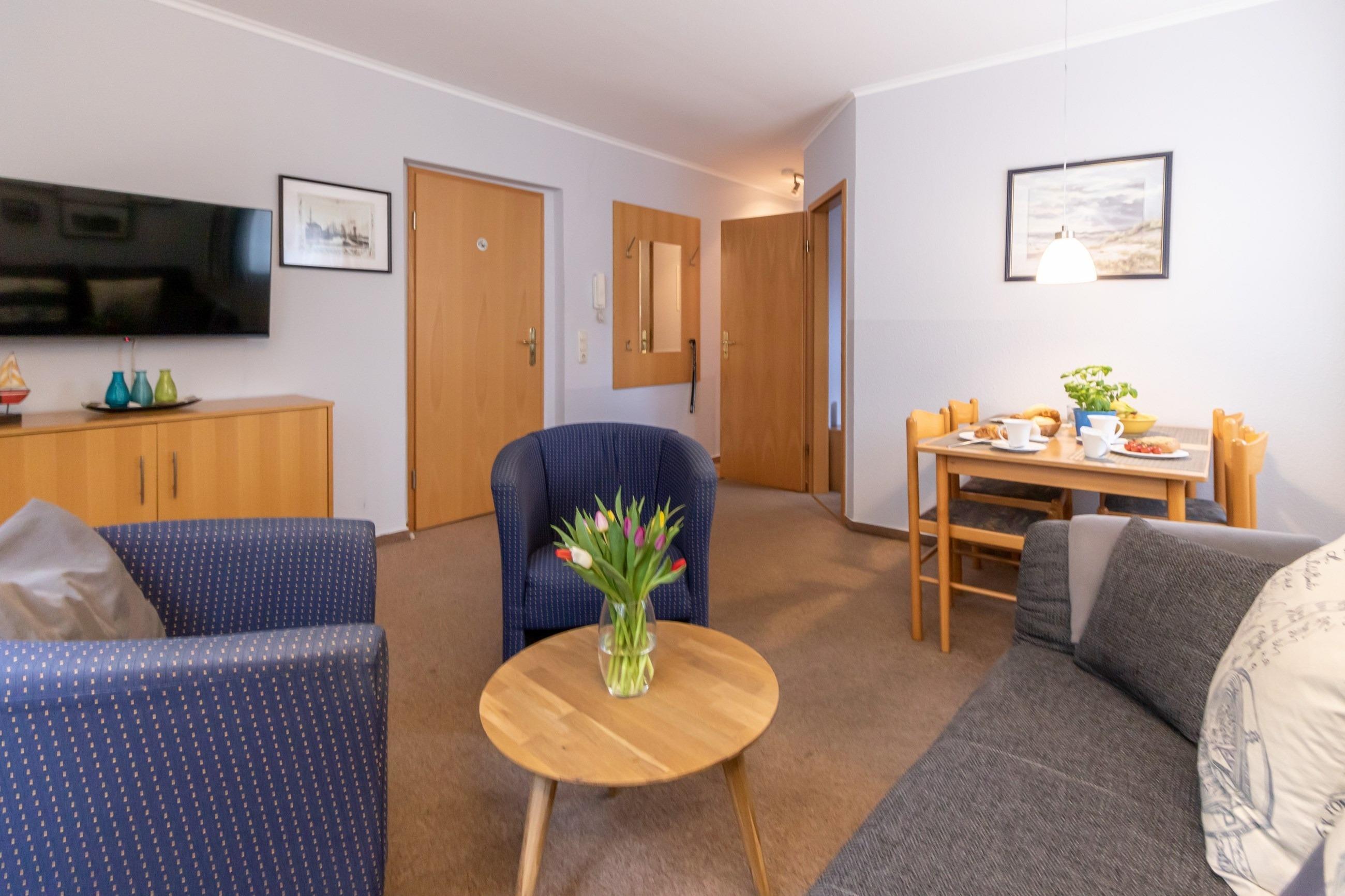 Wohnzimmer mit Schlafcouch, gemütliche Sitzecke, Essplatz, Flachbild-TV, Sat-TV