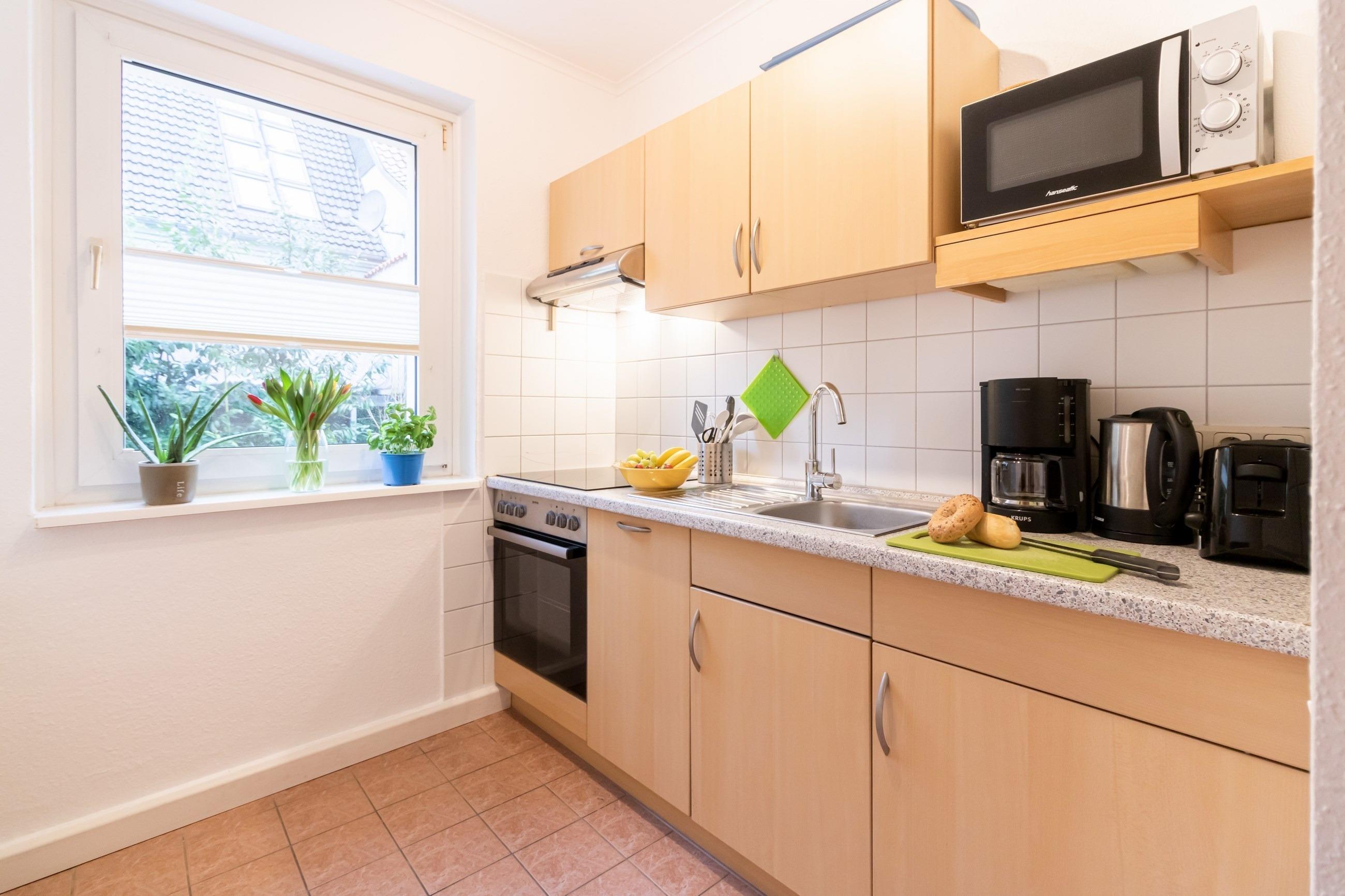Küche mit E-Herd, Geschirrspüler, Mikrowelle, Kühlschrank, Kaffeemaschine, Toaster