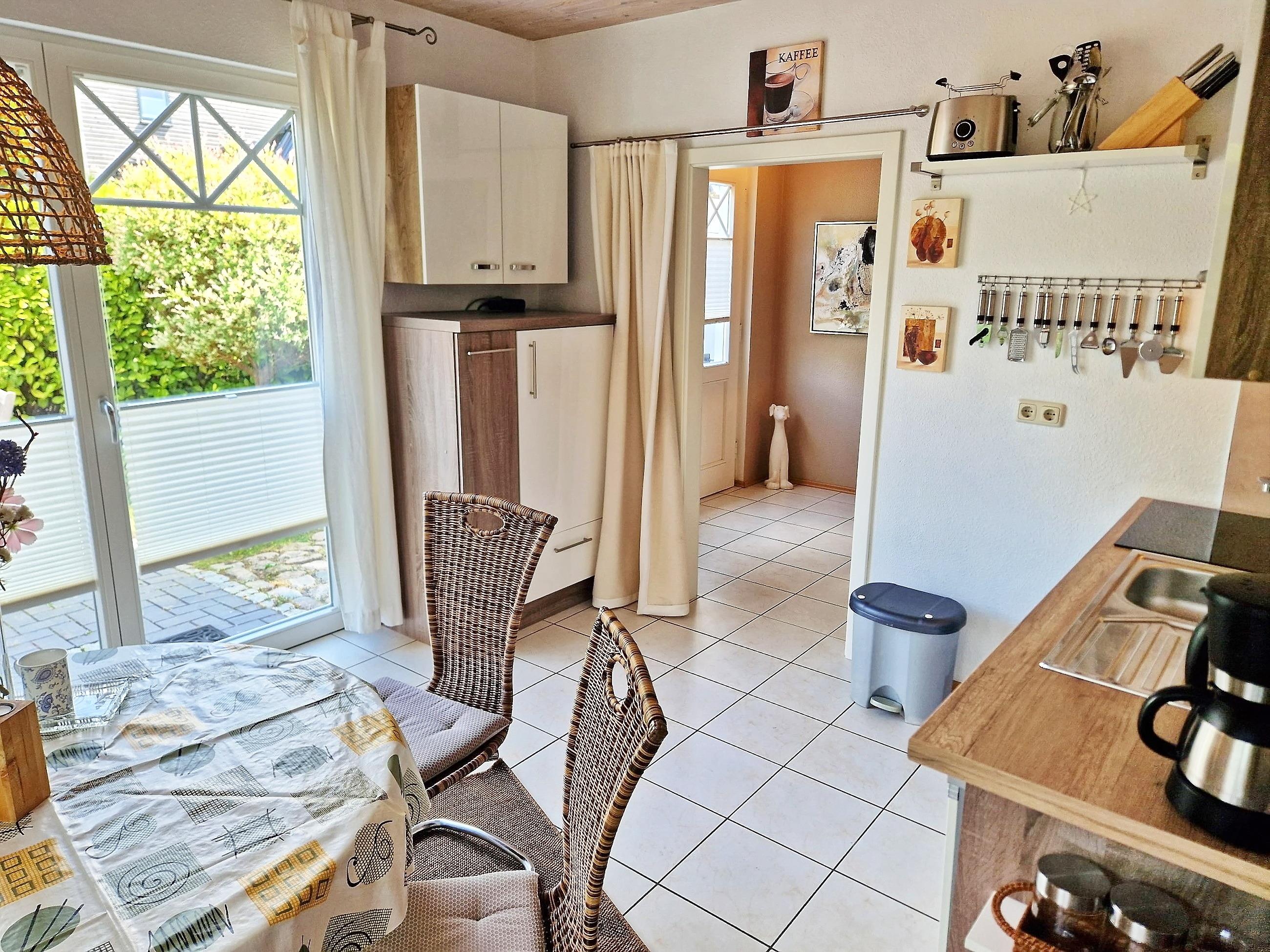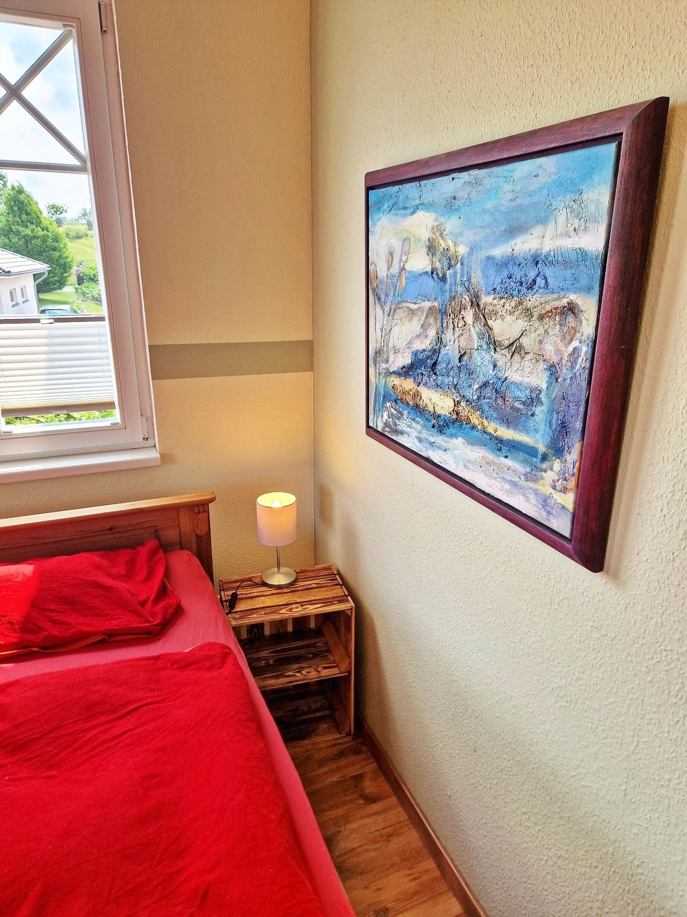 Exklusive Ferienwohnung mit separatem Eingang im neuwertigen Holzhaus; Eingangsflur mit Garderobe, ein kombinierter Ess-/Wohnraum mit Küchenzeile, Esstisch, Couch, TV; modernes Bad mit Dusche, das stilvolle Schlafzimmer mit Doppelbett im Obergeschoss ist über eine Treppe (steil) räumlich getrennt, eigene Terrasse mit Gartenmöbel, Parkplatz. Aufbettung im Wohnraum (Couch) und Reisebett auf Anfrage möglich. Die Räume verfügen über einen Sichtschutz (Plissee), sind aber nicht vollständig zu verdunkeln.