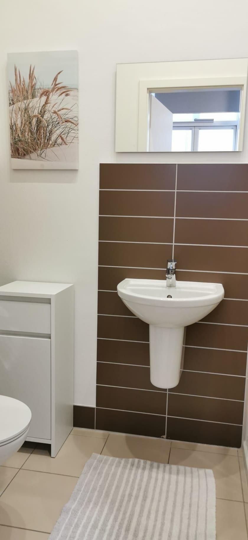 - 1 Bad mit Dusche / WC, Handtuchhalter, Spiegel, Ablage, Fön