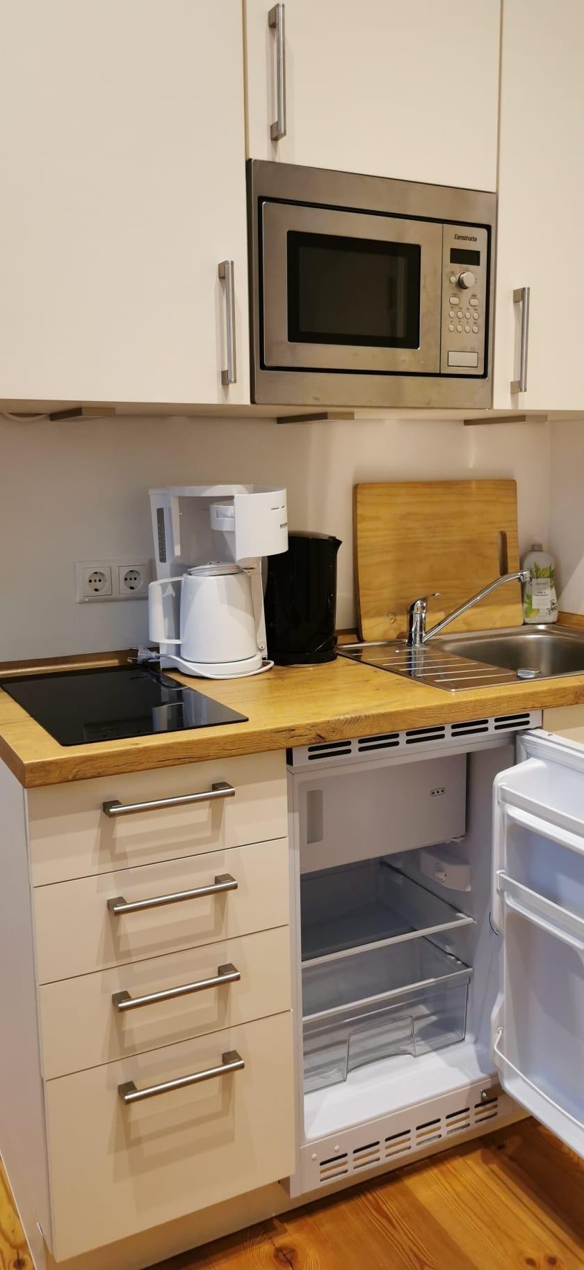 - Pantryküche mit Mikrowelle, 2-Platten-Induktionsherd, Geschirr, Besteck, Töpfe usw.