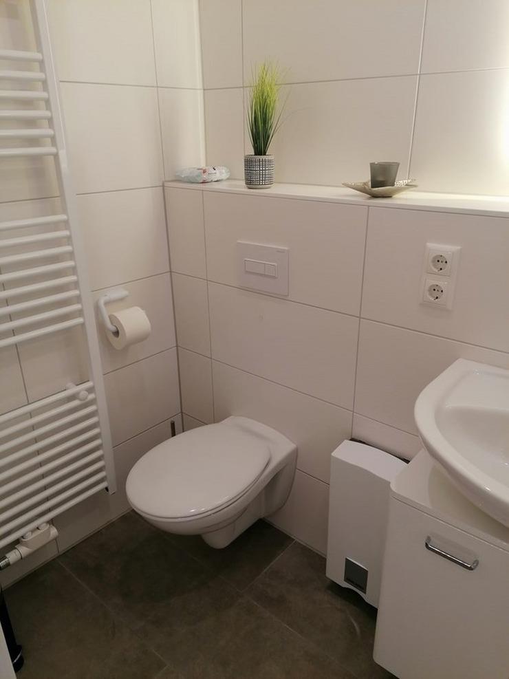 - Badezimmer mit Dusche, WC, Waschbecken, Spiegelschrank