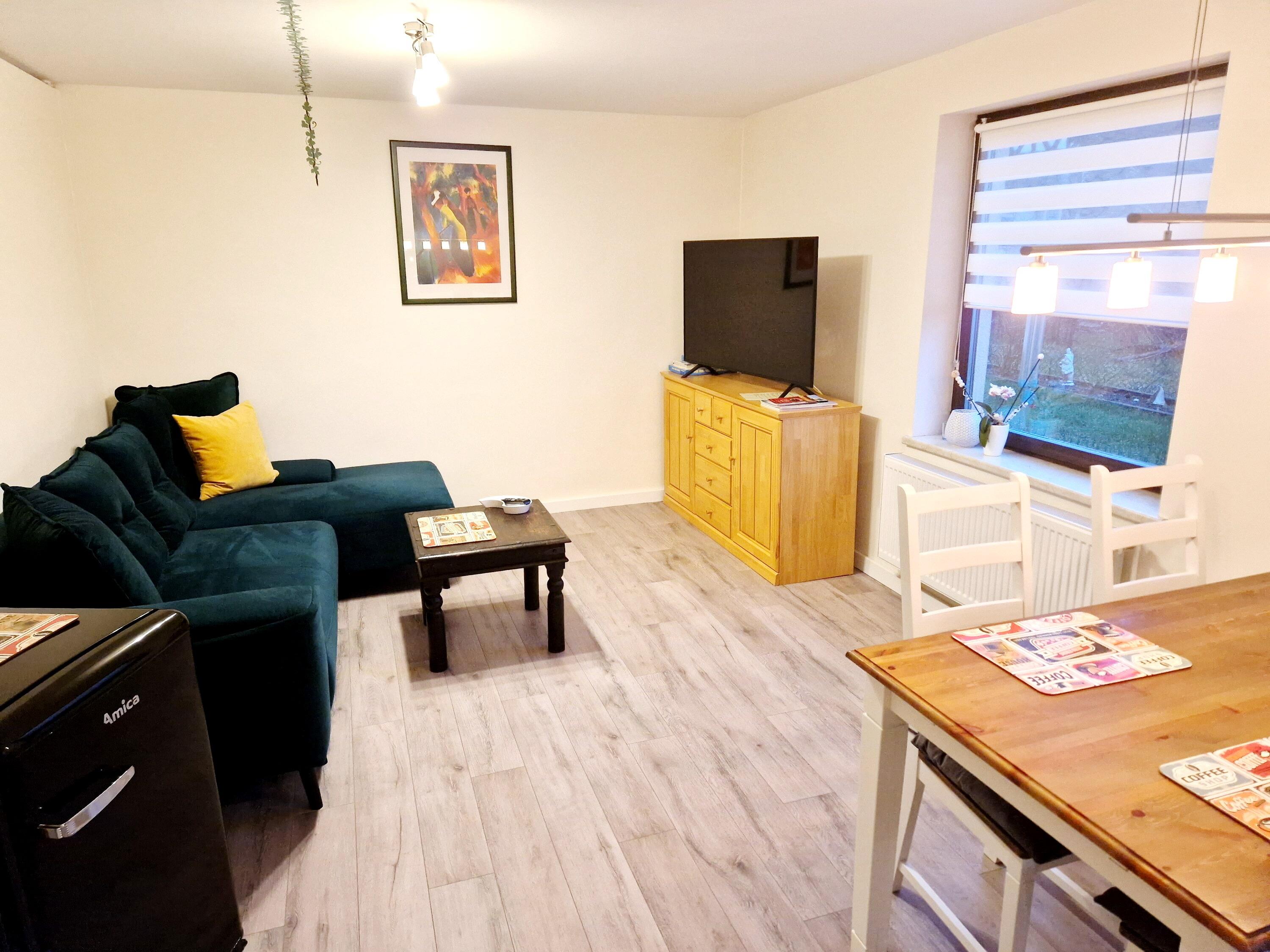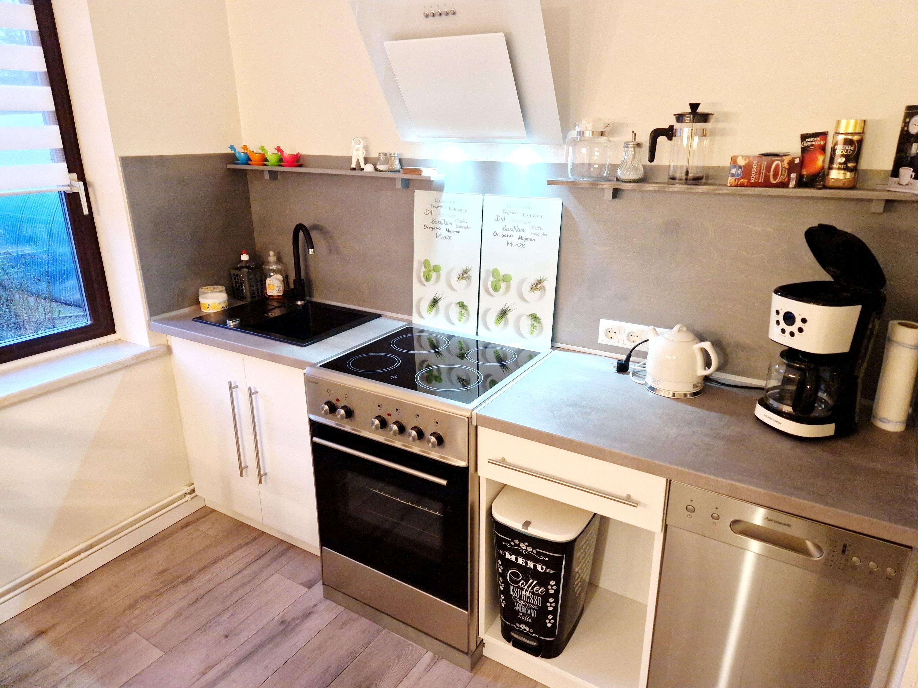Couch, TV, Esstisch, Küche vollausgestattet mit 4-Plattenherd, Geschirrspüler, Backofen, Kühlschrank, Kaffeemaschine, Wasserkocher, Toaster, Geschirr, Töpfe, Besteck, Geschirrtuch uvm.