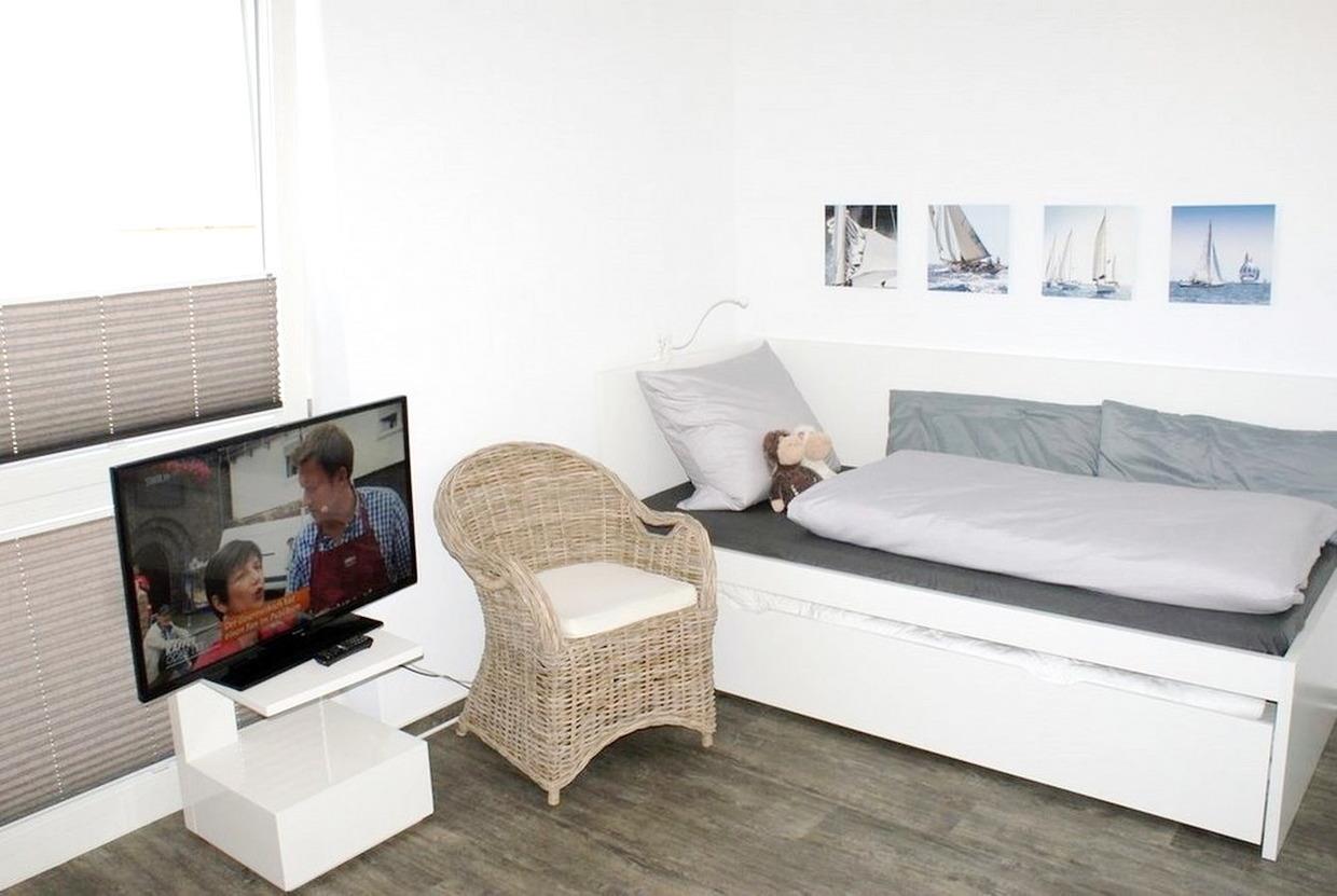 Unsere Ferienwohnung *Hafenblick* ist 84qm groß und bietet Platz für 2 bis 6 Personen. Sie ist modern und gemütlich mit viel Liebe zum Detail eingerichtet. Das Wohnzimmer mit offener Küche, sowie einer Loggia mit Blick auf den Hafen laden zum morgendlichen Frühstück oder zum Abend ausklingen bei einem Gläschen Wein ein. Entspannen Sie auf der Couch, sitzen Sie unterhaltsam am großen Esstisch oder beobachten Sie von der Loggia aus Treiben an der Kaikante. Die Ferienwohnung besitzt zwei separate Schlafzimmer. Im Kleineren der zwei Schlafzimmer befindet sich ein gemütliches Doppelbett und im Großen ein Doppelbett, sowie ein weiteres Ausziehbett. Die hochwertige Ausstattung runden zwei Fernseher und kostenloses Internet über WLAN für Sie ab.