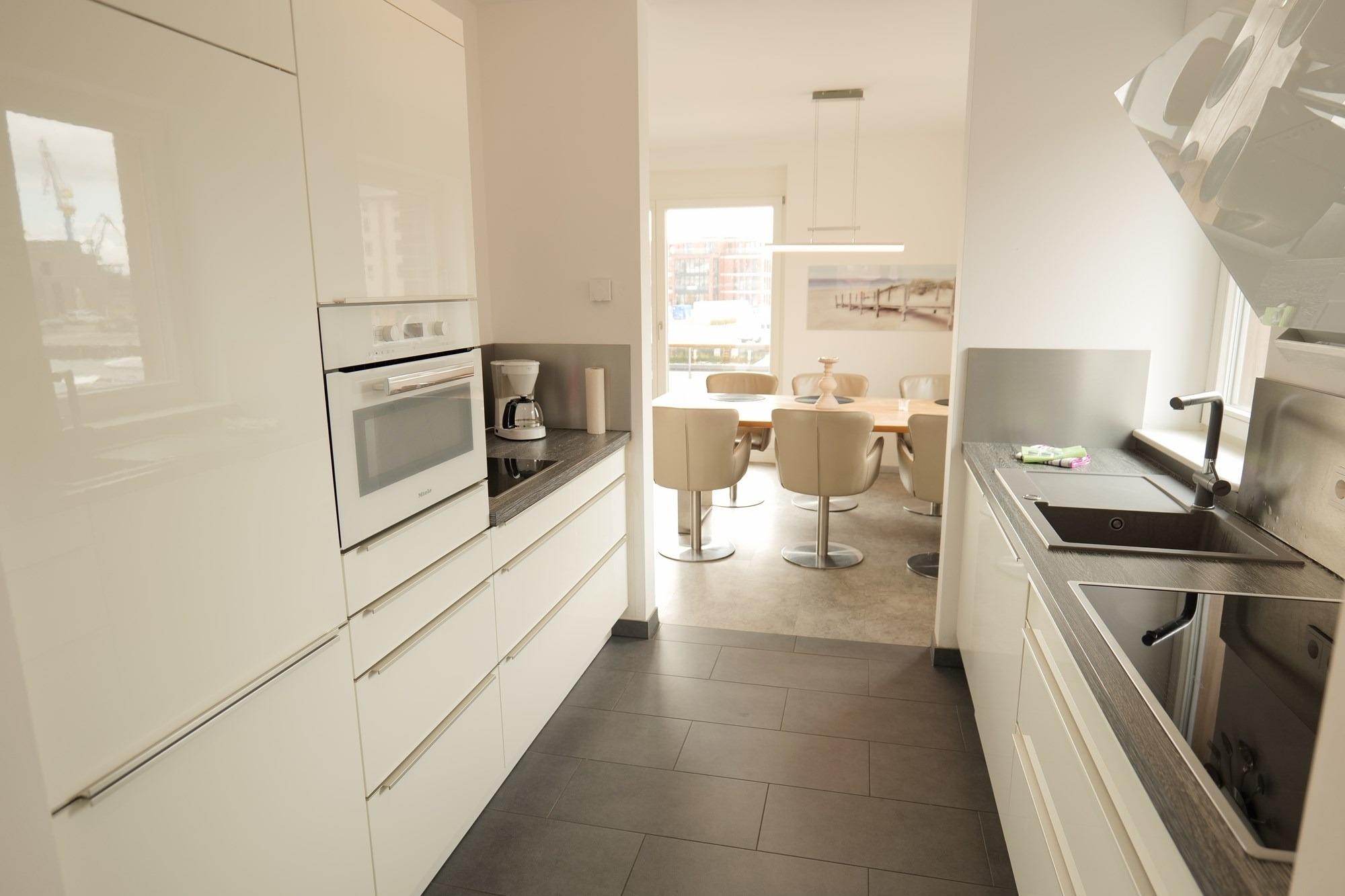 Küche vollausgestattet mit Markengeräten (u.a. mit 4-Platten-Herd Ceran, Backofen, Kaffeemaschine, Toaster, Wasserkoche, Geschirr, Besteck)