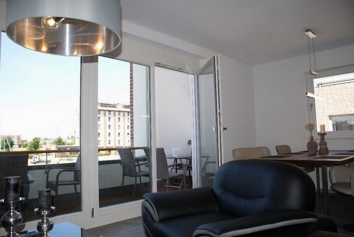 Wohnzimmer mit Essbereich und Zugang zum großen Balkon