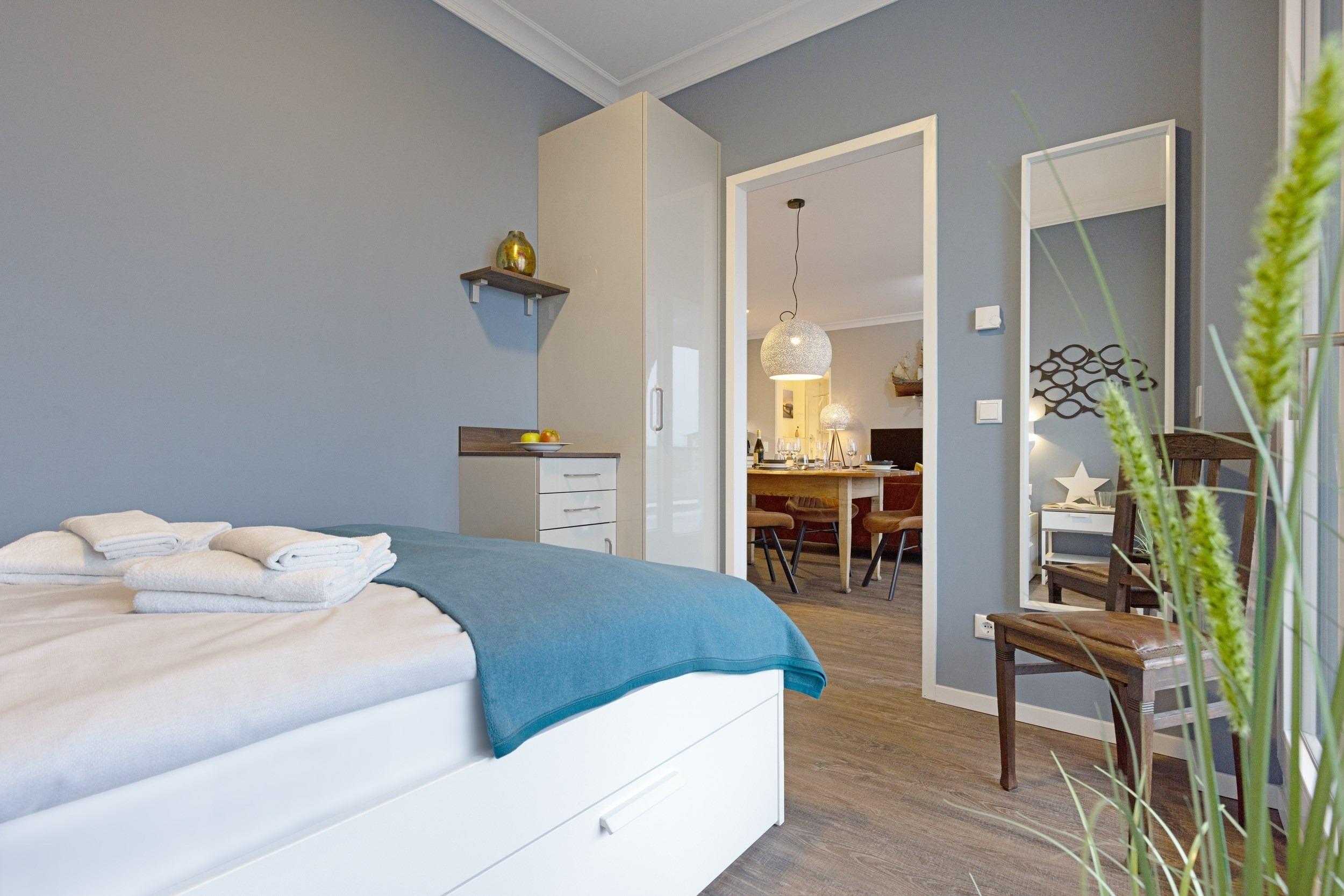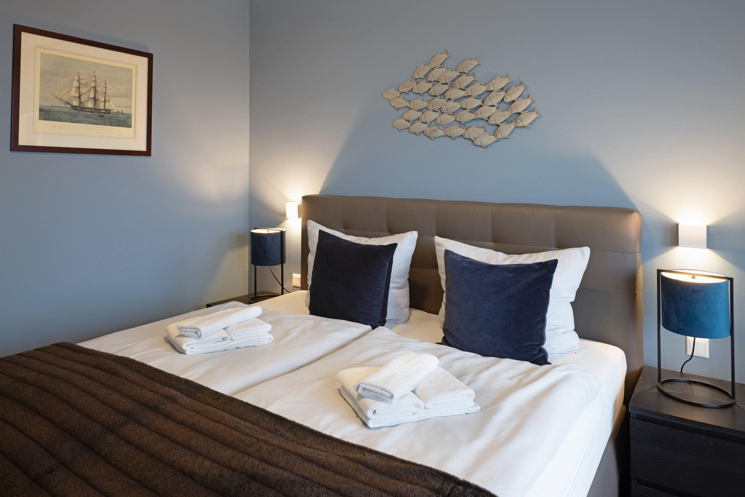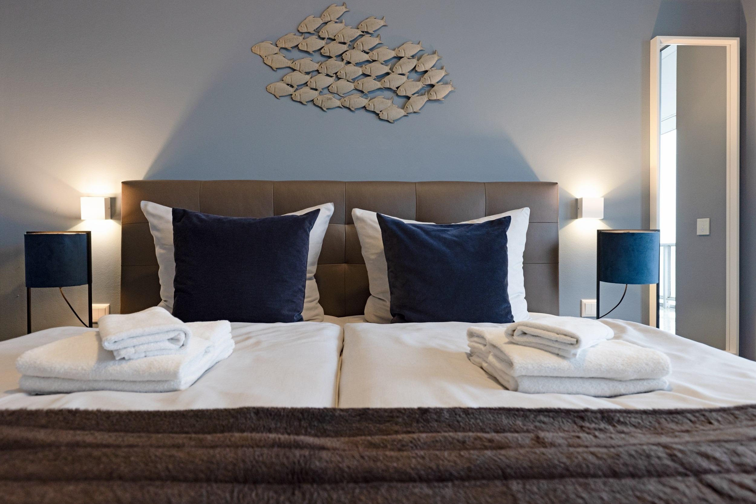 Die beiden separaten komfortablen Schlafra¨ume sind mit hochwertigen bequemen Boxspring-Doppelbetten (1,80 m x 2,00 m sowie 1,40 m x 2,00 m) sowie maßgefertigten Kleiderschra¨nken und großzu¨gigen Ablagemo¨glichkeiten ausgestattet. Fu¨r Ihren ruhigen und ungesto¨rten Schlaf sind alle Wohn- und Schlafra¨ume mit komplett verdunkelnden elektrisch gefu¨hrten Aluminiumrollla¨den ausgestattet. Wir wu¨nschen Ihnen erholsame Tra¨ume an diesem idealem Ru¨ckzugsort. Zum unkomplizierten und zentralen Laden Ihrer Mobilgera¨te sind dort zusa¨tzliche Multimedia-Steckdosen mit jeweils drei USB-Ports sowie einem Typ-C Port mit Kindersicherung vorhanden. Die Betten haben wir fu¨r Sie bereits bezogen und Handtu¨cher liegen schon bereit.