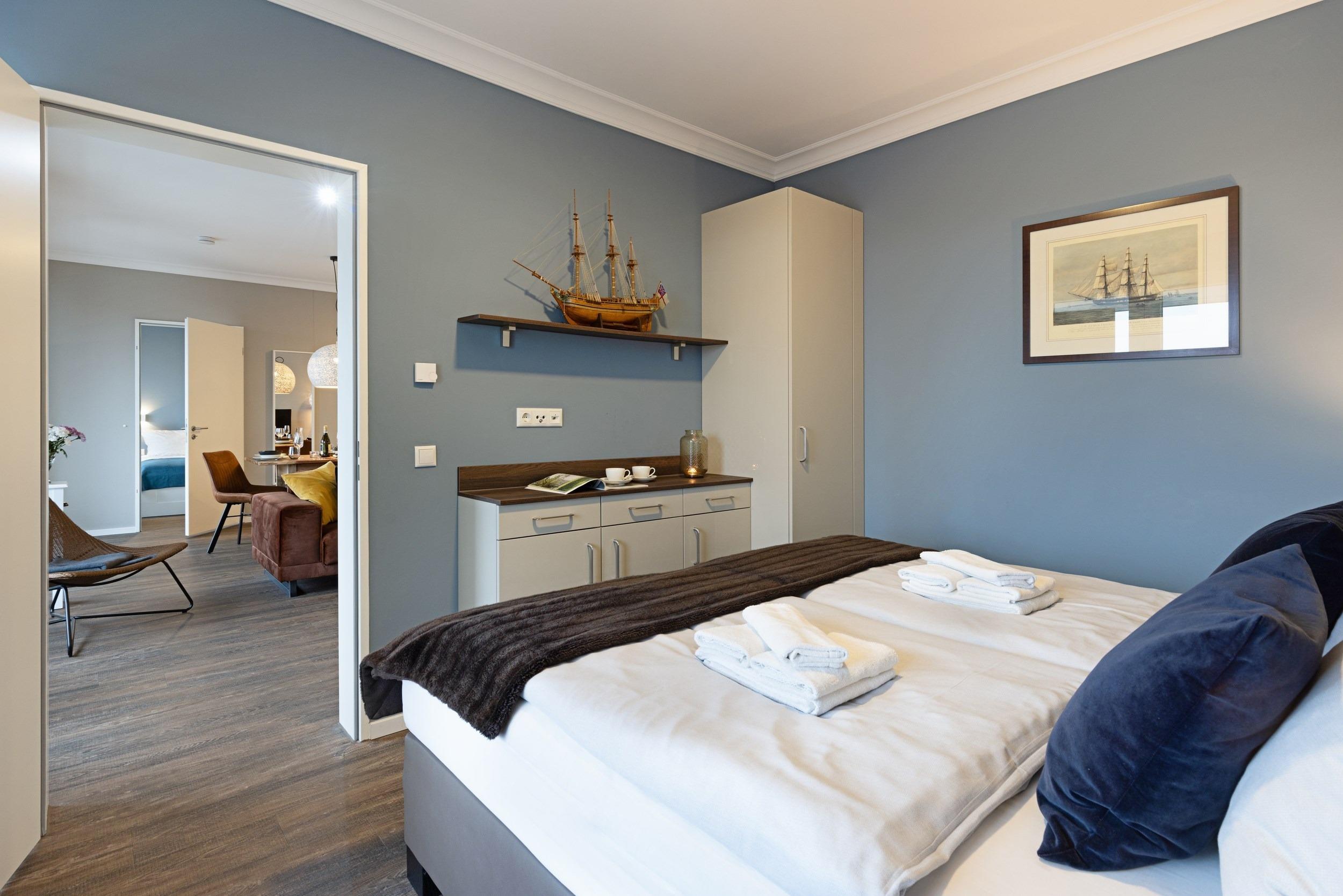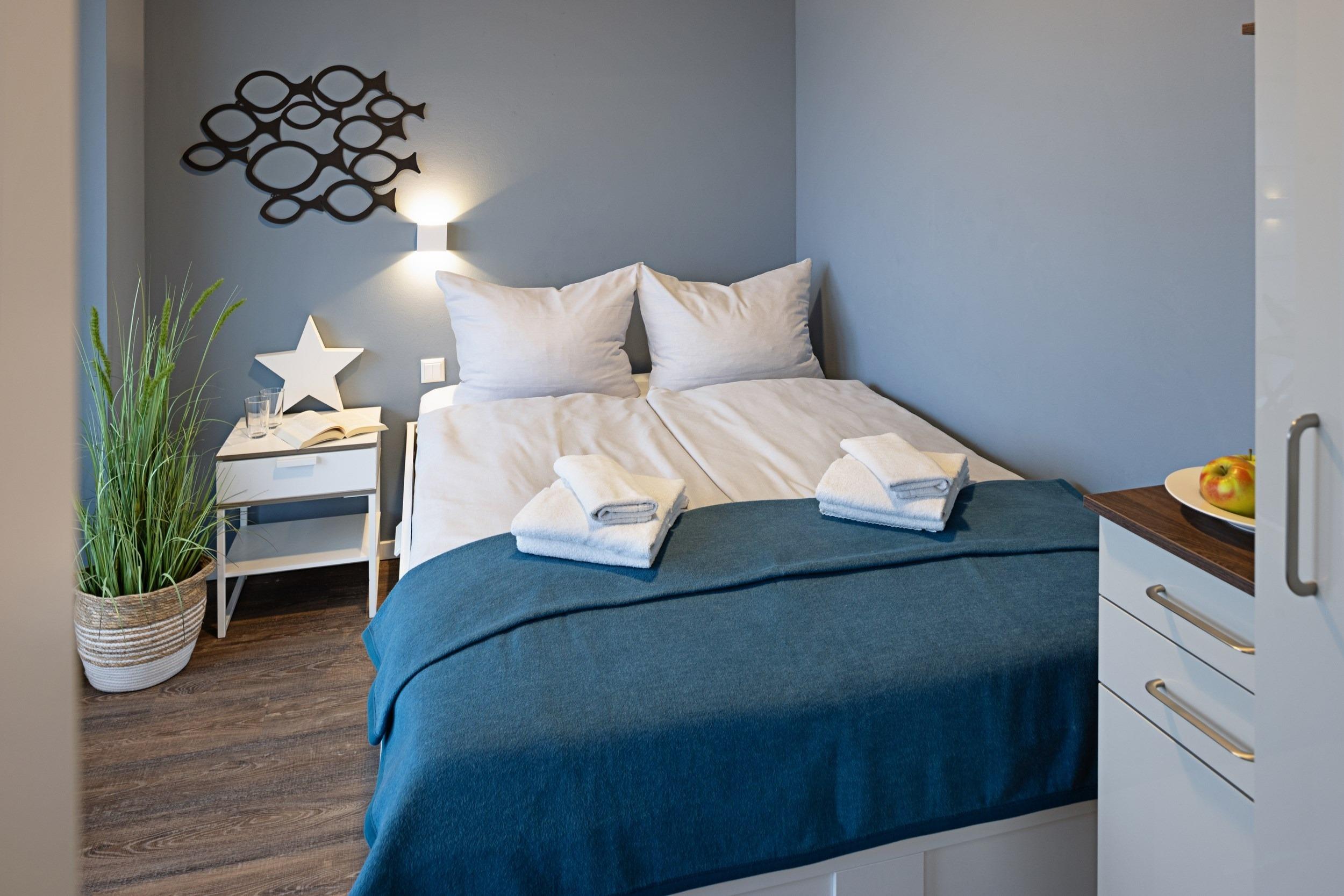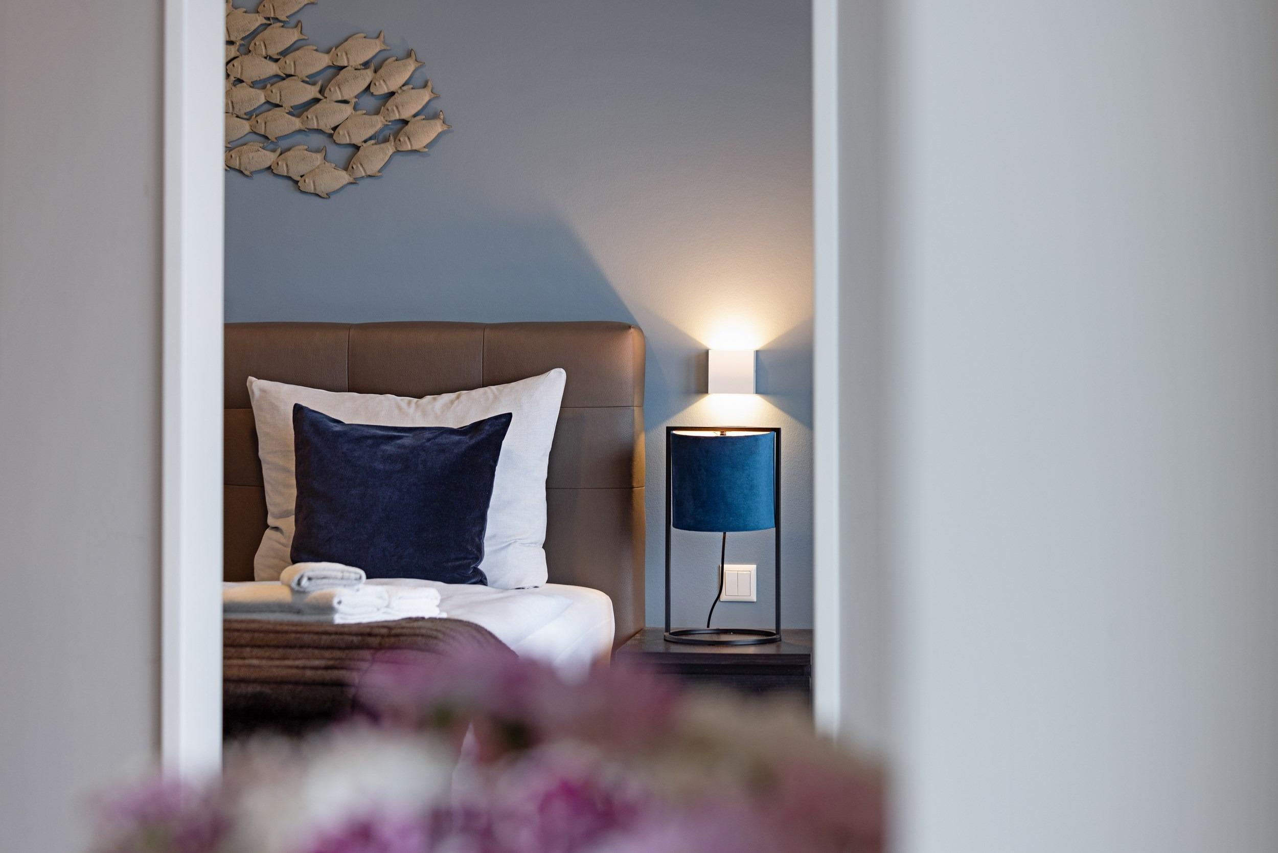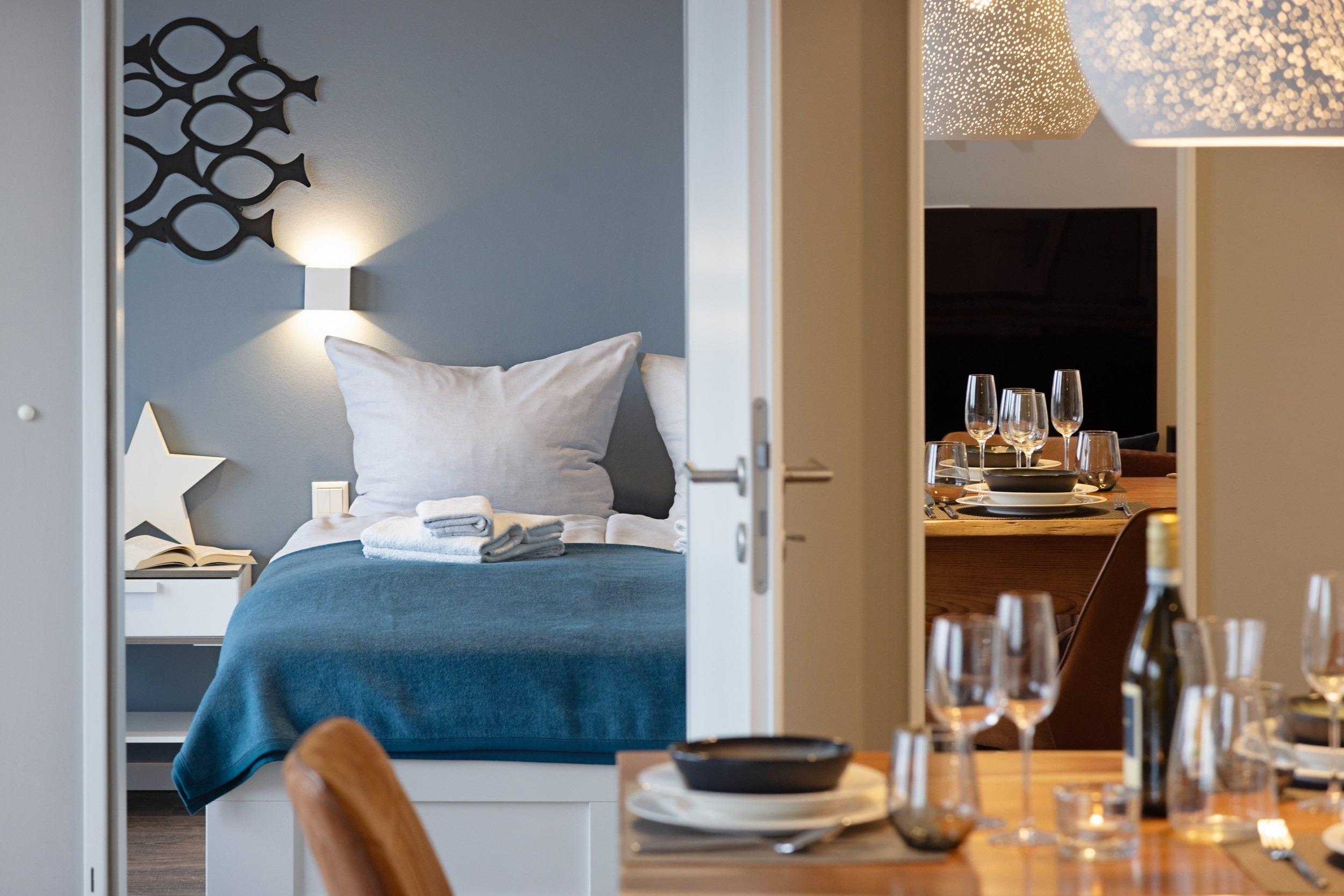Die beiden separaten komfortablen Schlafra¨ume sind mit hochwertigen bequemen Boxspring-Doppelbetten (1,80 m x 2,00 m sowie 1,40 m x 2,00 m) sowie maßgefertigten Kleiderschra¨nken und großzu¨gigen Ablagemo¨glichkeiten ausgestattet. Fu¨r Ihren ruhigen und ungesto¨rten Schlaf sind alle Wohn- und Schlafra¨ume mit komplett verdunkelnden elektrisch gefu¨hrten Aluminiumrollla¨den ausgestattet. Wir wu¨nschen Ihnen erholsame Tra¨ume an diesem idealem Ru¨ckzugsort. Zum unkomplizierten und zentralen Laden Ihrer Mobilgera¨te sind dort zusa¨tzliche Multimedia-Steckdosen mit jeweils drei USB-Ports sowie einem Typ-C Port mit Kindersicherung vorhanden. Die Betten haben wir fu¨r Sie bereits bezogen und Handtu¨cher liegen schon bereit.