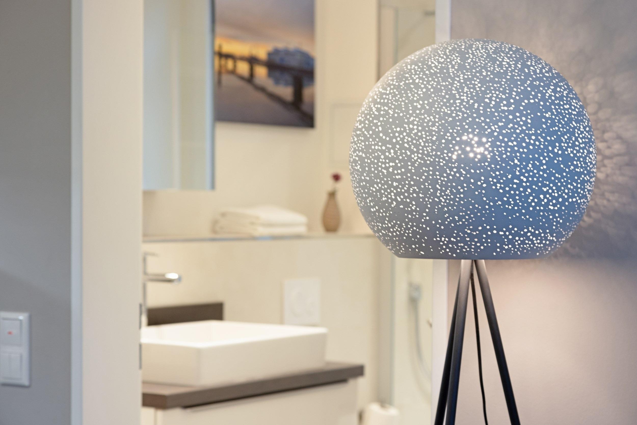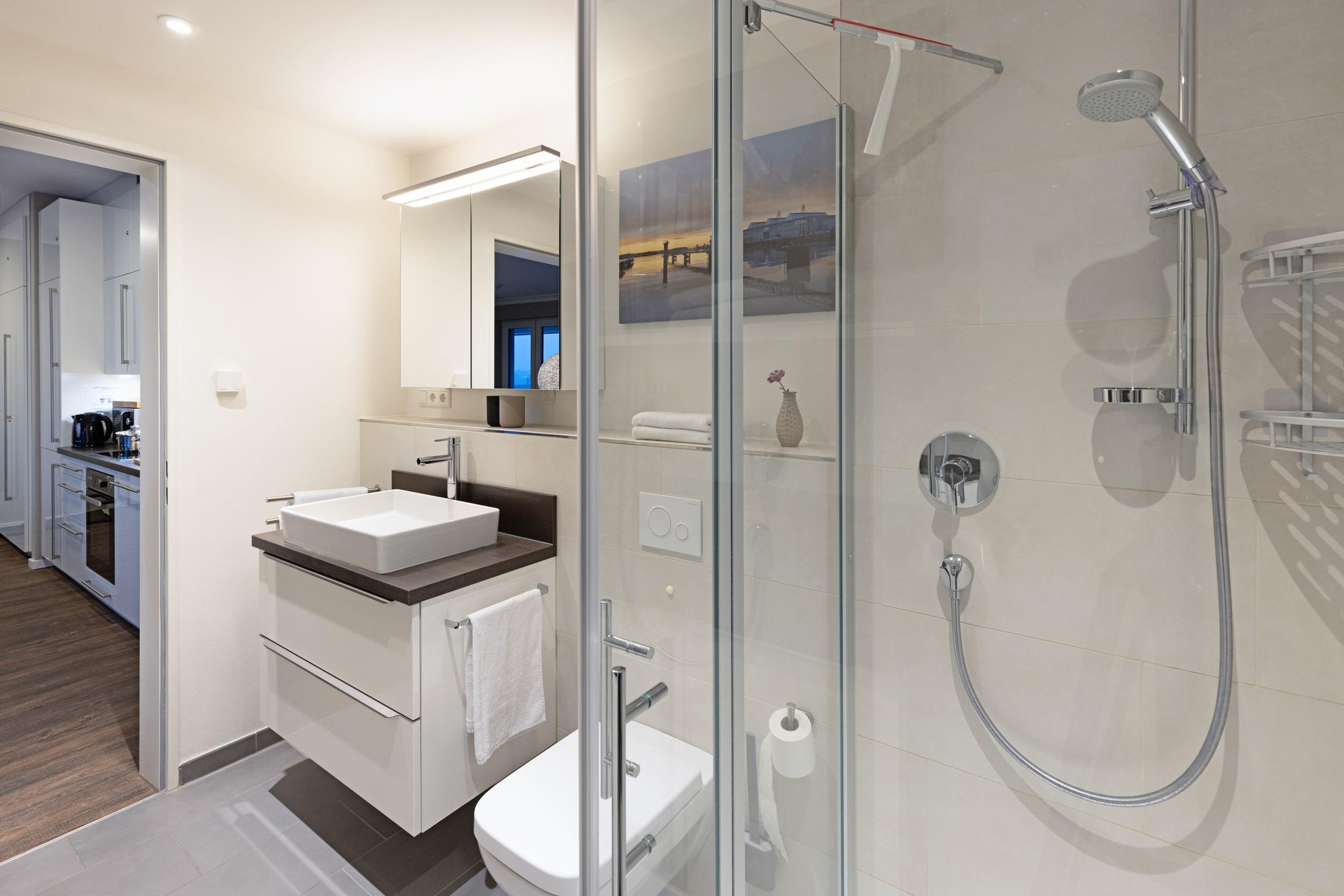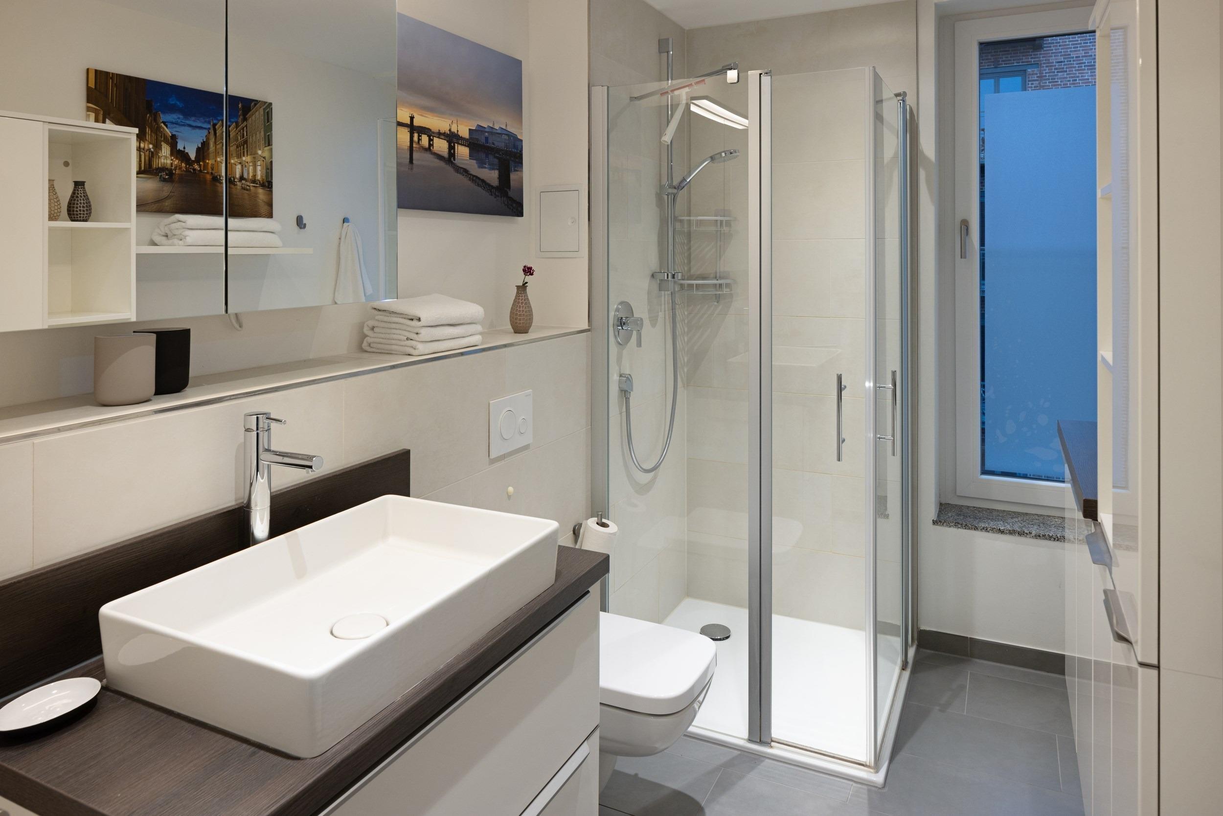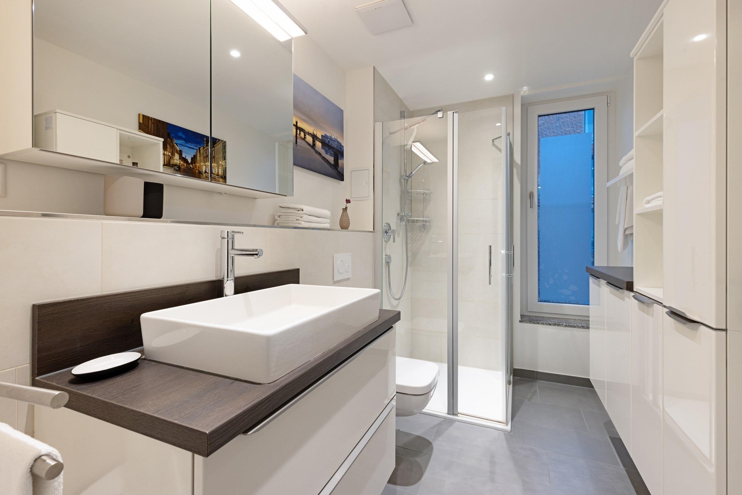Beginnen Sie Ihren Urlaubstag aktiv im stilvollen Tageslichtbad. Dieses verfu¨gt u¨ber ein WC, eine stylische ebenerdige Dusche mit Seifen- und Shampoo-Ablagefla¨chen, einen Marken-Waschtisch mit Schubladen-Unterschrank, einen gera¨umigen Spiegelschrank mit Zahnputzbechern, Seifenspender, Fo¨hn u. v. m. sowie einen elektrisch beheizten Design-Handtuchwa¨rmeko¨rper. Fu¨r Kulturbeutel, Kleidung und Handtu¨cher sind maßgefertigte Schra¨nke sowie reichlich Ablage- und Aufha¨ngemo¨glichkeiten vorgesehen.