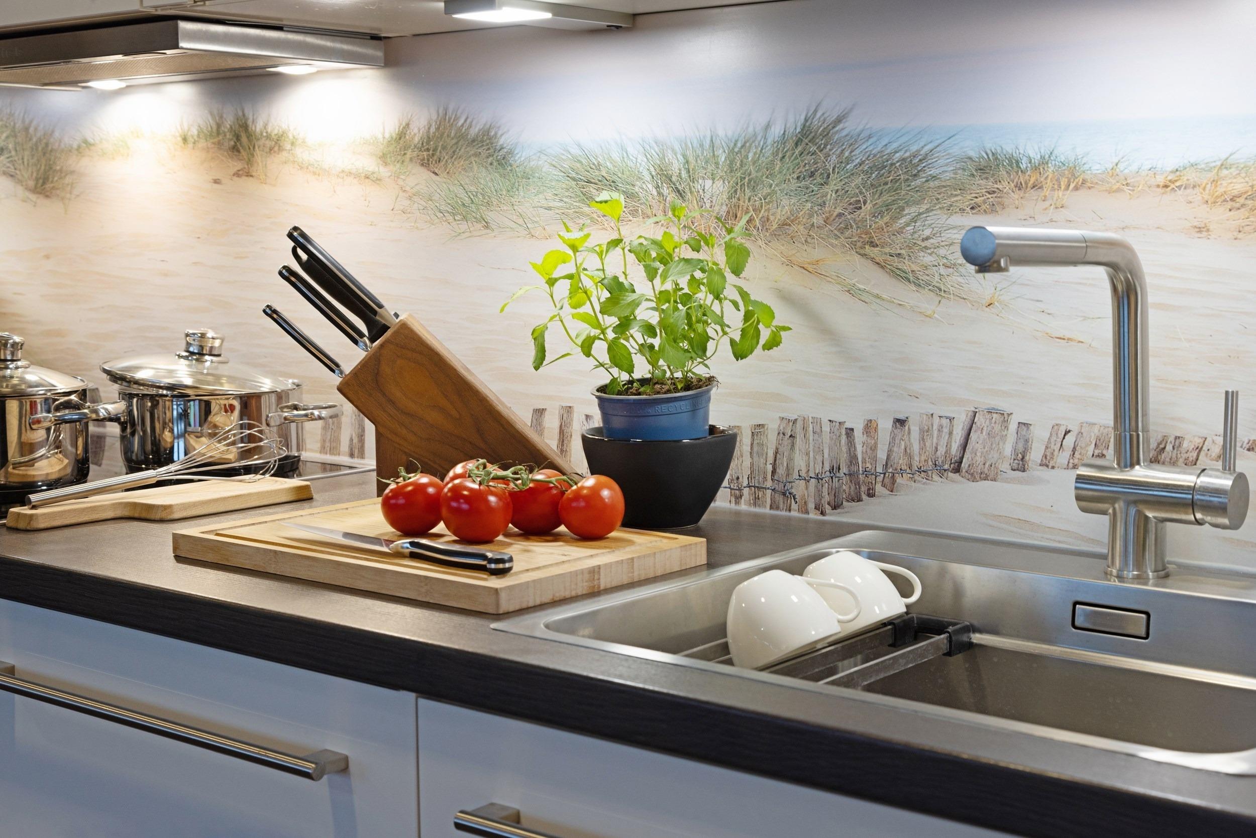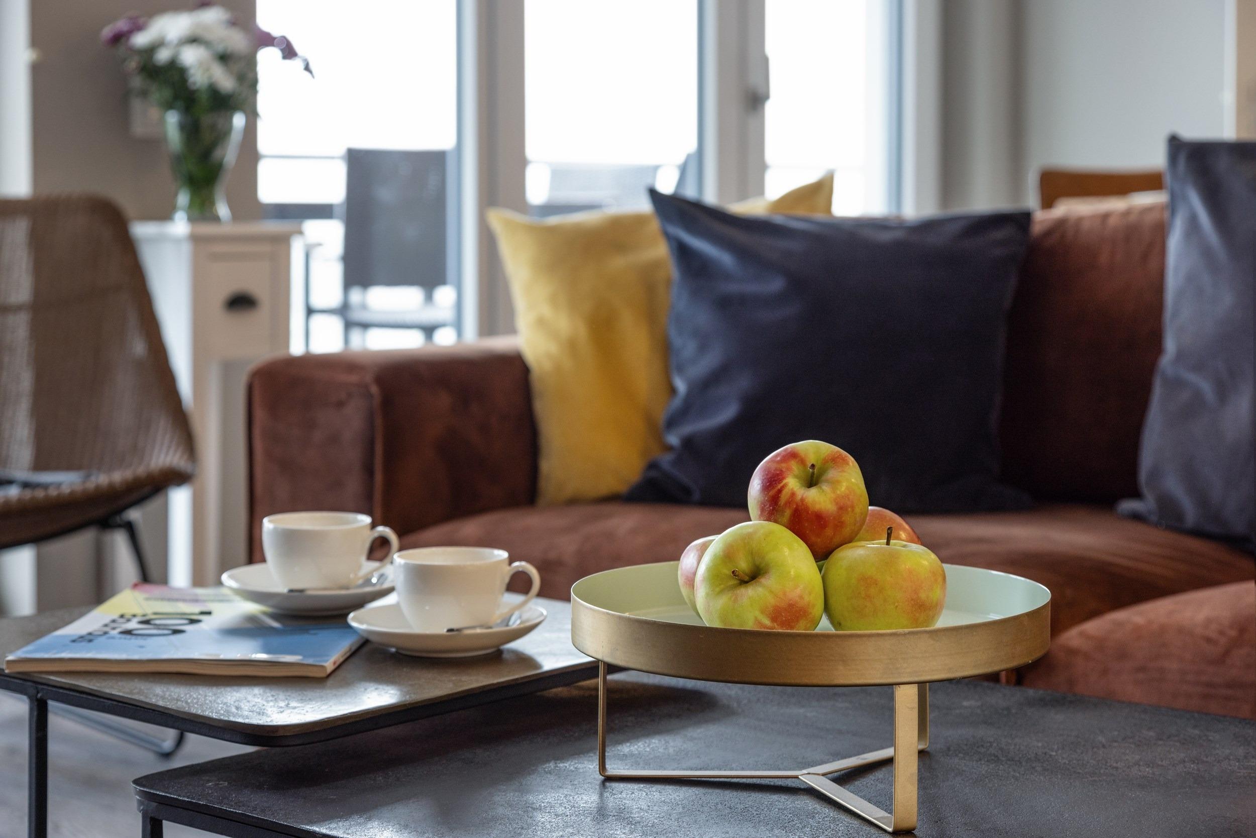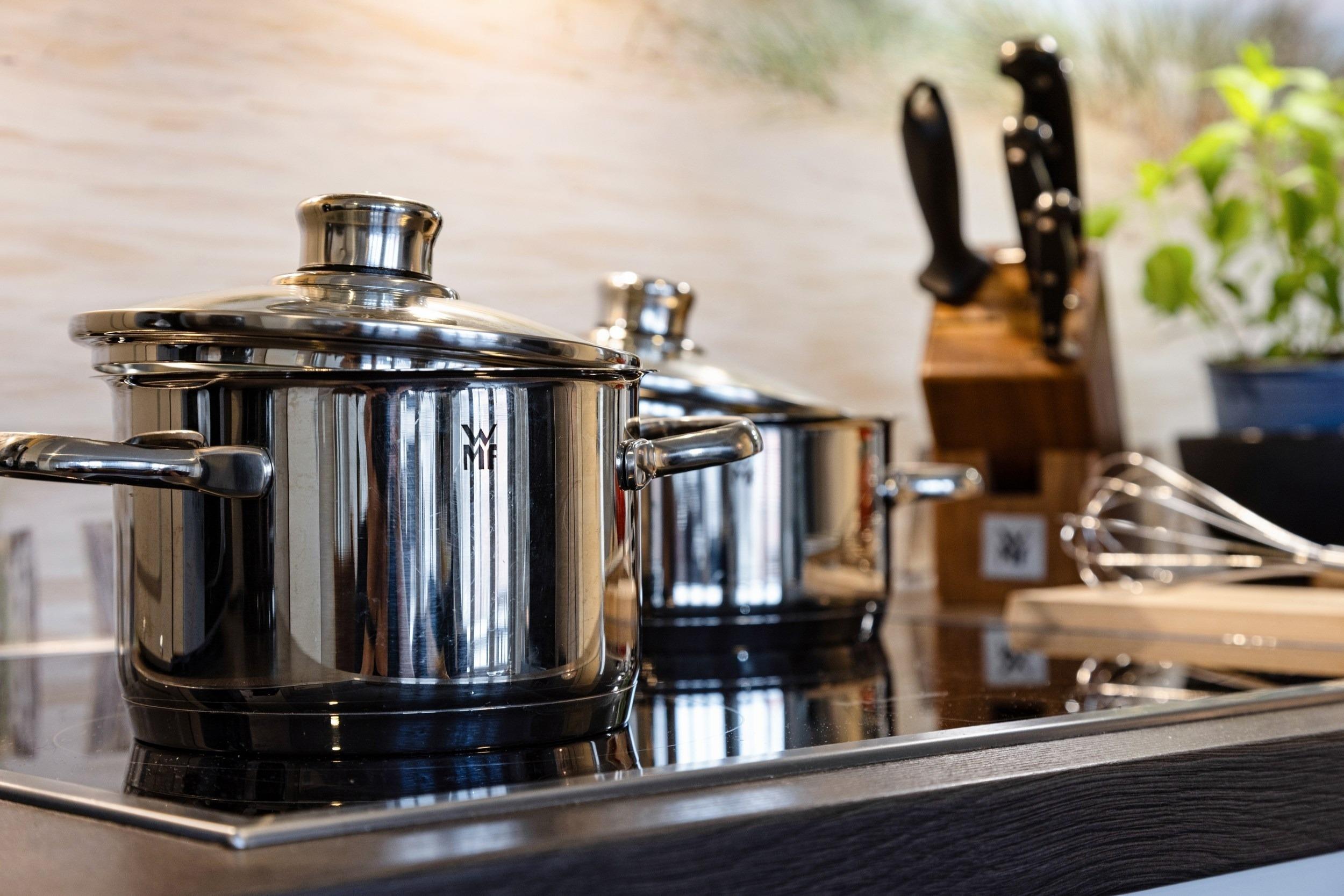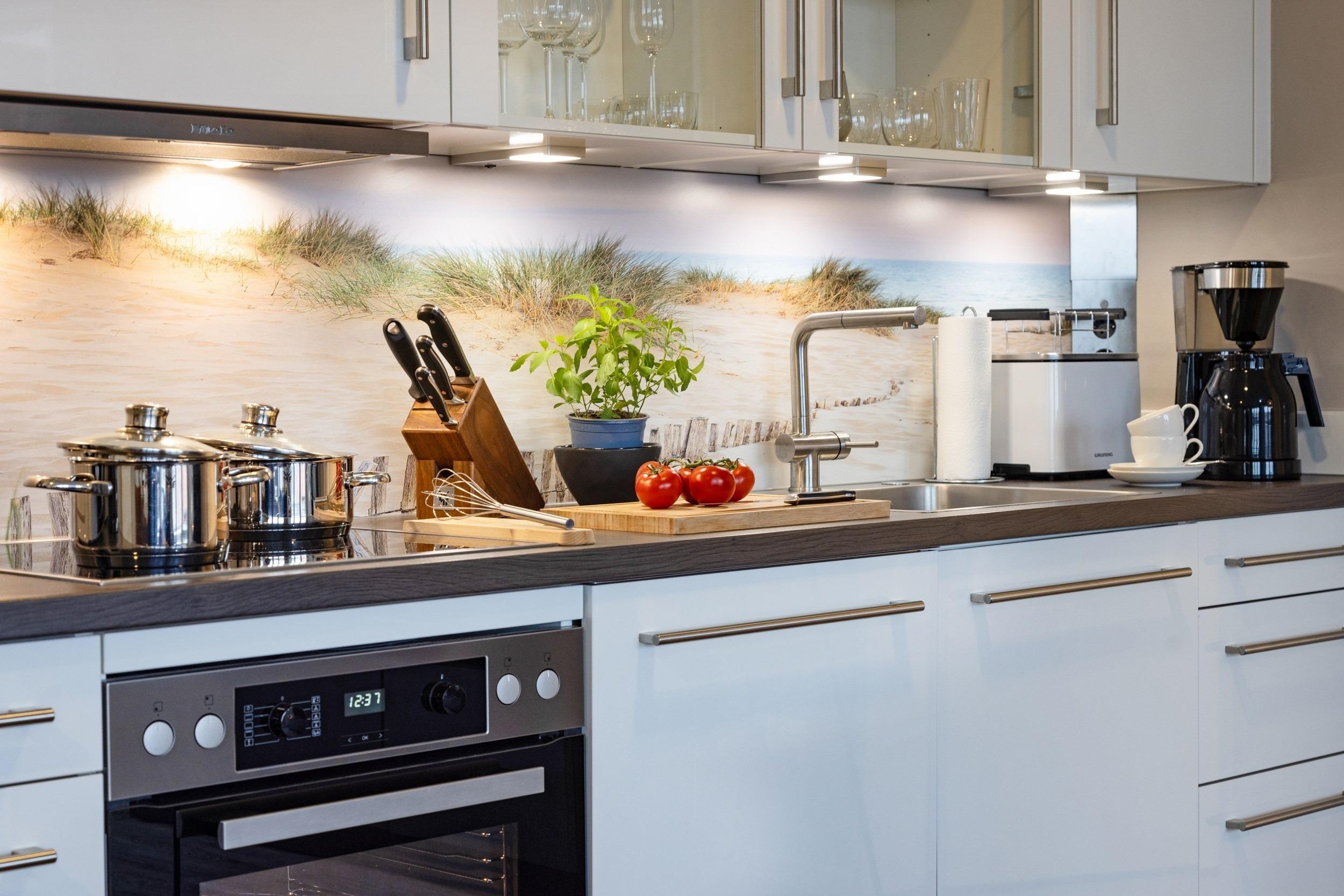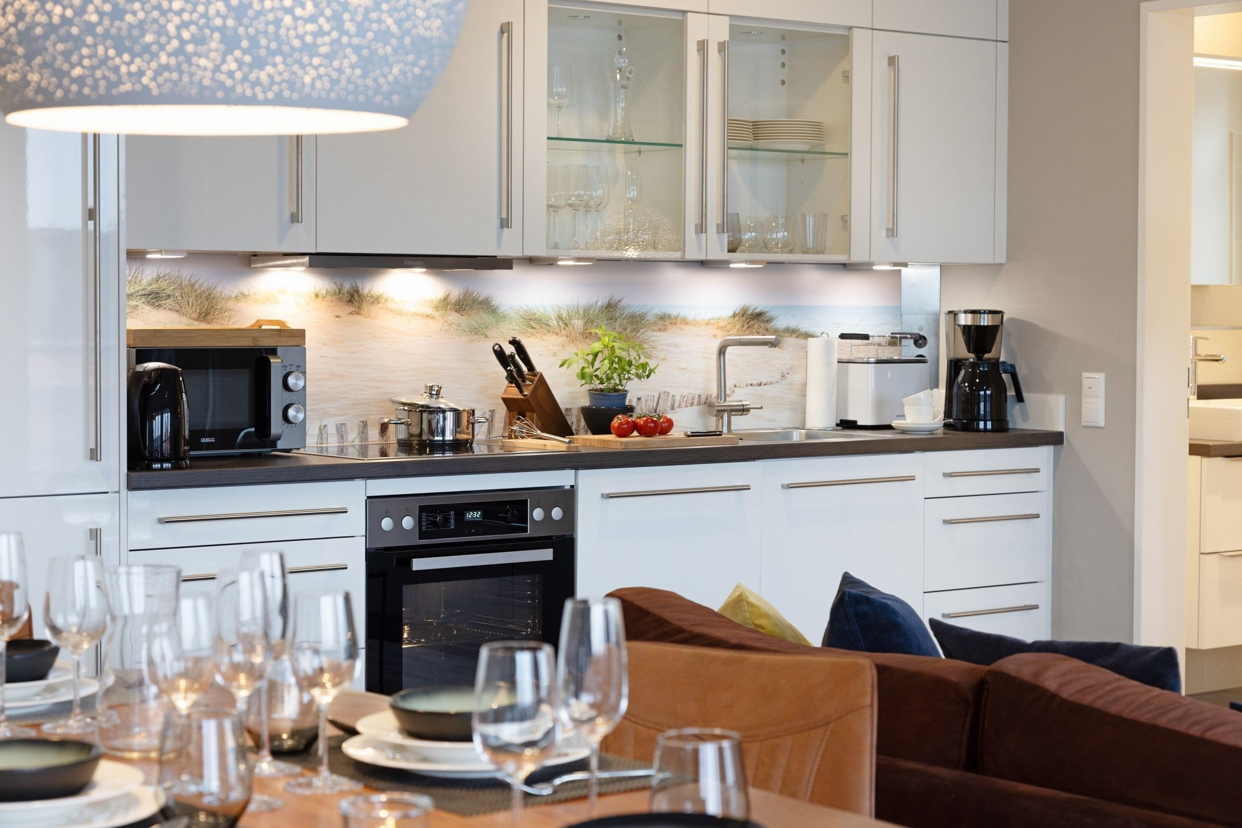 Ein weiteres Highlight der Wohnung ist der mit einer hochwertigen Marken-Komfortku¨che ausgestattete offene Wohn-/Essbereich. Hier ko¨nnen Sie jederzeit gemeinsam etwas Feines zubereiten. Die hochwertige hochgla¨nzende Weißlack-Ku¨che verfu¨gt u¨ber einen programmierbaren Backofen, eine Mikrowelle, einen Herd mit vier Ceran-Kochfeldern, großvolumige Mu¨lltrennungs-Schubfa¨cher unter der Design-Spu¨le, eine Spu¨lmaschine mit Timerfunktion, einen gera¨umigen Ku¨hlschrank sowie einen separaten 68l Gefrierschrank fu¨r Ihre Tiefku¨hlvorra¨te (Markengera¨te). Kaffeetrinker ko¨nnen zwischen einer TASSIMO-Kapselmaschine, einer Filterkaffeemaschine oder einer Handkaffeemaschine (French Press) wa¨hlen. Zur Vollausstattung geho¨ren zudem folgende Gera¨te: Milchaufscha¨umer, Handru¨hrgera¨t, Stabmixer, WMF-Messerblock, Wasserkocher, WMF-Toaster, Eierkocher, RO¨SLE-Salatschleuder, Design-Nussknacker, Knoblauchpresse, Kartoffelpresse, WMF-Korkenzieher und vieles mehr. Fu¨r Ihren leckeren selbst gebackenen Kuchen stehen Ihnen Backformen, Kuchengeschirr mit passendem Besteck sowie Schaber, Mixer und weitere Utensilien zur Verfu¨gung. Hochwertige Gla¨ser, edles Geschirr von Villeroy [&] Boch, WMF-Kochmesser und WMF-Besteck, alles ausreichend bemessen fu¨r einen gleichzeitigen Spu¨lmaschinenbetrieb, runden das exkusive Angebot ab.