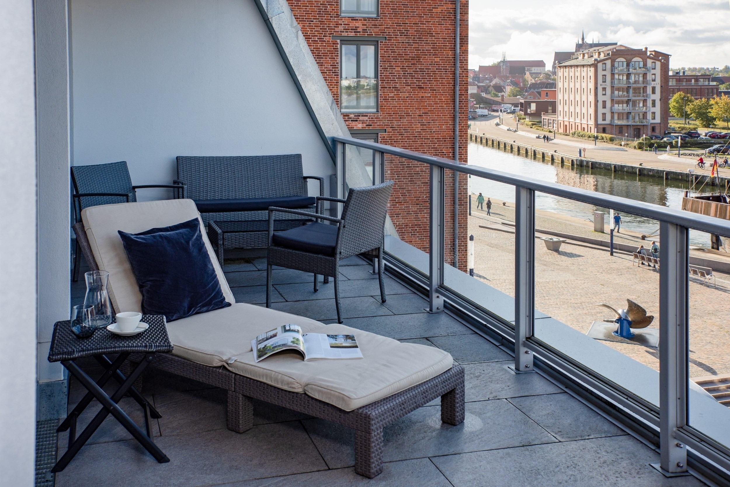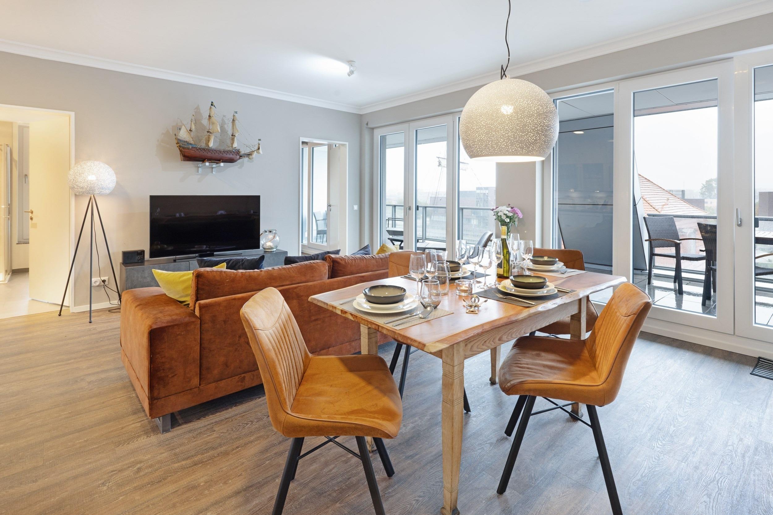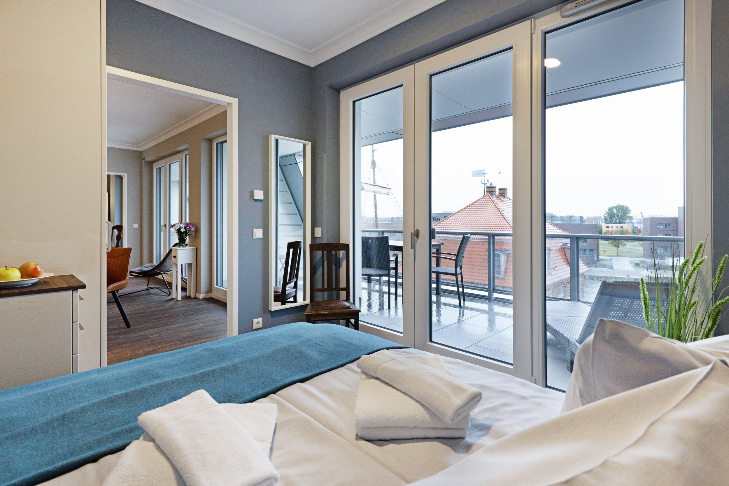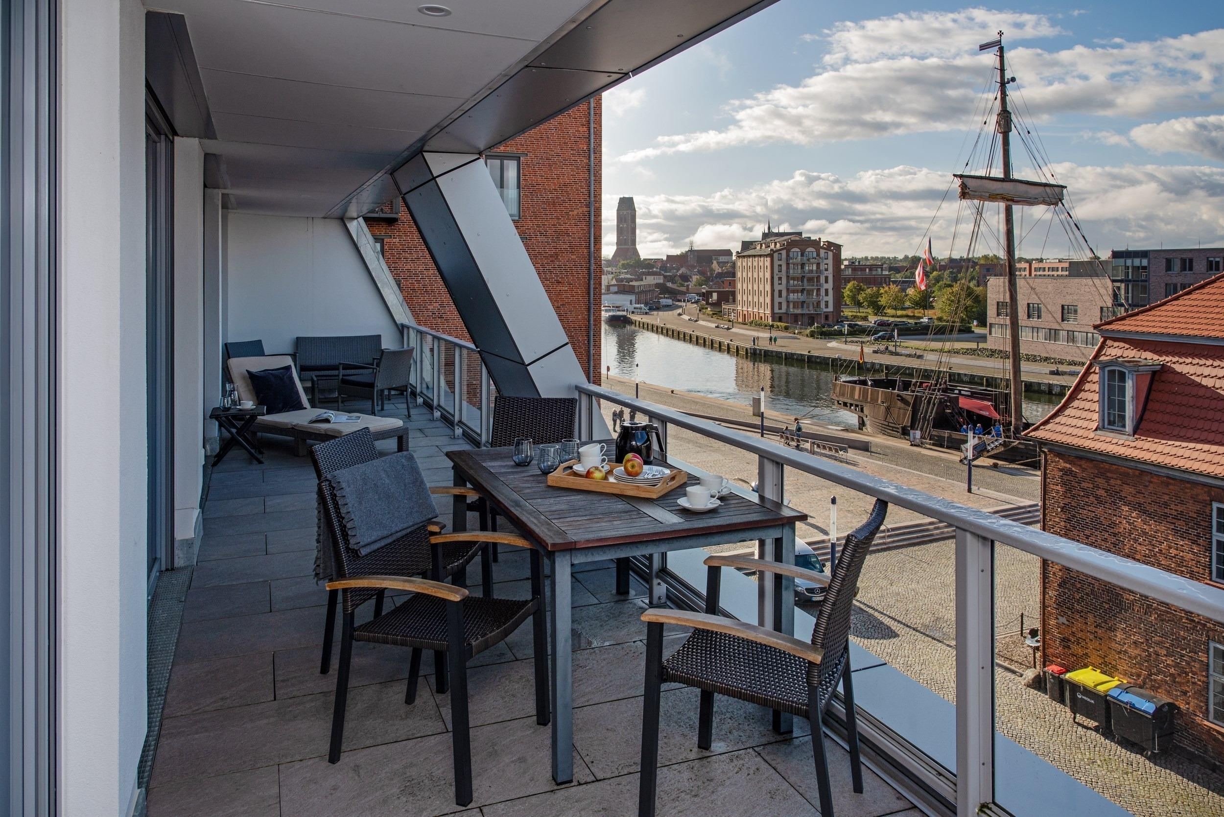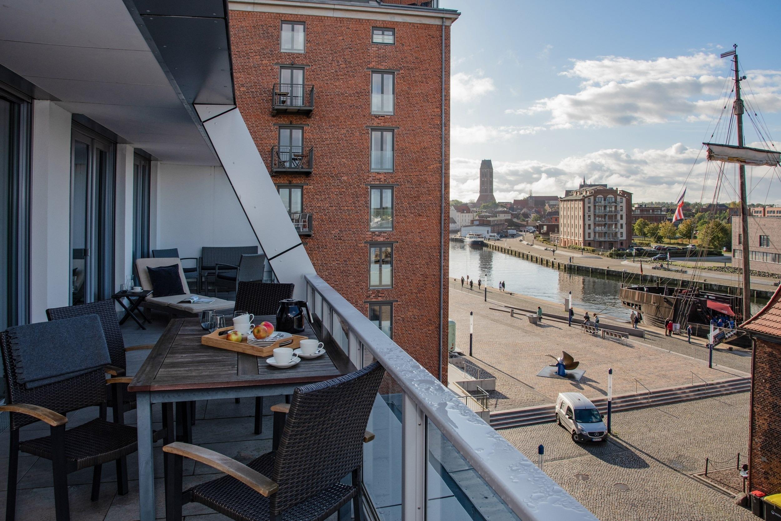 Bei uns wohnen Sie in der ersten Reihe in einmaliger Bestlage. Hier fa¨ngt Ihr Urlaub schon beim Aufschließen der Wohnungstu¨r an - eine Ferienwohnung fu¨r anspruchsvolle Genießer. Die optimal geschnittene, stylisch-behagliche Wohneinheit liegt im obersten Deck und wurde fu¨r Sie im nordisch-maritimen Stil eingerichtet. Hochwertige Materialien und Ausstattungselemente schaffen ein ausgleichendes und harmonisches Ambiente. Mit zwei separaten vollausgestatteten Schlafra¨umen bieten wir Ihnen auf gera¨umigen 66 m2 Wohnfla¨che viel Platz fu¨r bis zu 4 Ga¨ste. Den unbezahlbaren Blick auf den Hafen und das Meer ko¨nnen Sie in allen Aufenthaltsra¨umen genießen, in den Schlafzimmern sogar im Liegen. Die großartige teilu¨berdachte Loggia mit 24 m2 Aussichts- und Erholungsfla¨che im ho¨chsten Geschoss verwo¨hnt Sie mit einem atemberaubenden 180°Panorama-Ausblick aus luftiger Ho¨he u¨ber den gesamten Alten Hafen. An Backbord verfolgen Sie das Geschehen an der lebhaften Hafenpromenade vom gotischen „Wassertor“, dem alten Hafentor im Nordwesten des historischen Stadtkerns der Stadt, u¨ber den Liegeplatz der „Wissemara“, unserer beru¨hmten originalgetreuen Replik einer mittelalterlichen Hansekogge, bis hin zum bekannten Museum „Baumhaus“, von wo aus fru¨her die Hafeneinfahrt mit einer Sperrkette aus Baumstämmen vor Gefahren geschu¨tzt wurde. Steuerbords schweift Ihr Blick u¨ber den Alten Hafen hinaus bis weit hinein in die Wismarer Bucht. Erfreuen Sie sich bei Meereskla¨ngen und leichter Salzbrise an den ein- und ausfahrenden Schiffen und genießen Sie wohltuenden Sonnenschein bis weit in die Abendstunden. Erleben Sie grandiose Ausblicke u¨ber den Da¨chern von Wismar. Was ko¨nnte es Scho¨neres geben, als Ihren Morgen an der Ostsee unter freiem Himmel mit duftendem Kaffee und frischen Bro¨tchen zu beginnen und Ihren entspannten Urlaubstag spa¨ter bei einem erlesenen Wein gelassen in der Abendsonne ausklingen zu lassen?