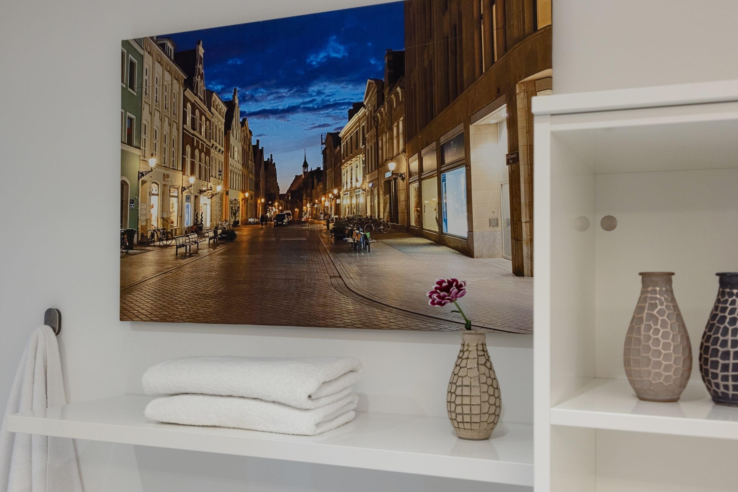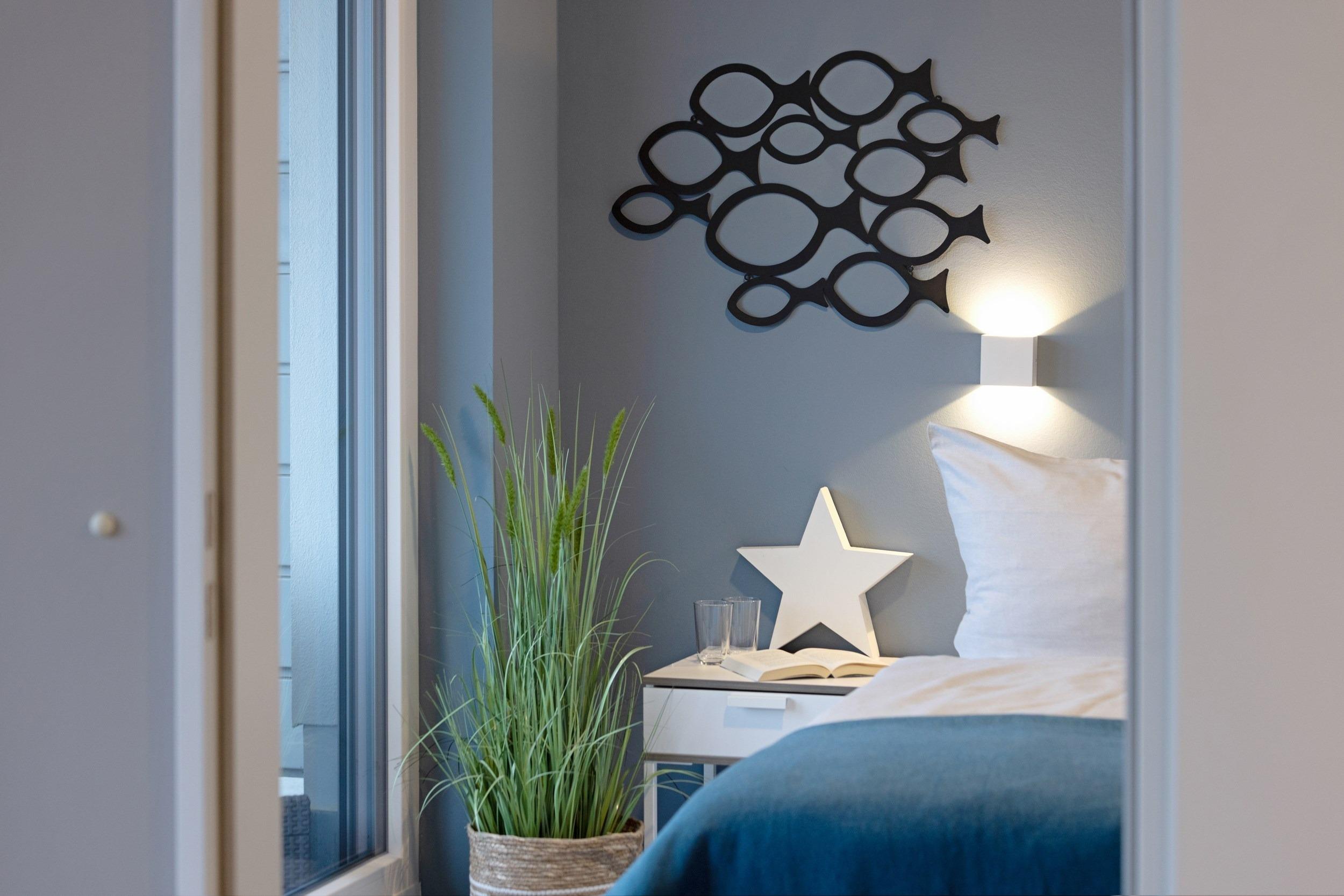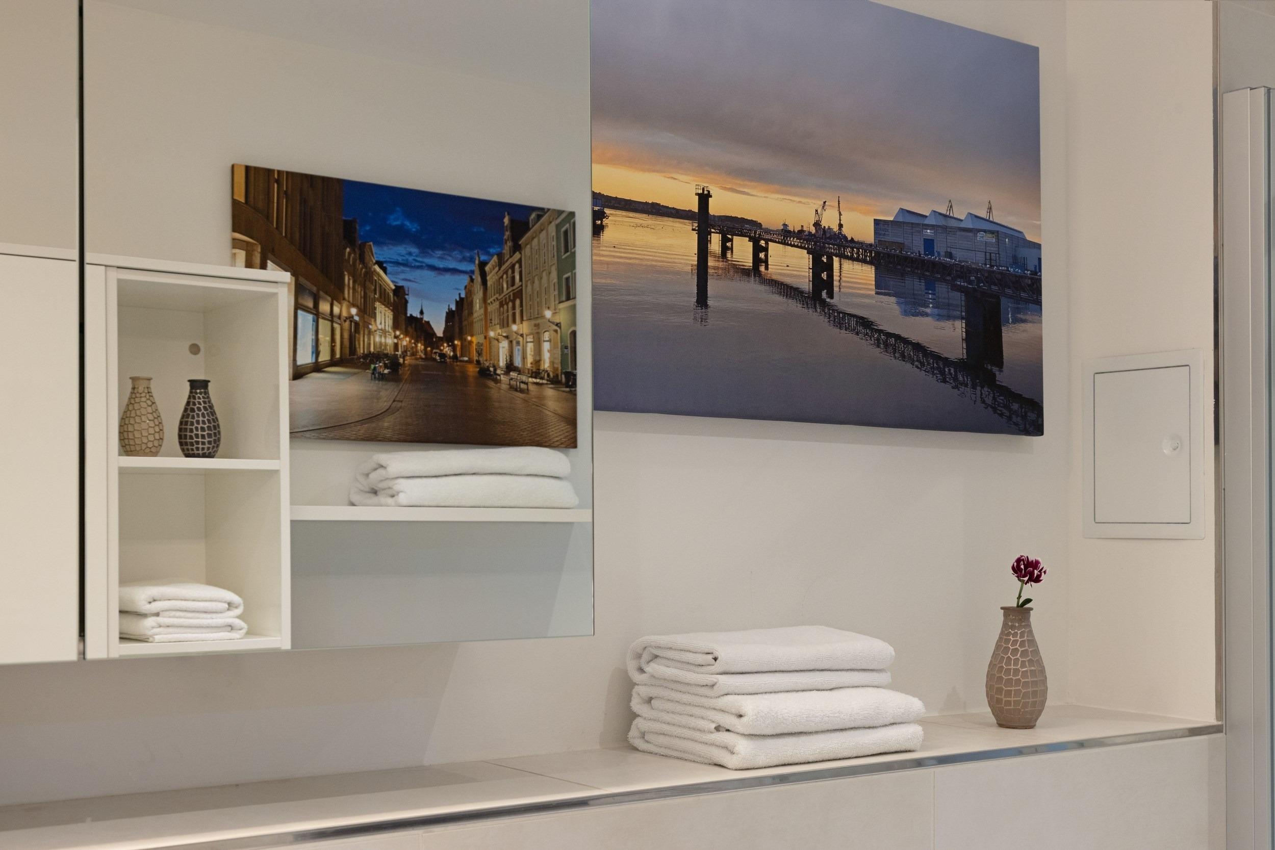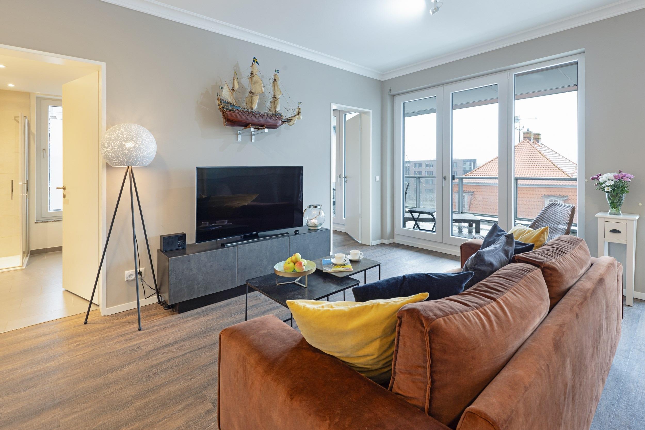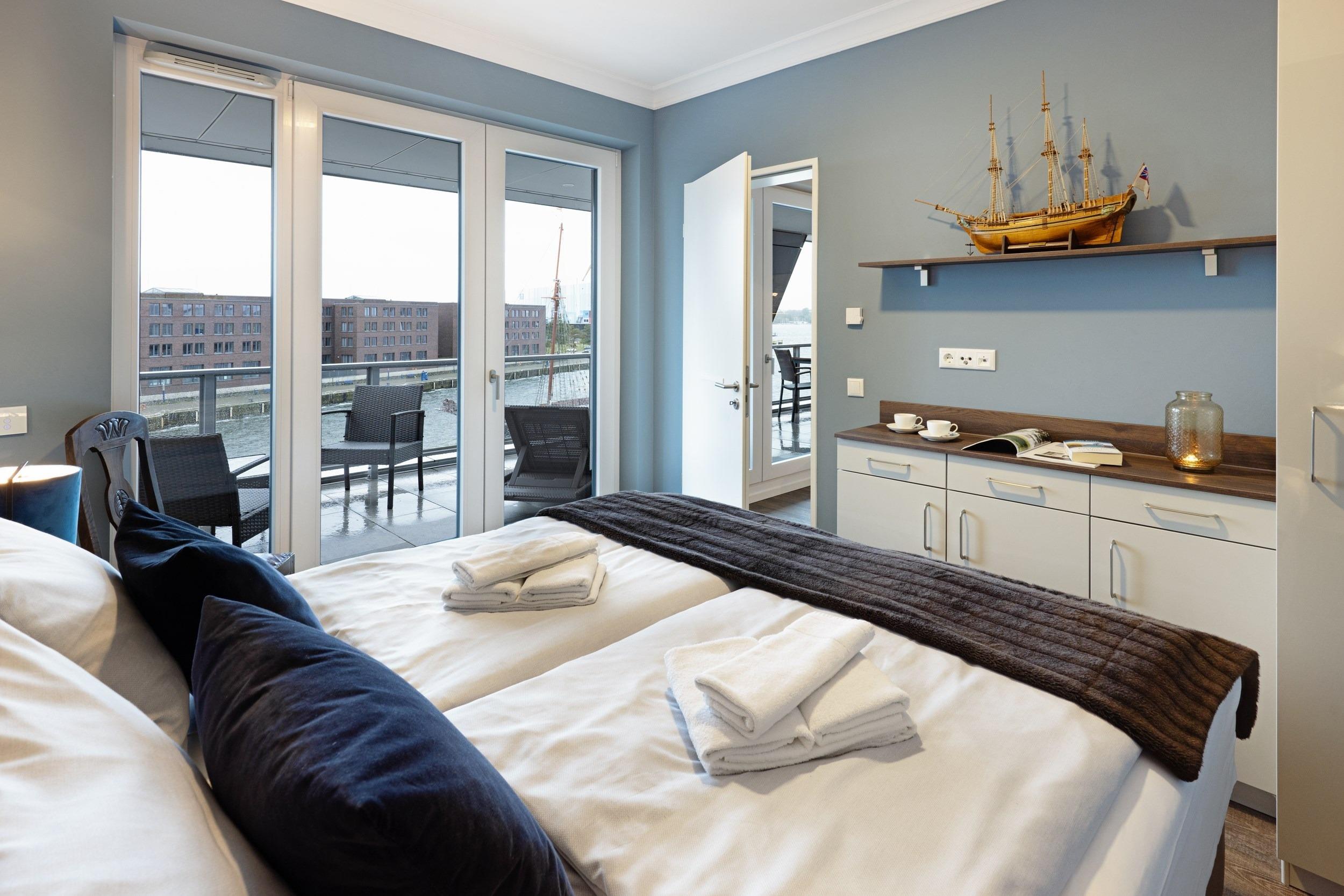 Bei uns wohnen Sie in der ersten Reihe in einmaliger Bestlage. Hier fa¨ngt Ihr Urlaub schon beim Aufschließen der Wohnungstu¨r an - eine Ferienwohnung fu¨r anspruchsvolle Genießer. Die optimal geschnittene, stylisch-behagliche Wohneinheit liegt im obersten Deck und wurde fu¨r Sie im nordisch-maritimen Stil eingerichtet. Hochwertige Materialien und Ausstattungselemente schaffen ein ausgleichendes und harmonisches Ambiente. Mit zwei separaten vollausgestatteten Schlafra¨umen bieten wir Ihnen auf gera¨umigen 66 m2 Wohnfla¨che viel Platz fu¨r bis zu 4 Ga¨ste. Den unbezahlbaren Blick auf den Hafen und das Meer ko¨nnen Sie in allen Aufenthaltsra¨umen genießen, in den Schlafzimmern sogar im Liegen. Die großartige teilu¨berdachte Loggia mit 24 m2 Aussichts- und Erholungsfla¨che im ho¨chsten Geschoss verwo¨hnt Sie mit einem atemberaubenden 180°Panorama-Ausblick aus luftiger Ho¨he u¨ber den gesamten Alten Hafen. An Backbord verfolgen Sie das Geschehen an der lebhaften Hafenpromenade vom gotischen „Wassertor“, dem alten Hafentor im Nordwesten des historischen Stadtkerns der Stadt, u¨ber den Liegeplatz der „Wissemara“, unserer beru¨hmten originalgetreuen Replik einer mittelalterlichen Hansekogge, bis hin zum bekannten Museum „Baumhaus“, von wo aus fru¨her die Hafeneinfahrt mit einer Sperrkette aus Baumstämmen vor Gefahren geschu¨tzt wurde. Steuerbords schweift Ihr Blick u¨ber den Alten Hafen hinaus bis weit hinein in die Wismarer Bucht. Erfreuen Sie sich bei Meereskla¨ngen und leichter Salzbrise an den ein- und ausfahrenden Schiffen und genießen Sie wohltuenden Sonnenschein bis weit in die Abendstunden. Erleben Sie grandiose Ausblicke u¨ber den Da¨chern von Wismar. Was ko¨nnte es Scho¨neres geben, als Ihren Morgen an der Ostsee unter freiem Himmel mit duftendem Kaffee und frischen Bro¨tchen zu beginnen und Ihren entspannten Urlaubstag spa¨ter bei einem erlesenen Wein gelassen in der Abendsonne ausklingen zu lassen?