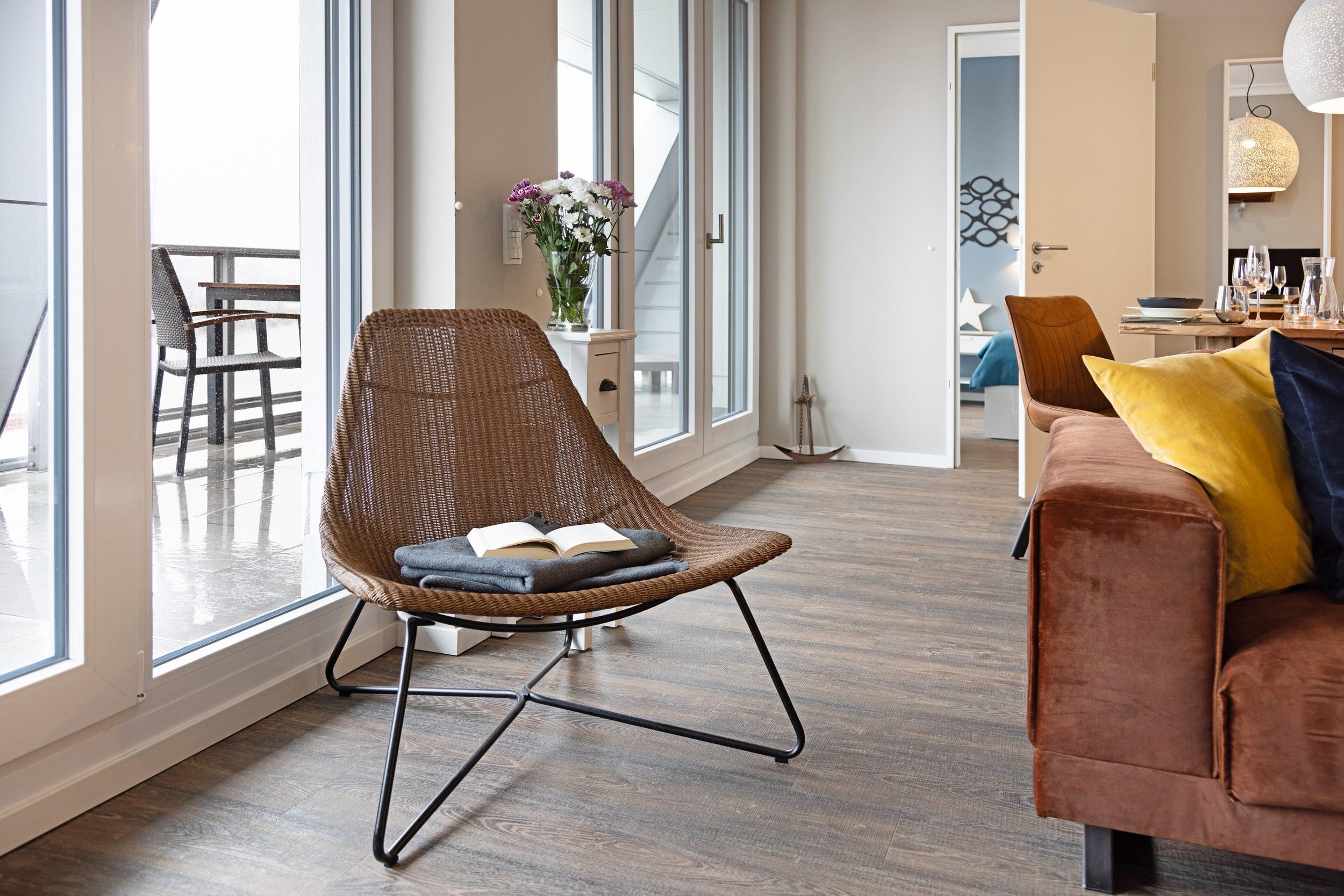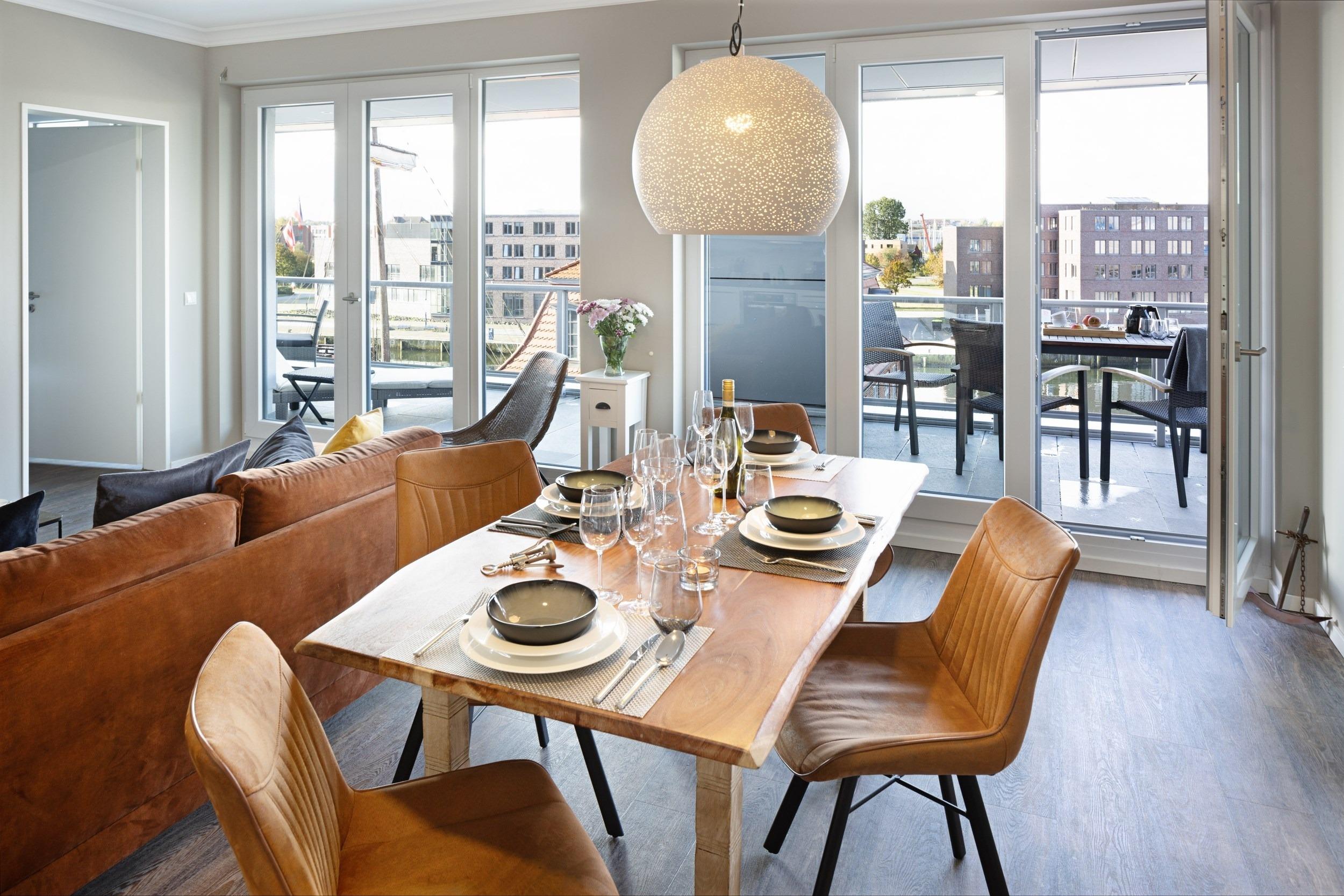 Es empfa¨ngt Sie der mit viel Liebe zum Detail ausgestattete lichtdurchflutete und luftige Wohnbereich mit zwei bodentiefen Doppelflu¨gel- Fenstertu¨ren zur Dachterrasse (Ausfu¨hrung „Stulp“, d. h. vollfla¨chig zu o¨ffnen ohne Mittelpfosten). Auch aus den Schlafzimmern gelangen Sie u¨ber die Doppelflu¨geltu¨ren direkt auf Ihre sichtgeschu¨tzte Sonnenterrasse in Su¨d-West-Lage. Die saisonal mit Lounge-Mo¨beln, bequemen Liegen und einem Esstisch mit vier Stu¨hlen mo¨blierte Loggia la¨dt Sie zum chilligen Ausspannen ein. Freuen Sie sich auf kulinarische Genu¨sse unter freiem Himmel, genießen Sie den lauen Sommerabend mit spektakula¨rer Aussicht bei einer sanften Brise und einem ku¨hlen Getra¨nk. Da Sie direkt im Alten Hafen logieren, ko¨nnen Sie auf der Terrasse je nach Windrichtung dem Rauschen des Meeres lauschen. Riechen und schmecken Sie unsere wohltuende Meeresbrise. Das Terrassenmobiliar inklusive passender Auflagen steht Ihnen ganzja¨hrig zur Verfu¨gung.