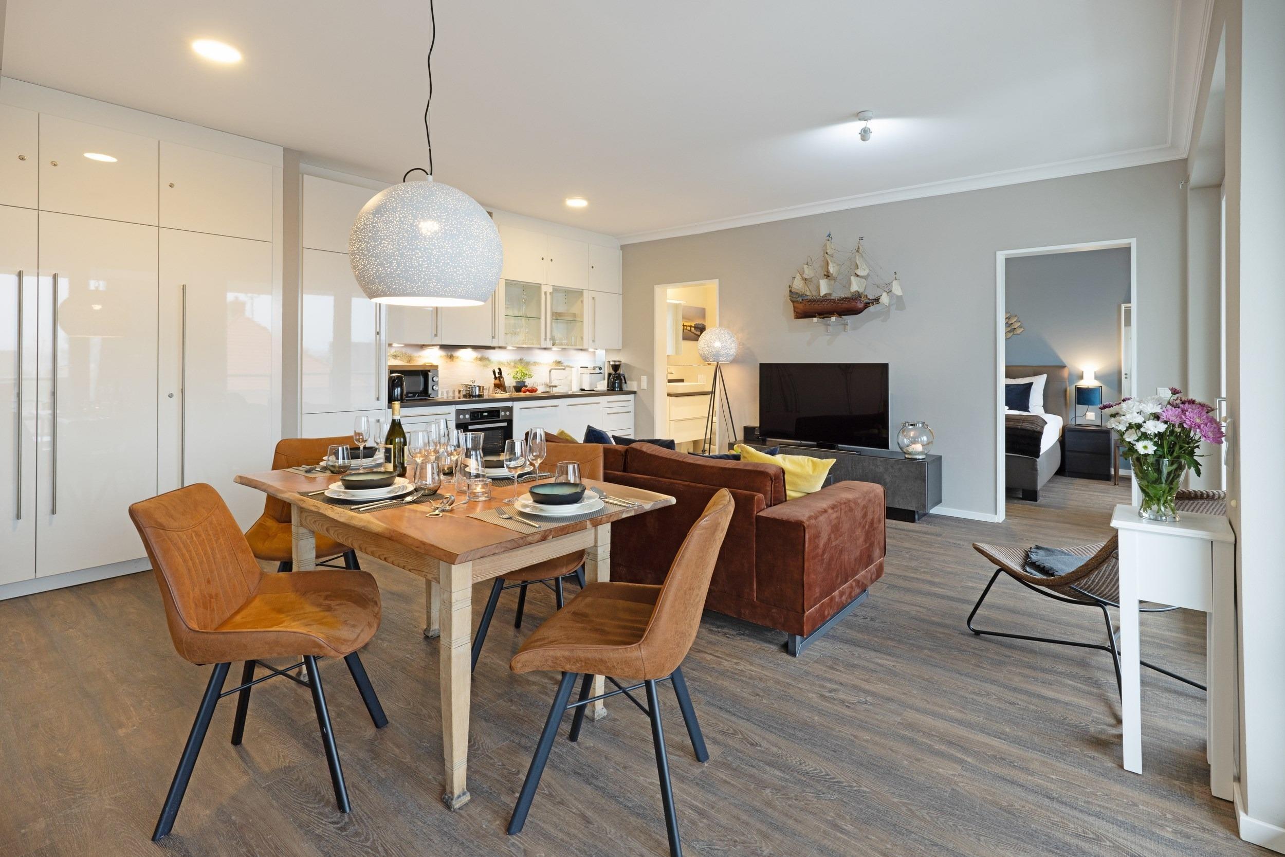 Am urigen Esstisch aus massivem Naturholz ko¨nnen bis zu sechs Personen beisammen sitzen, essen, trinken, spielen, schnacken. Der charmante Wohnbereich besticht durch das großvolumige Relax-Sofa und la¨dt zum la¨ssigen Verweilen im geselligen Kreis von Freunden und Familie ein. Dort sorgt ein hochwertiges 55 Zoll-Smart-TV (SAMSUNG) fu¨r Information und Unterhaltung. Fu¨r ein kabelloses Klangerlebnis nutzen Sie die Bluetooth- Music-Box. Genießen Sie unser kostenfreies WLAN-Internet und loggen Sie sich wie zu Hause jederzeit in Ihre bevorzugten Streaming-Portale von Prime, Sky, Netflix usw. ein.