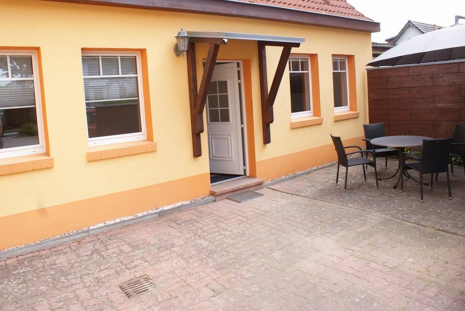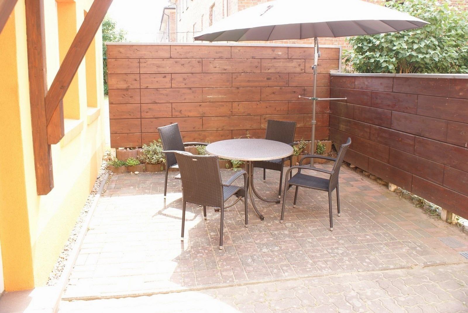 - eigene Terrasse mit Sitzmöbel, Tisch und großen Sonnenschirm