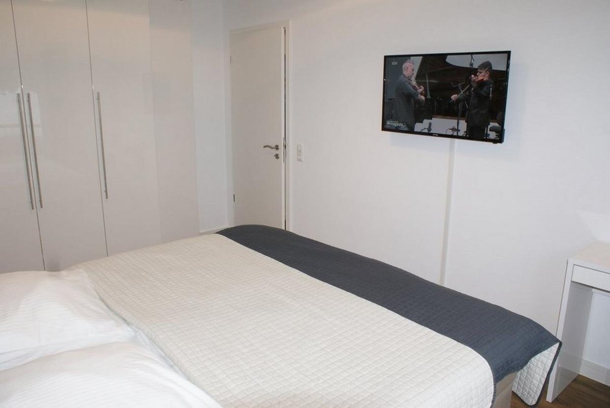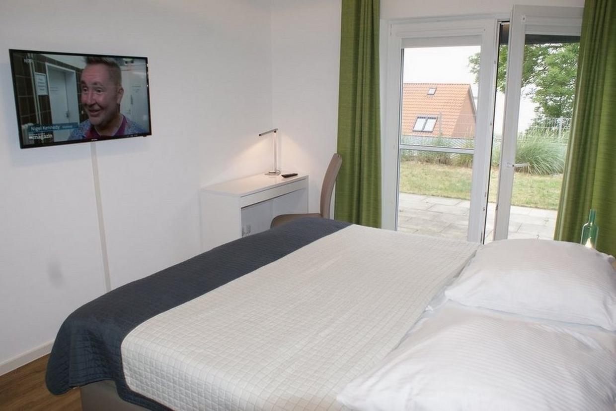 - getrenntes Schlafzimmer mit großem Doppelbett (Boxspringbett), Flat-TV, Kleiderschrank, Zugang zur Terrasse und Blick auf Wismarer Bucht