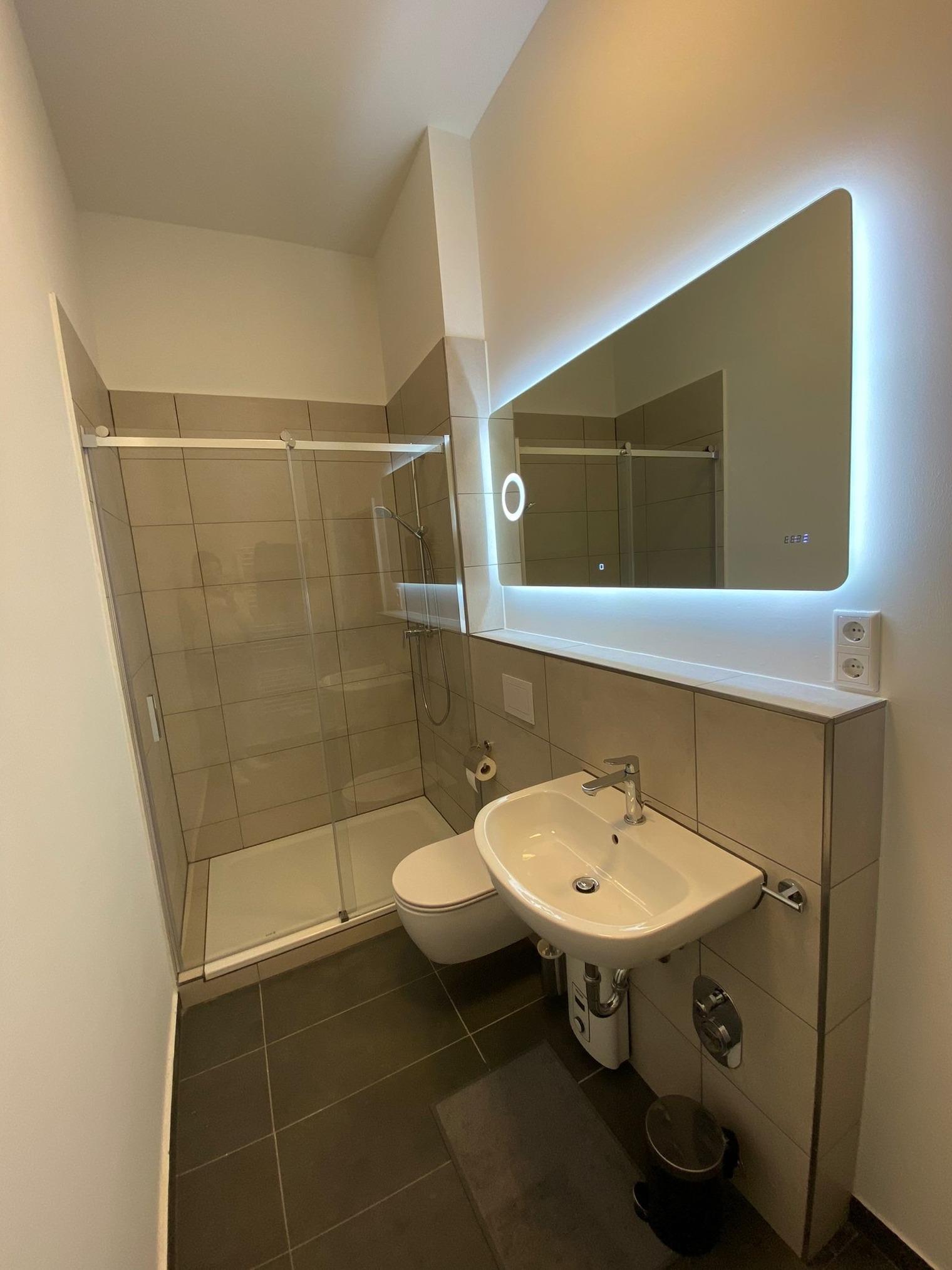 - Badezimmer mit begehbarer Dusche, WC, Waschbecken, Spiegel