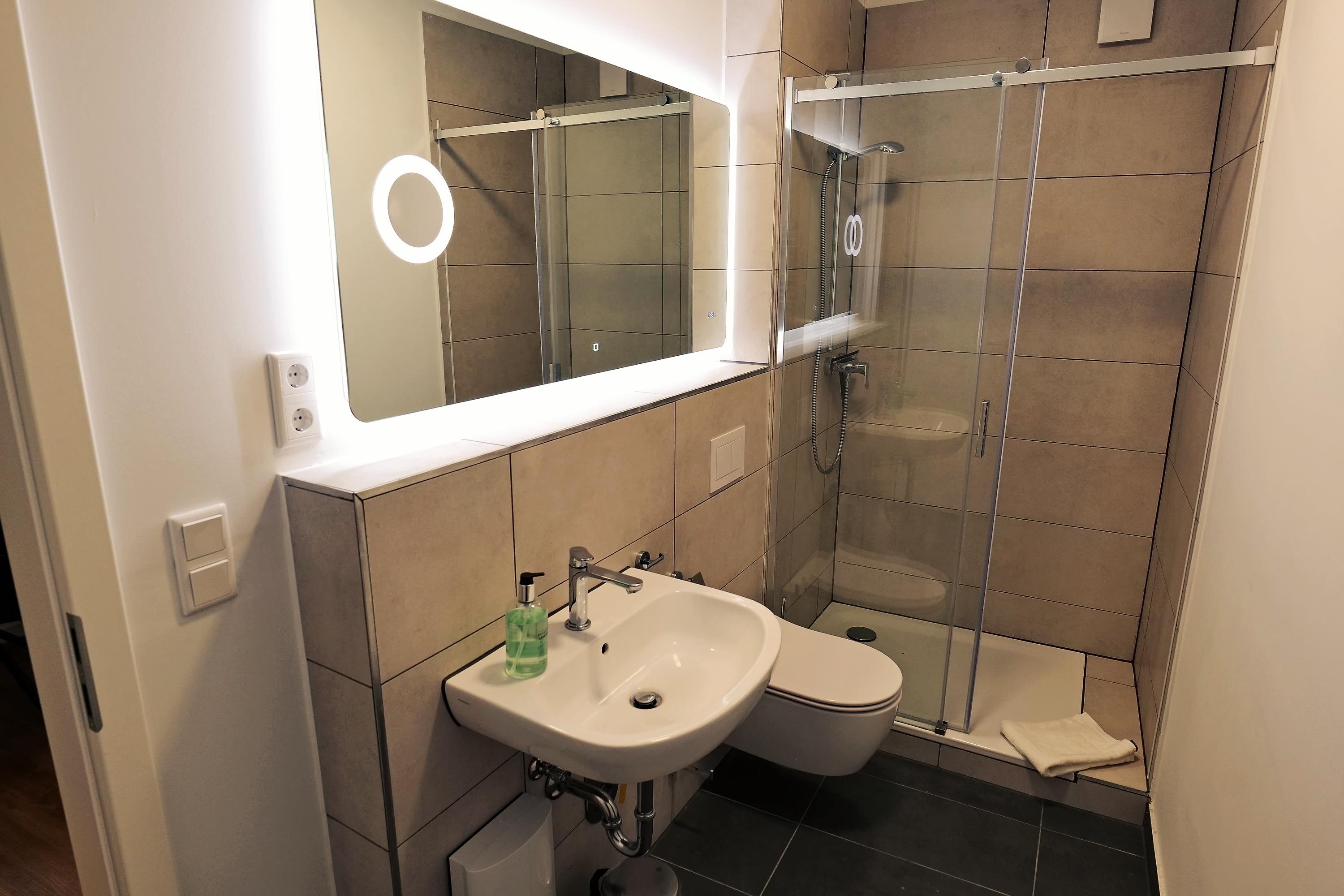 - Badezimmer mit begehbarer Dusche, WC, Waschbecken, Spiegel