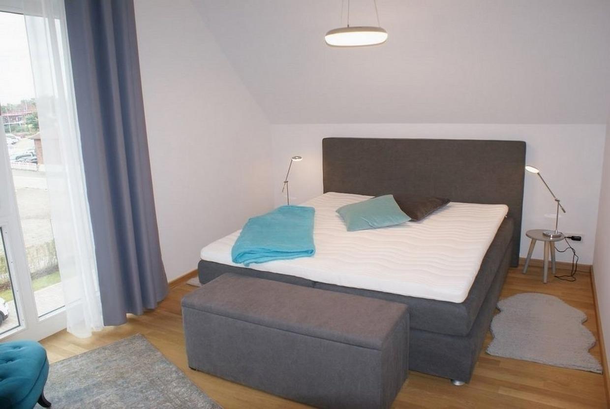- Schlafzimmer mit gemütlichen Boxspring-Doppelbett (1,80 x 2,00 Meter), großer Kleiderschrank und Sessel