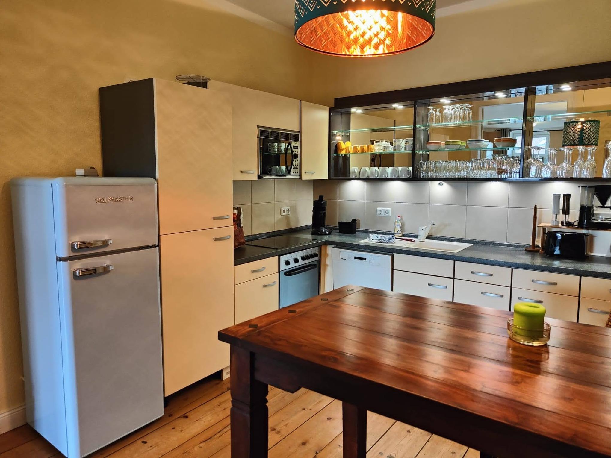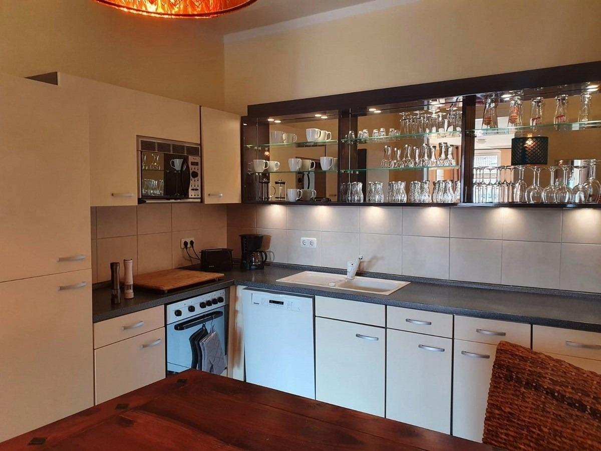 - Küche vollausgestattet u.a. mit Geschirrspüler, Backofen, Ceranfeld, Mikrowelle, Kaffeemaschine, Geschirr, Besteck, Gläser, Kühlschrank mit Gefrierteil