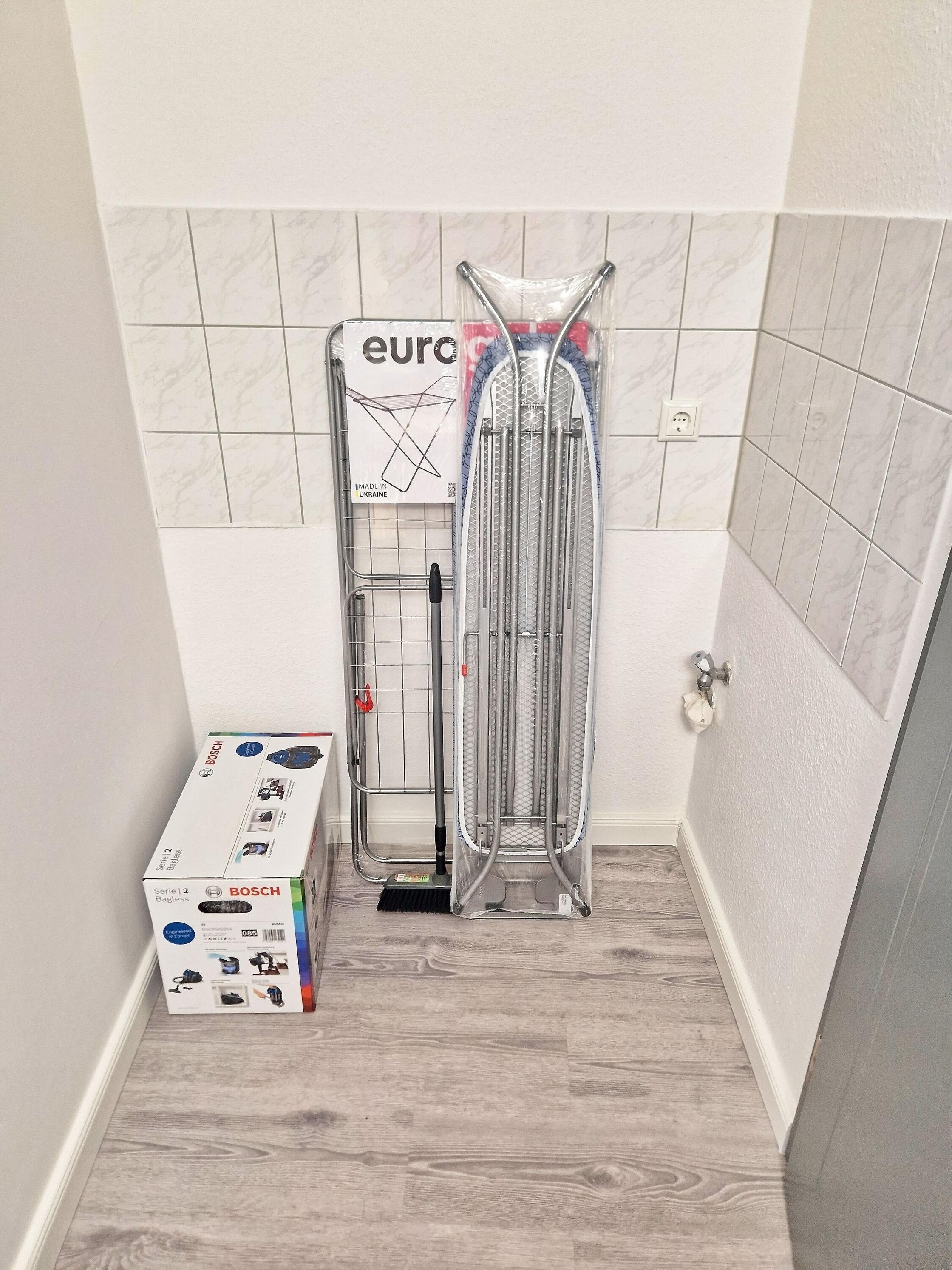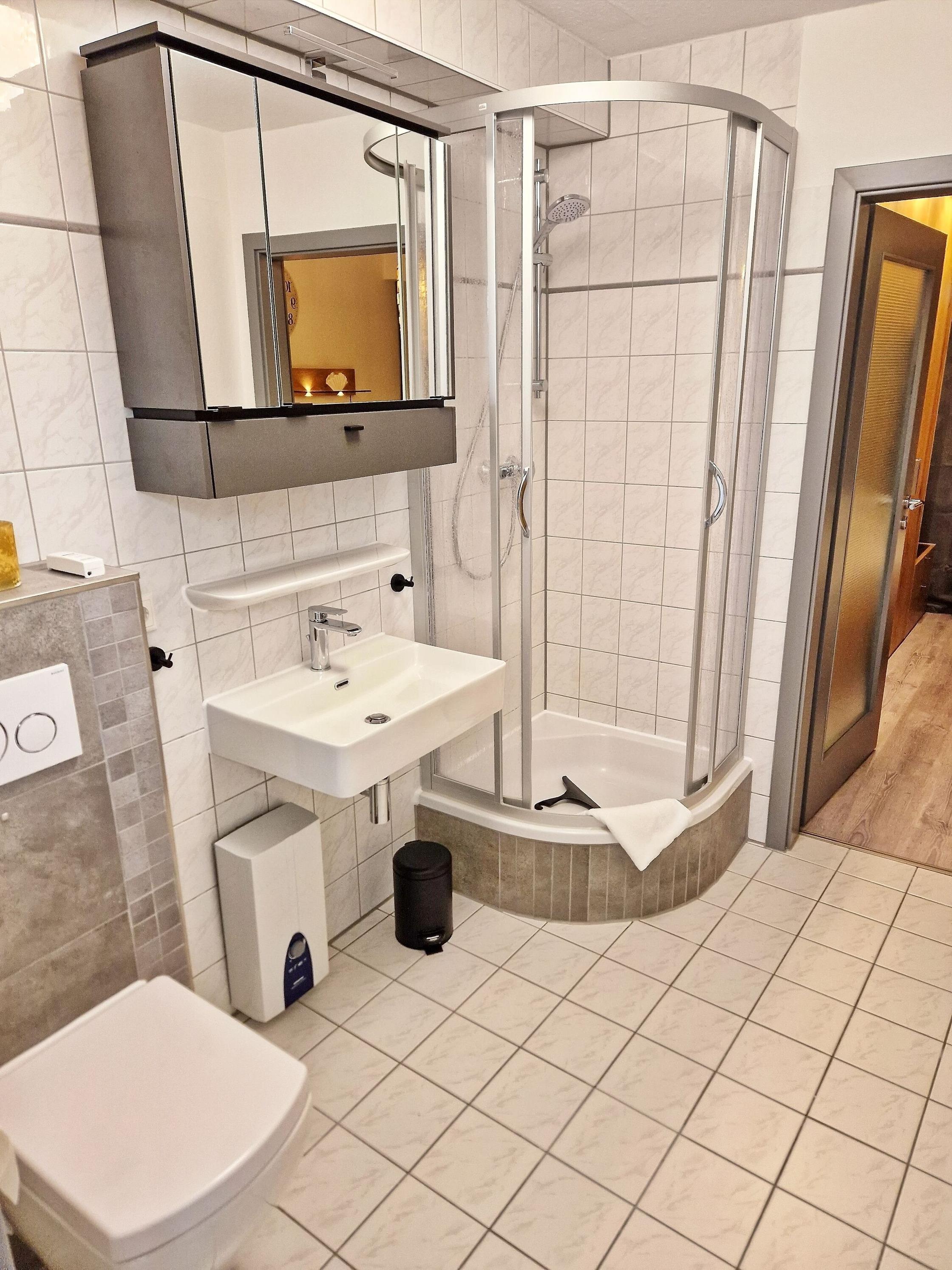 Schickes Badezimmer mit Dusche, WC, Spiegel und ausreichend Ablagefläche für Ihre Beautyutensilien. Ein Wäscheständer sind vorhanden.