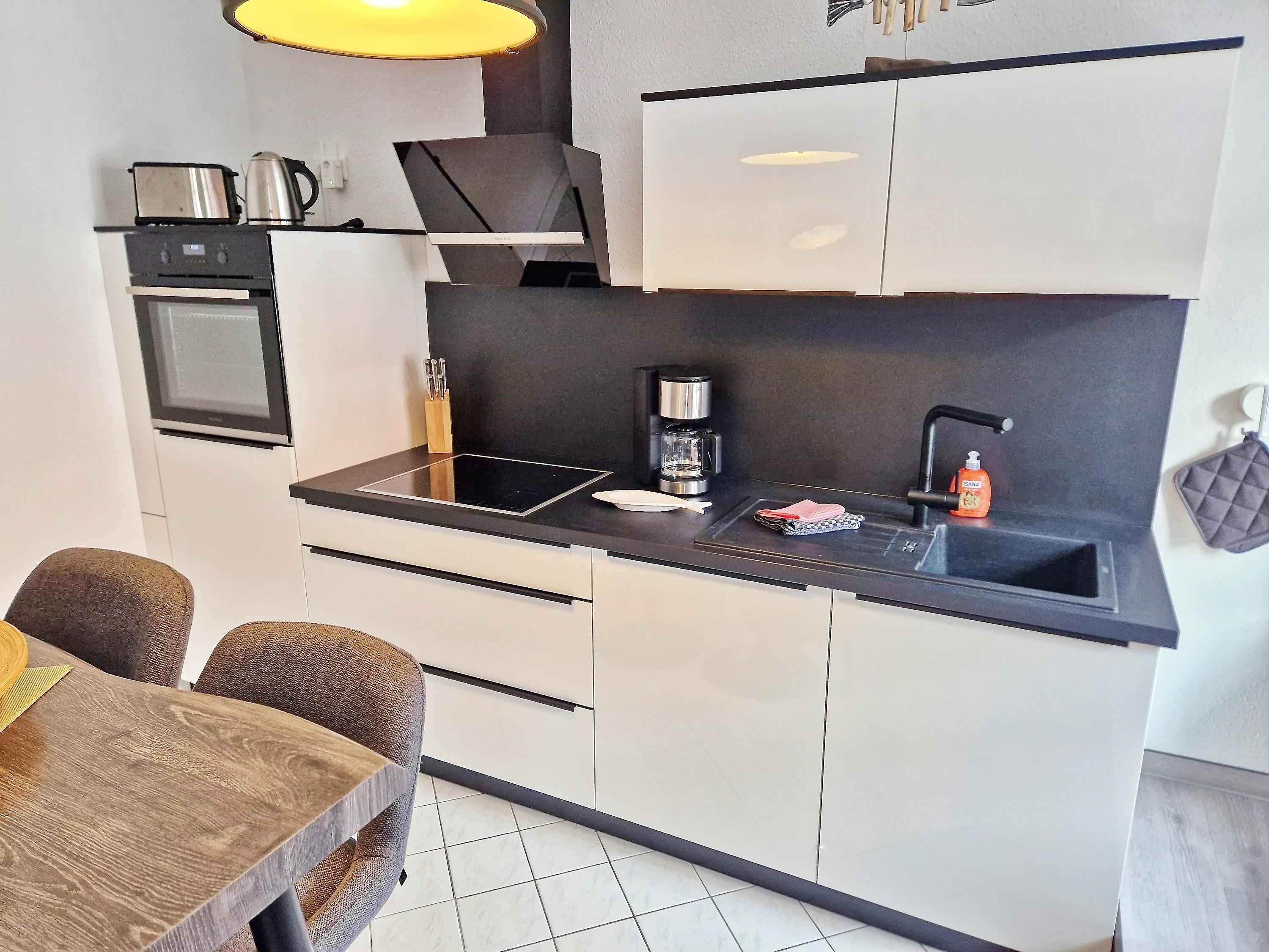 offene moderne Küche mit Backofen, Ceranherd, Wasserkocher, Kaffeemaschine, Geschirrspüler, Kühlschrank, Toaster, Geschirr, Gläser, Besteck uvm..