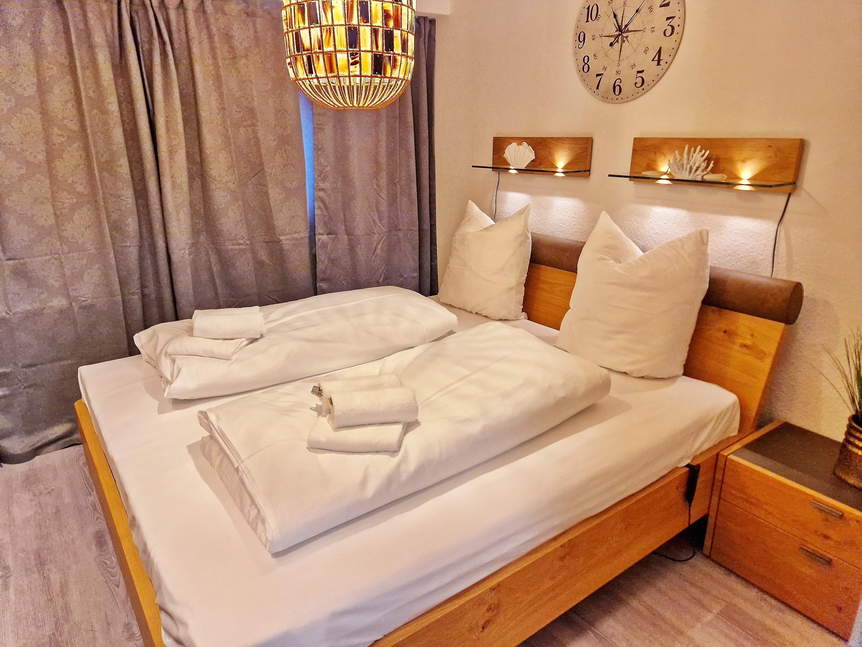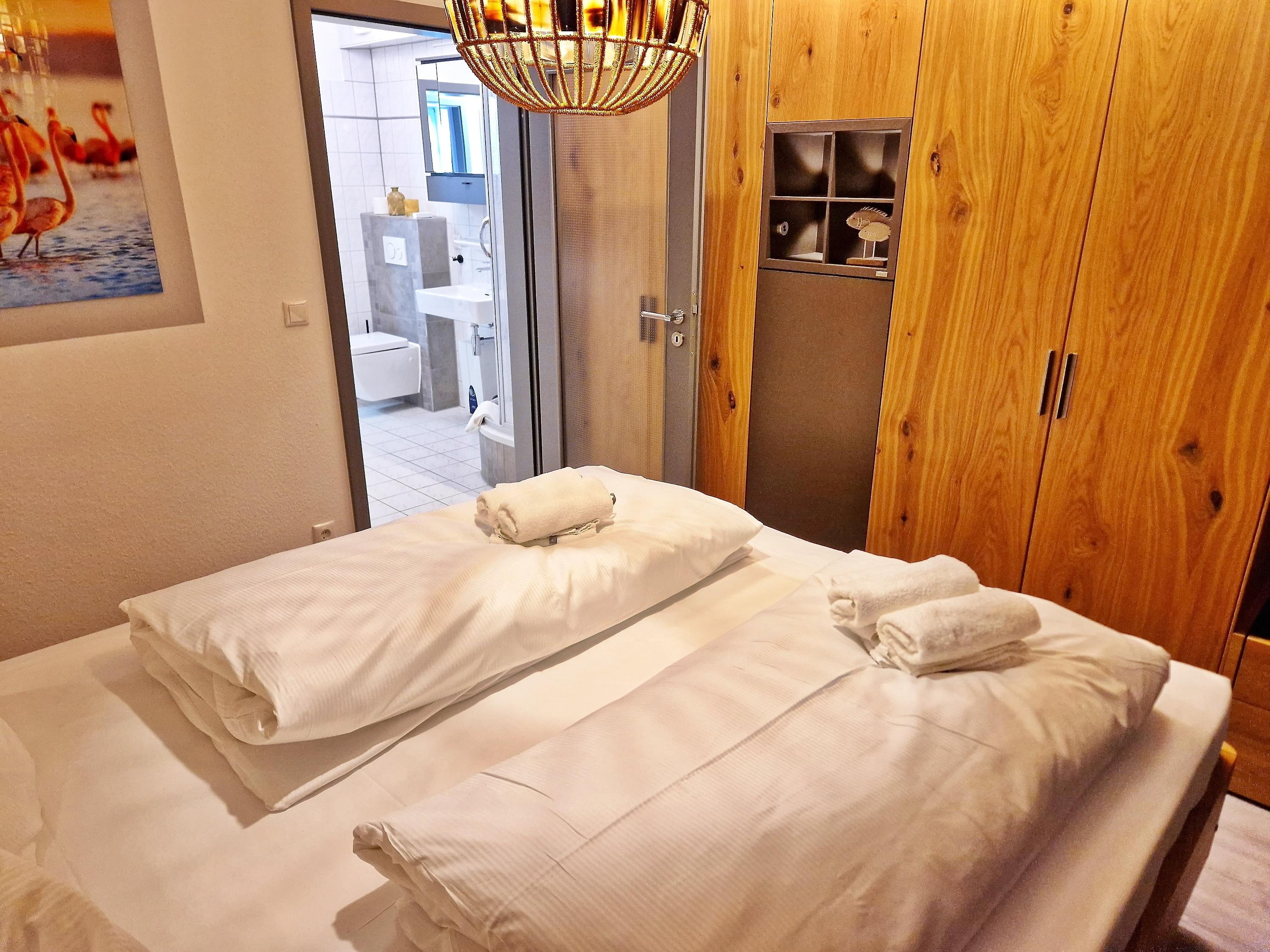 1 Schlafzimmer separat mit großem Doppelbett (1,80 x 2,00 m, höhenverstellbar), sowie ausreichend Stauraum für Ihre Kleidung. Hochwertige Biobettdecken und Kopfkissen allergikergeeignet.