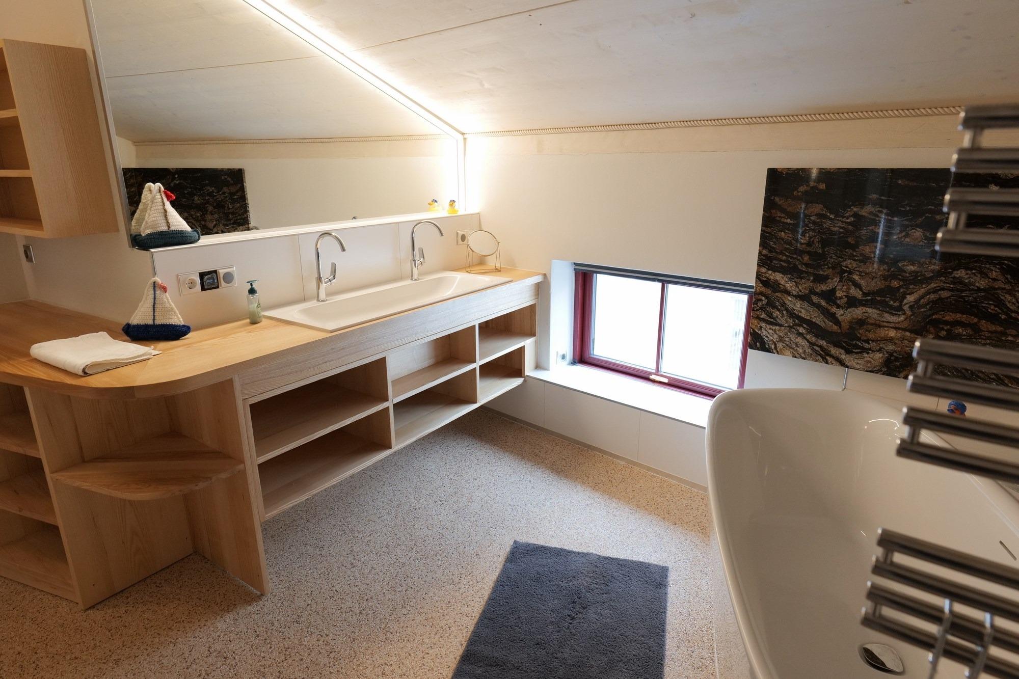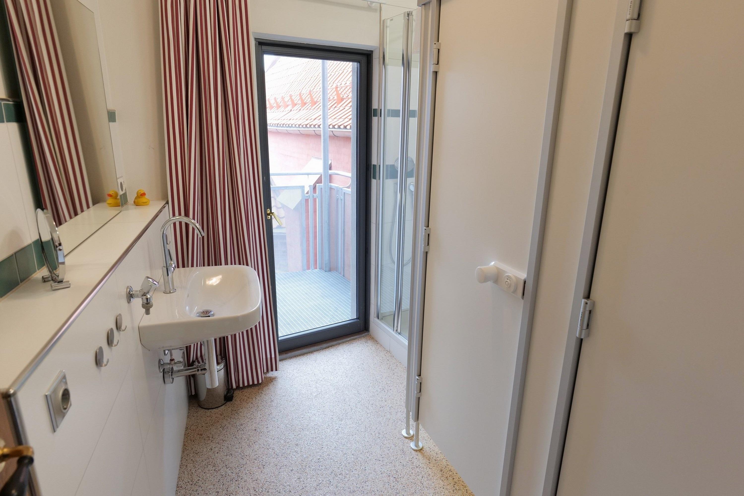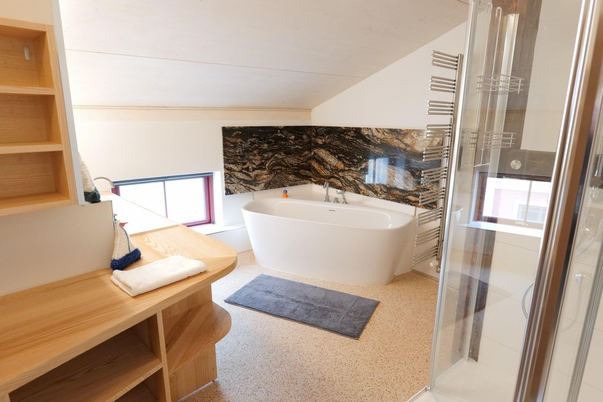 - Badezimmer mit Badewanne, Dusche, WC, Waschmaschine