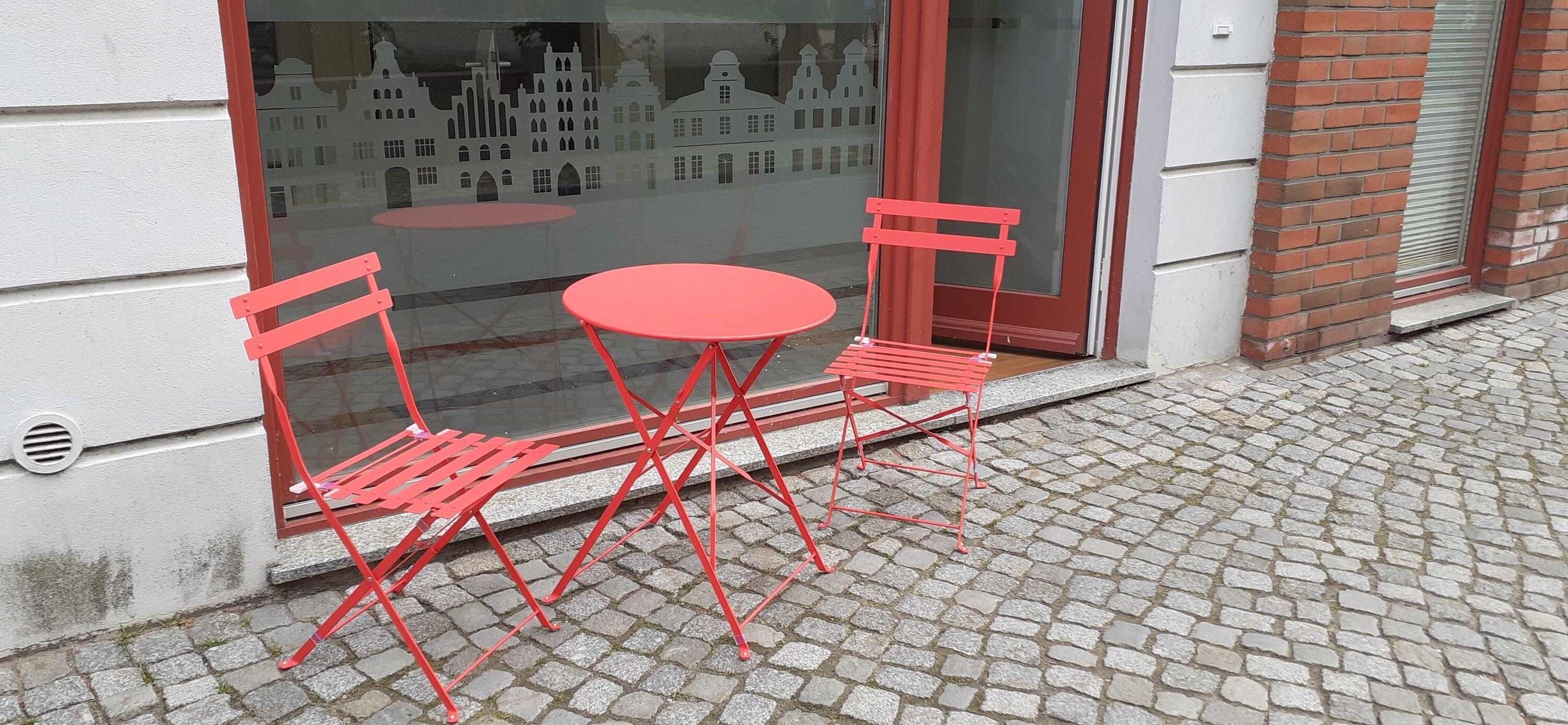 - Sitzmöglichkeit (2 Stühle + Tisch) vor der Wohnung mit Blick auf St. Nikolai und die Frische Grube. Bitte immer reinstellen nach Benutzung. Danke!