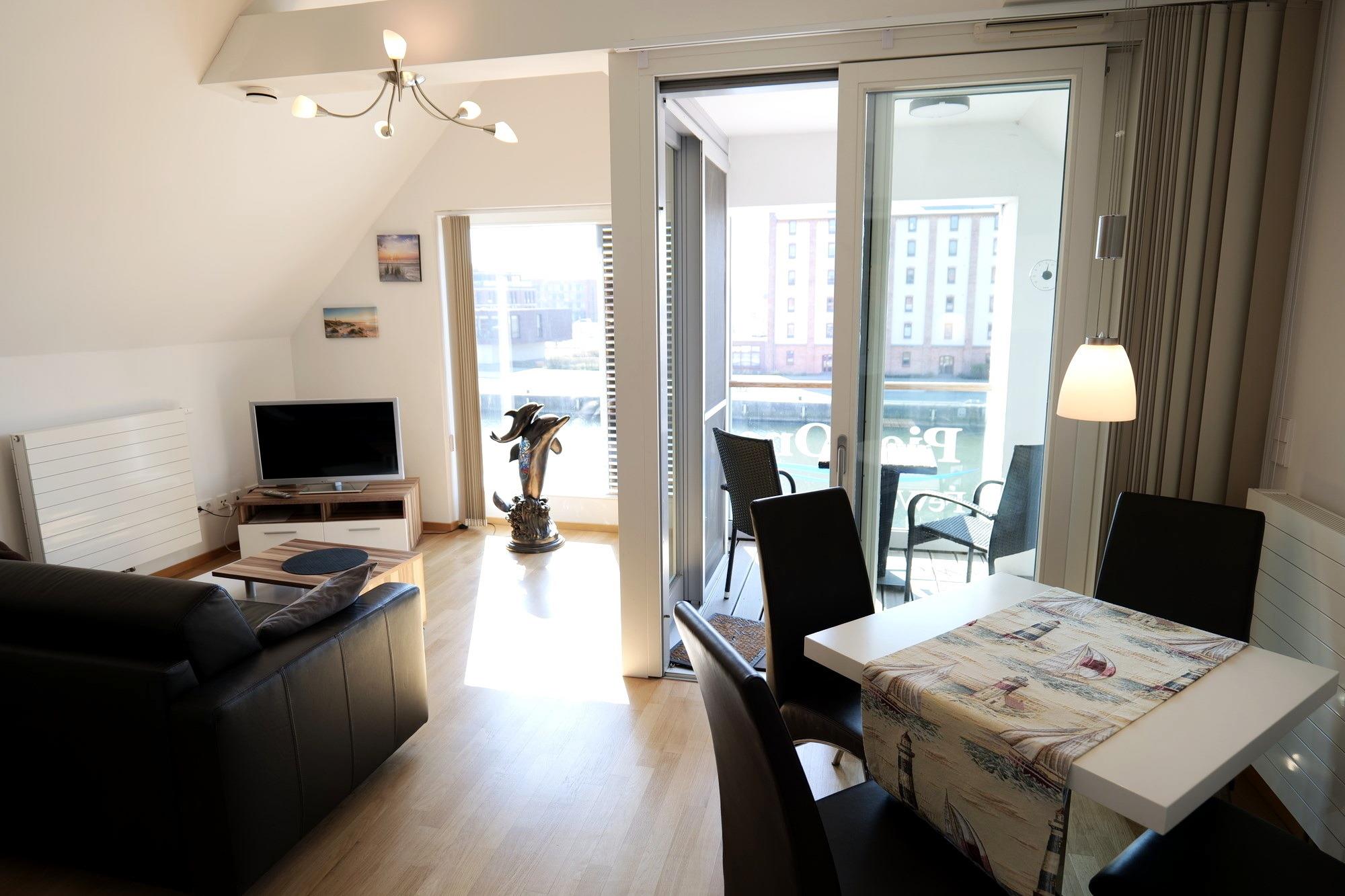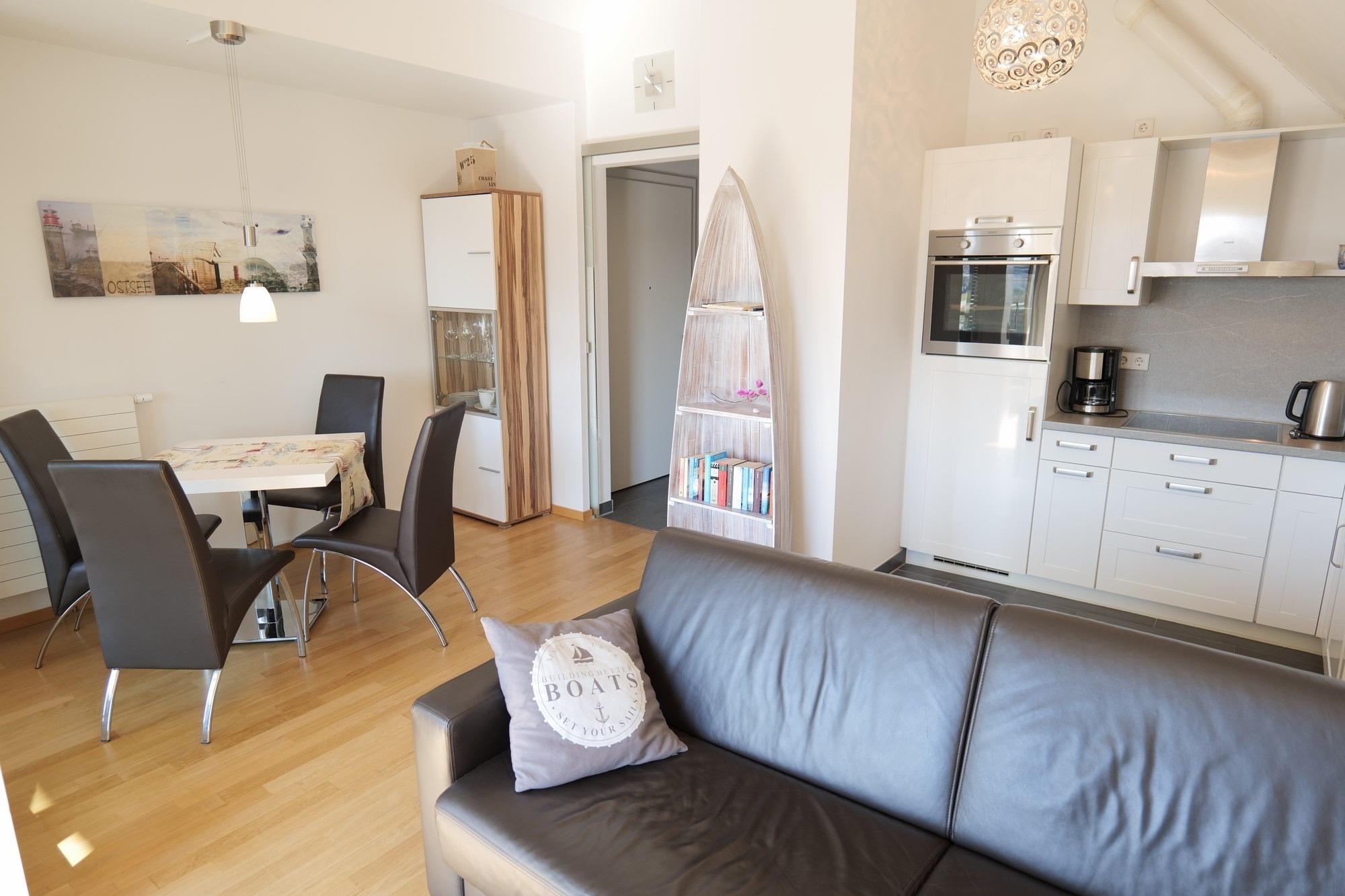 Das moderne Appartement bietet Ihnen auf 52 qm Platz für 2 bis 4 Personen jeglichen Alters. Es besteht aus einem Wohnbereich mit offener Küche, einem Schlafzimmer sowie einem modern gestalteten Bad mit Duschecke (ebenerdig). Vom Wohnbereich betreten Sie eine Loggia, in der Sie das maritime Flair hautnah im Freien genießen können. Hier beobachten Sie, wie die Fischer ihren Fang anlanden, das bunte Treiben auf den Traditionsseglern oder genießen einfach nur den Sonnenuntergang in der Wismar Bucht.