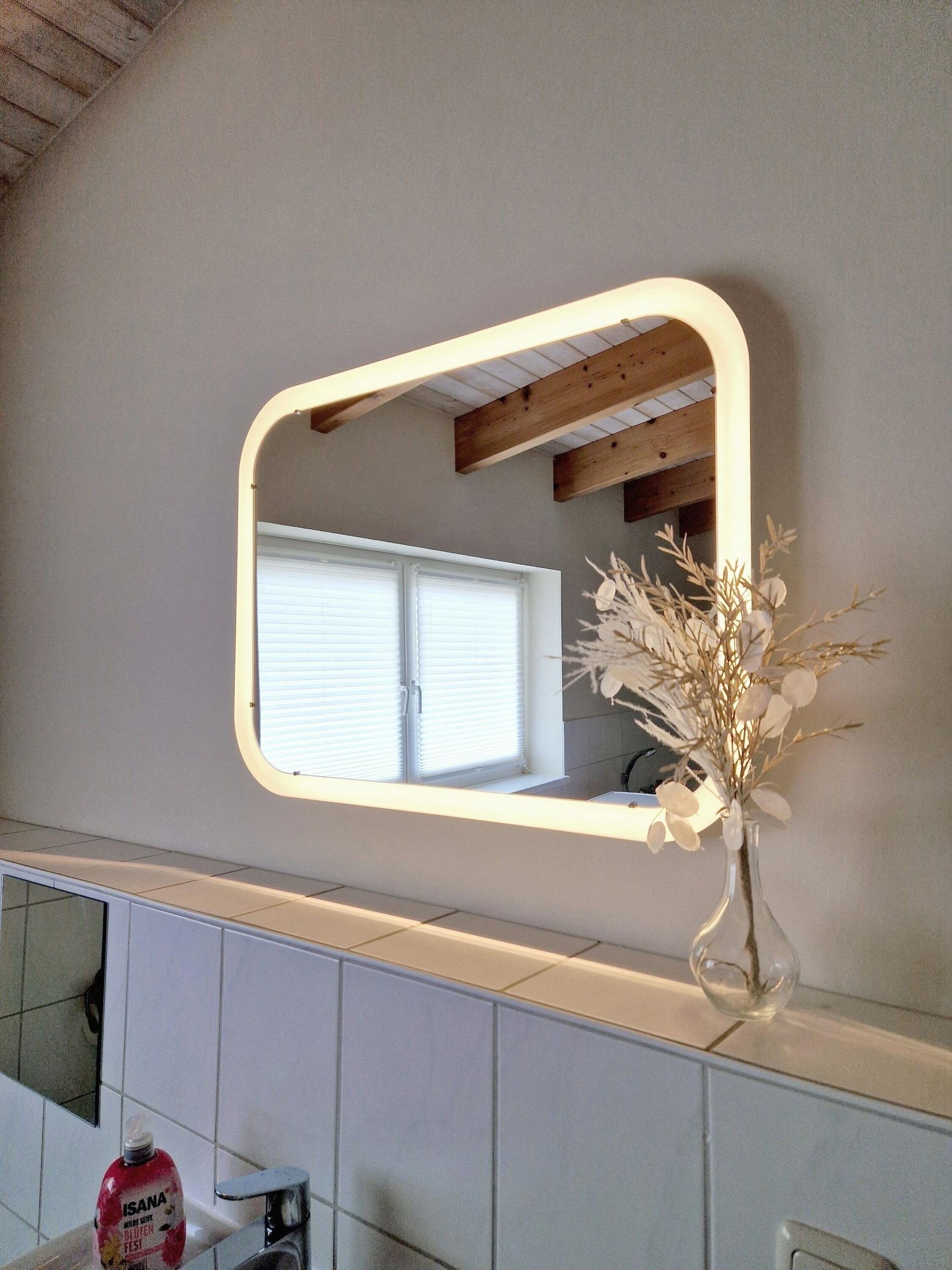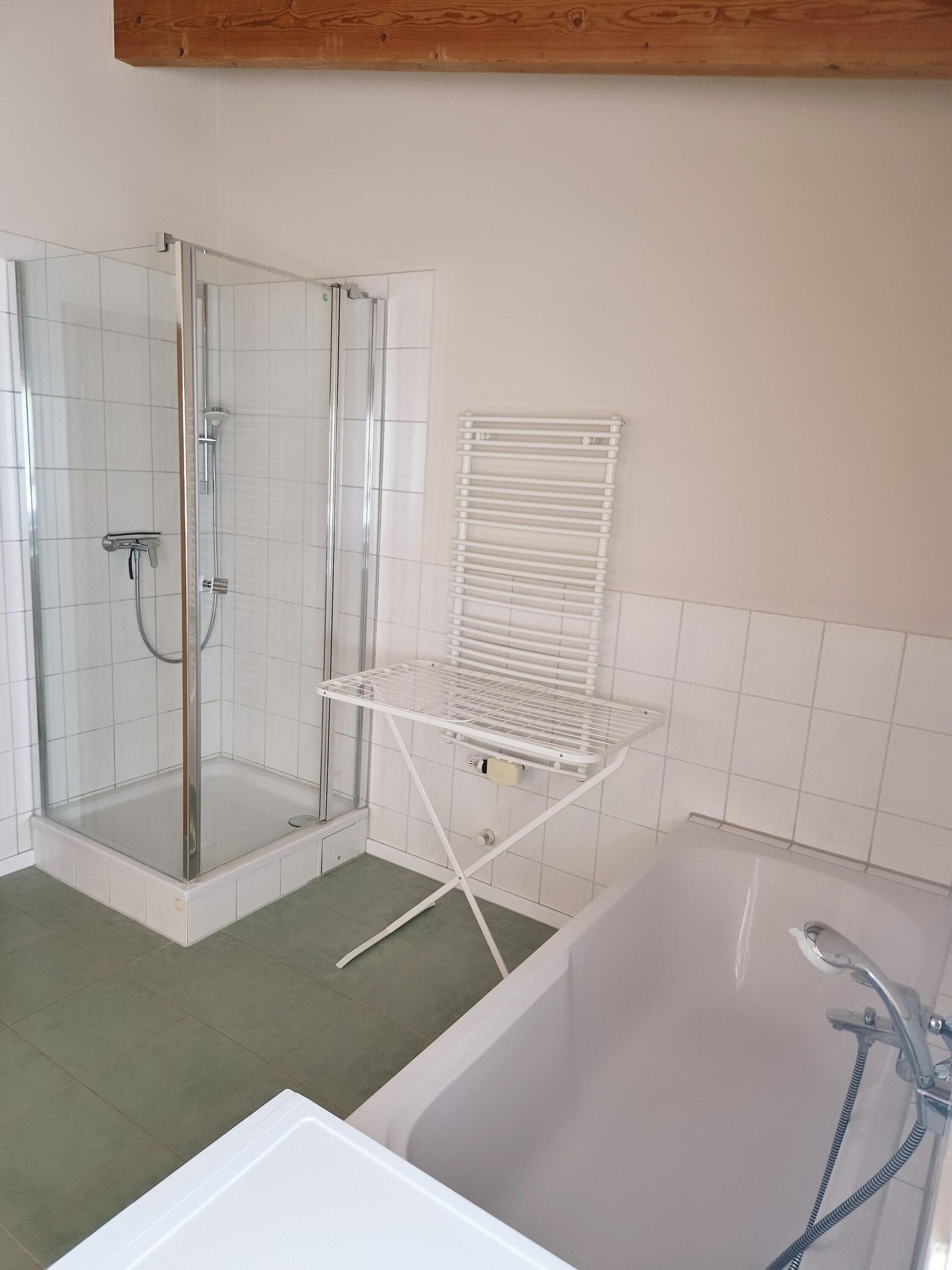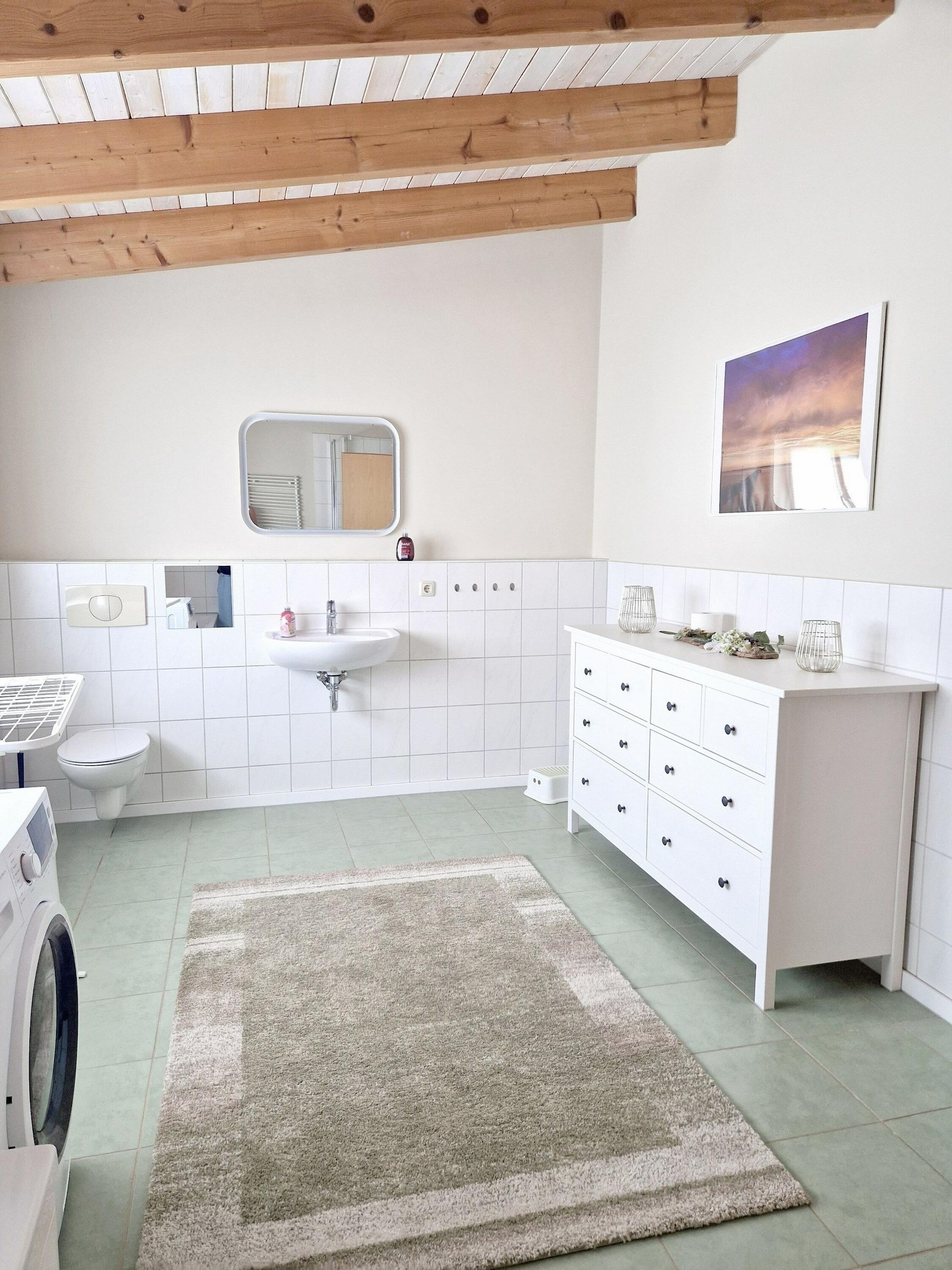 - Badezimmer mit Badewanne und Dusche, WC, Spiegelschrank, Waschmaschine und Wäscheständer