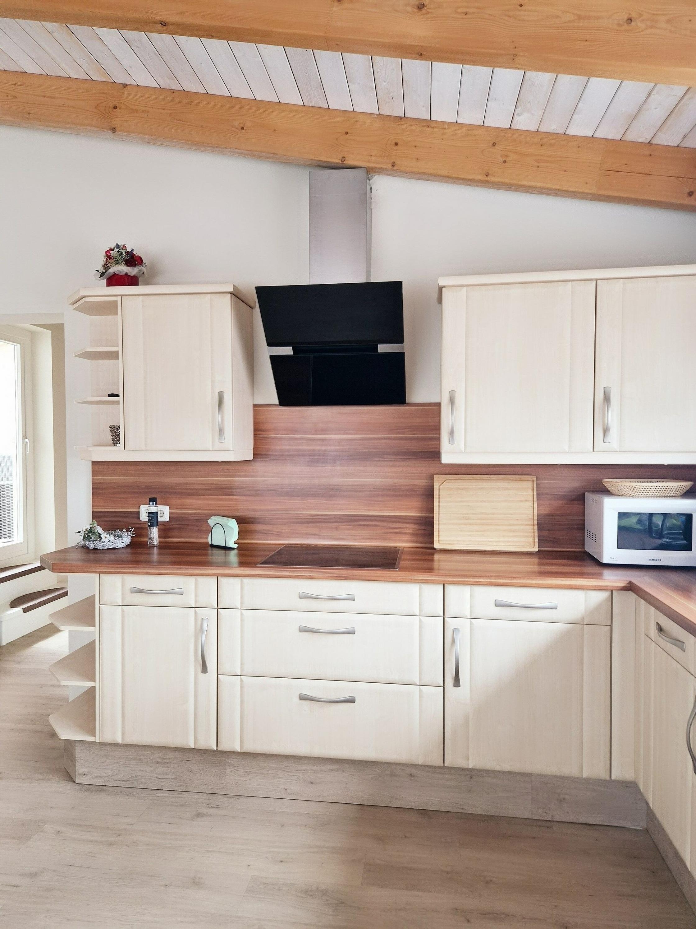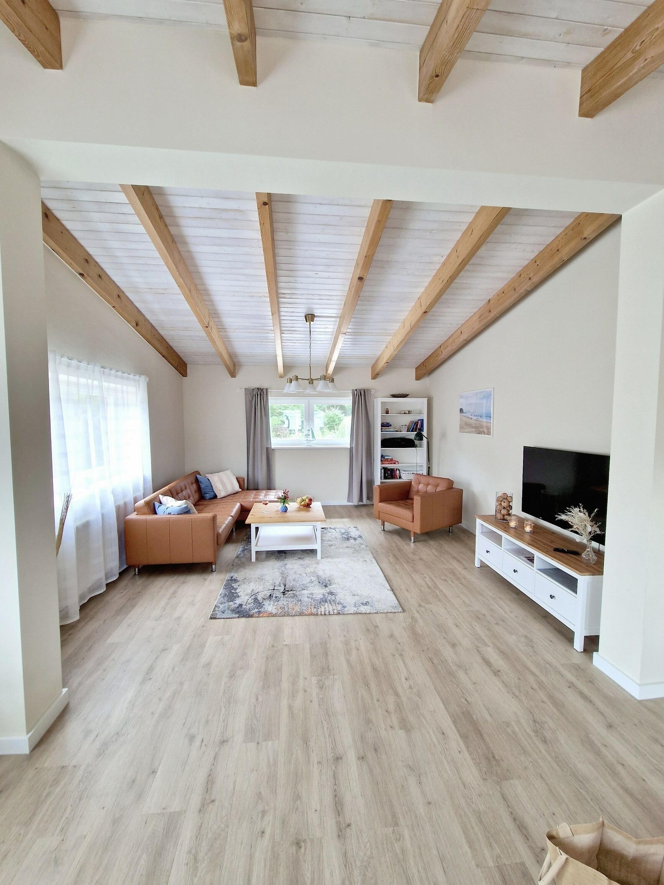 - großes Wohnzimmer (Sofa, Tisch, TV) mit offener Küche (vollausgestattet u.a. mit Geschirrspüler, Backofen, Ceranfeld, Kaffeemaschine, Geschirr, Besteck, Gläser, Kühlschrank u. v. m.), sowie Essbereich für 4 Personen