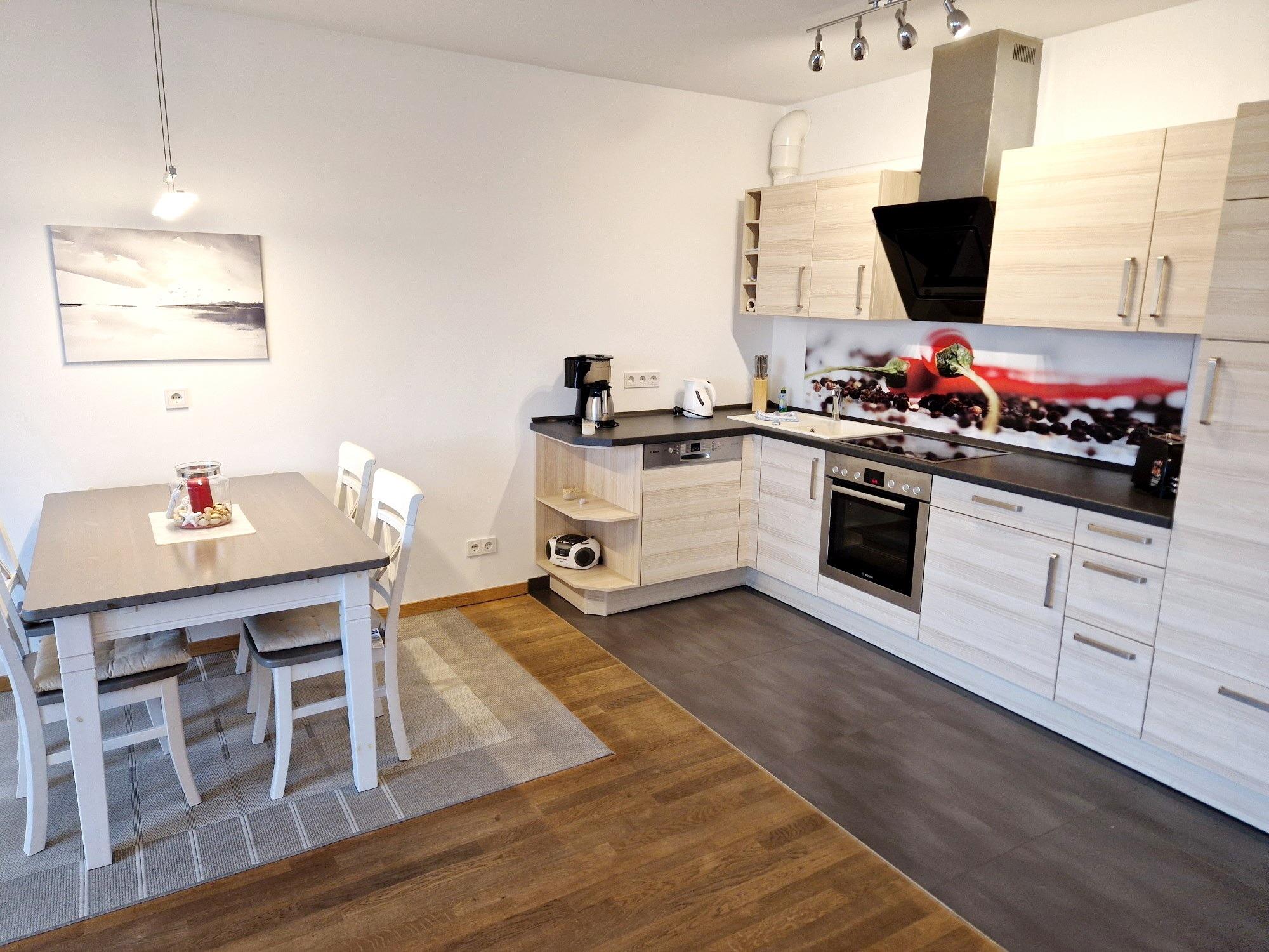 - Im Wohnzimmer integrierte Einbauküche mit: Geschirrspüler, 4-Kochfelder-Herd, Backofen, Wasserkocher, Kaffeemaschine, Kühlschrank mit Gefrierfach