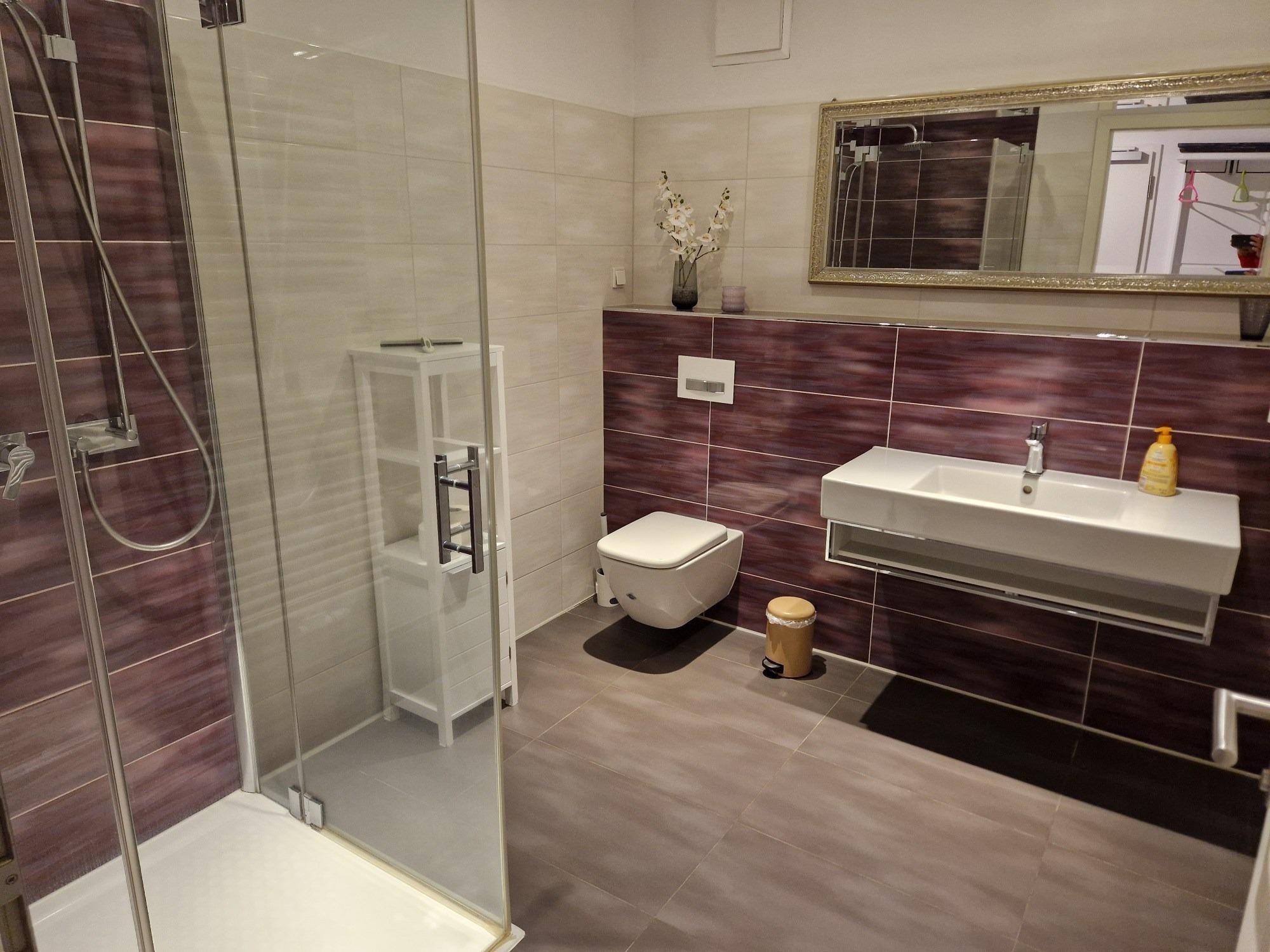 - Das Bad mit Abluftsystem verfügt über einen nahezu ebenerdigen Duschbereich 100x100 und thermostatgeregelter Duschbrause sowie Tropendusche, Handtuchtrockner und großem Spiegel