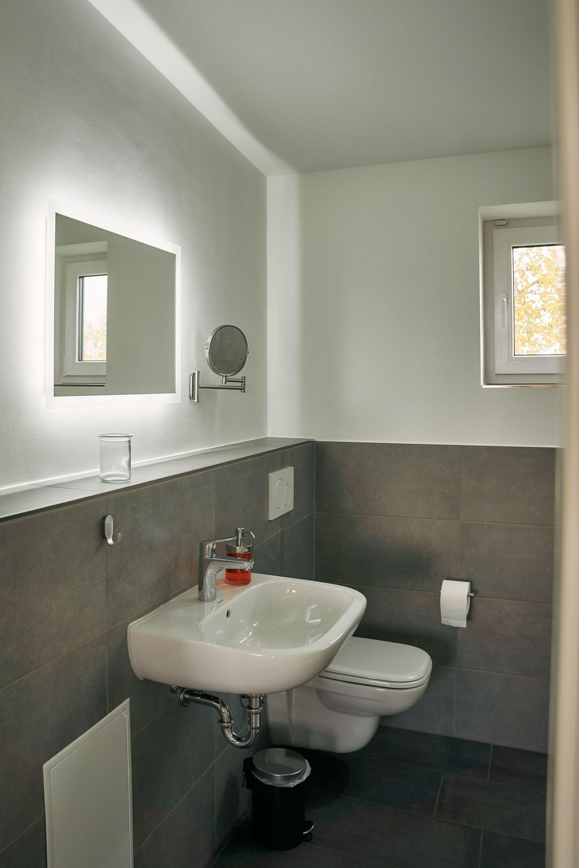 - bodenebene Dusche (90 x 1,20m), WC, Spiegel, Kosmetikspiegel und Ablage