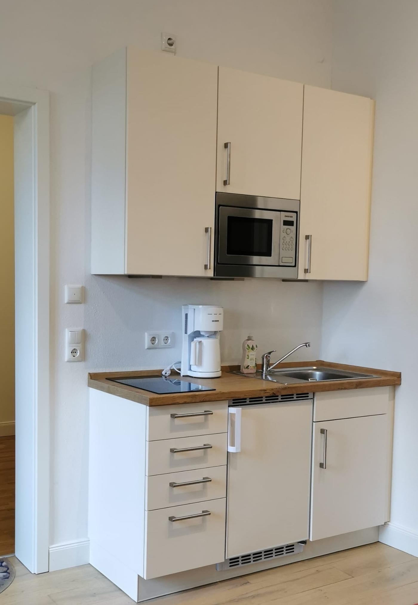 - Pantryküche mit Mikrowelle, 2-Platten-Induktionsherd, Geschirr, Besteck, Töpfe usw.
