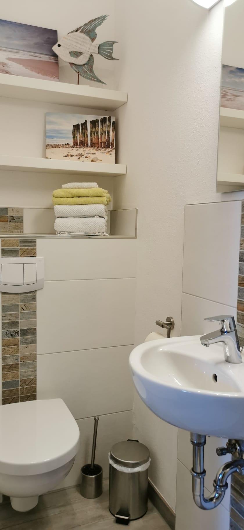 - 1 Bad mit Dusche / WC, Handtuchhalter, Spiegel, Ablage, Fön
