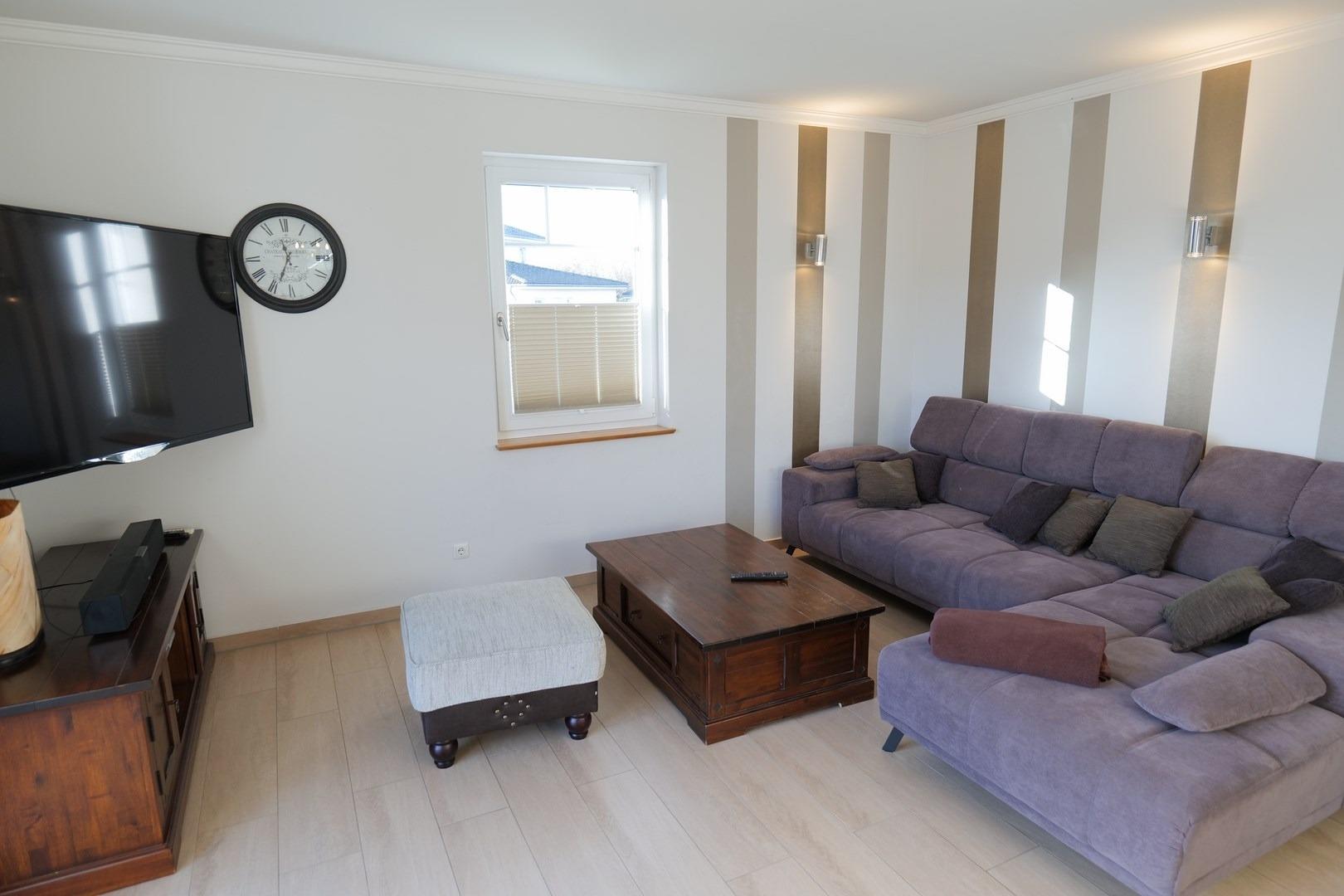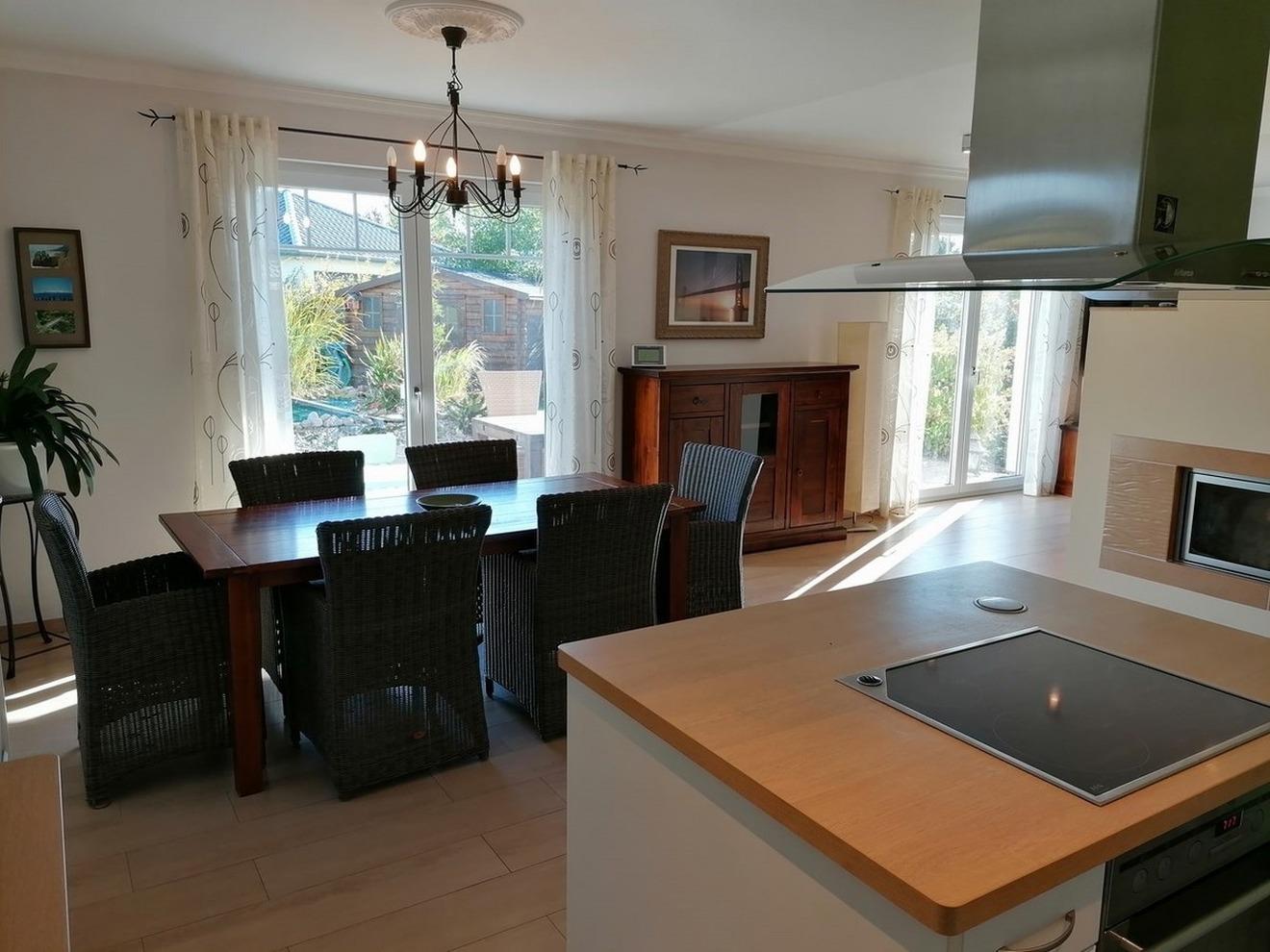 - großes Wohnzimmer (TV, Soundanlage, Kamin) mit offener Küche (u.a. Vier-Plattenherd, Backofen, Wasserkocher, Kaffeemaschine, Kühlschrank, Geschirrspüler, Kochinsel) und Essbereich